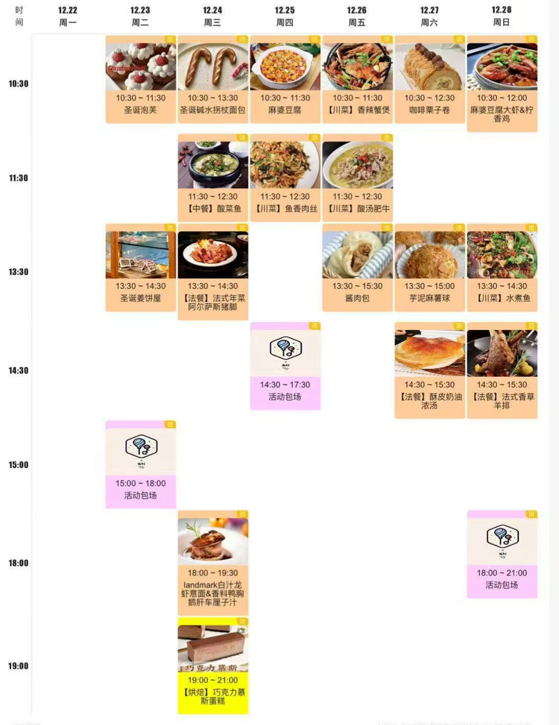 部分菜单如下,每周更新菜单,任选 4 次课,可复购,不同课程时长不同,每次时长有 1h、1.5h、2h 不等