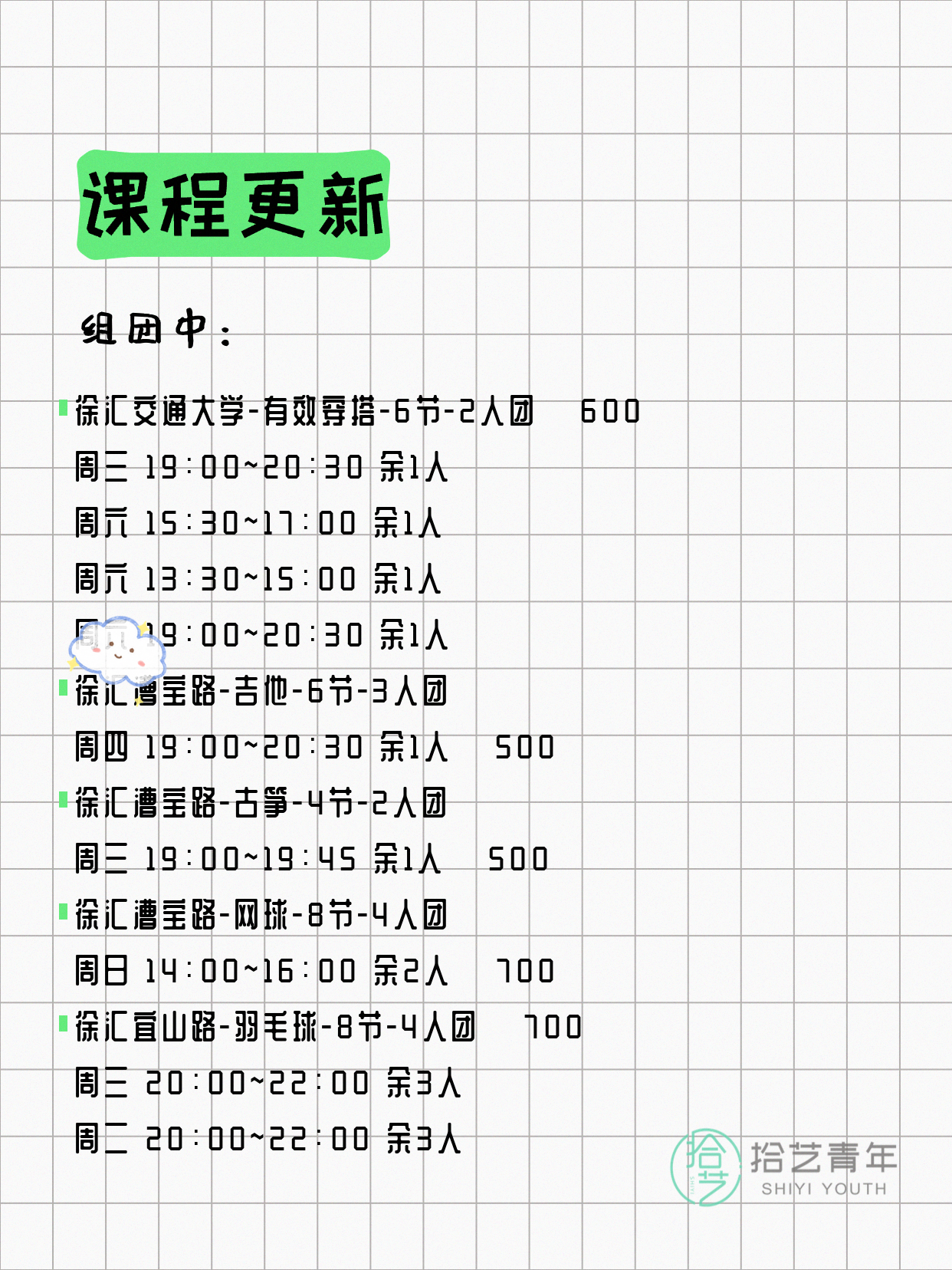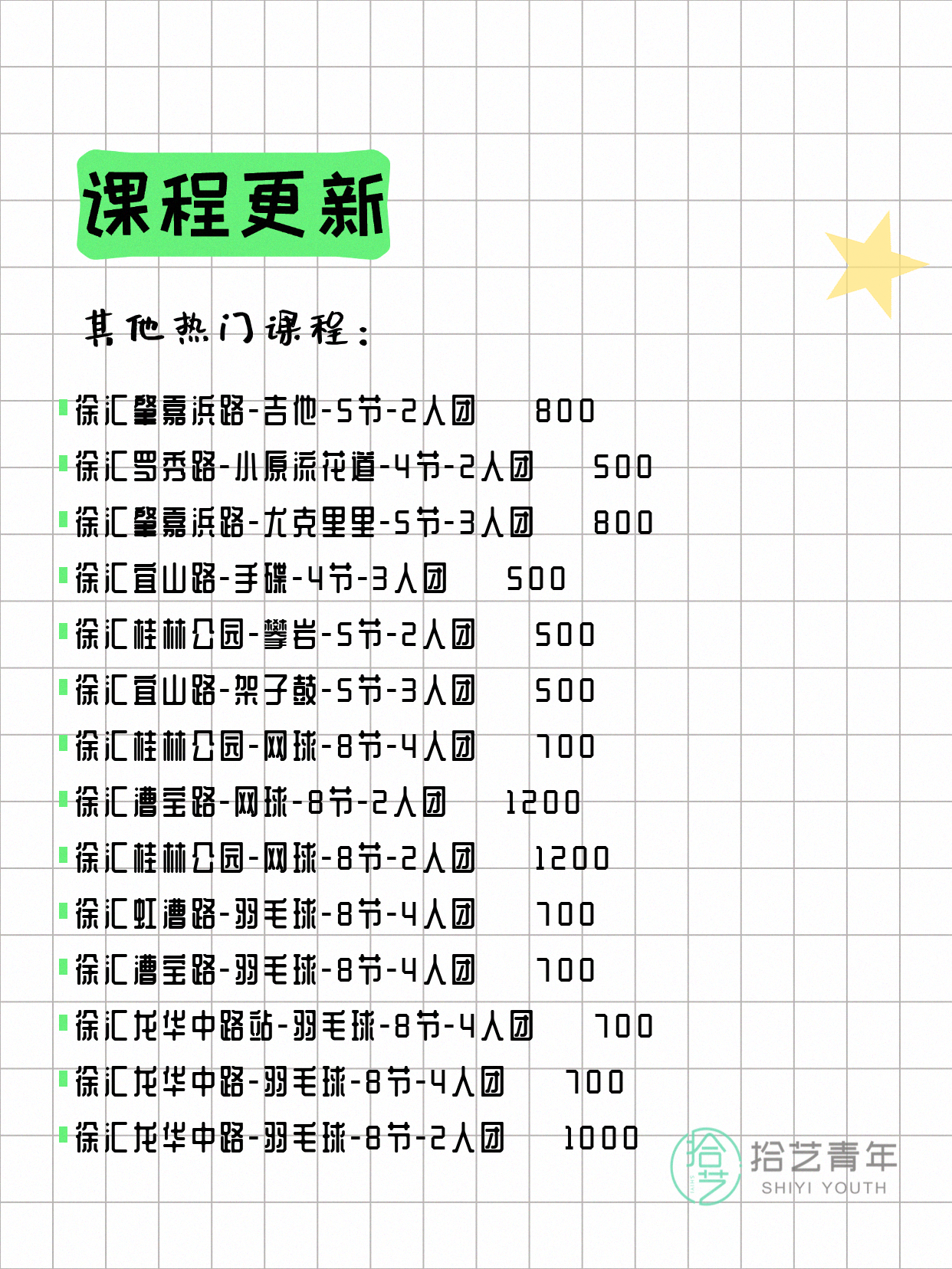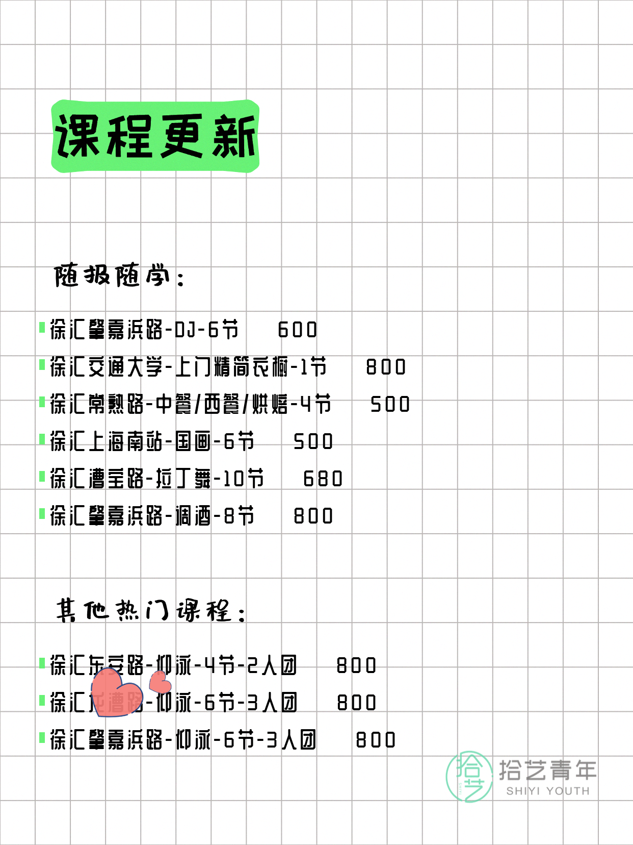 💡 提示:以上课程信息来自拾艺青年小程序,课程可能随报名动态变化,具体以小程序实时信息为准。