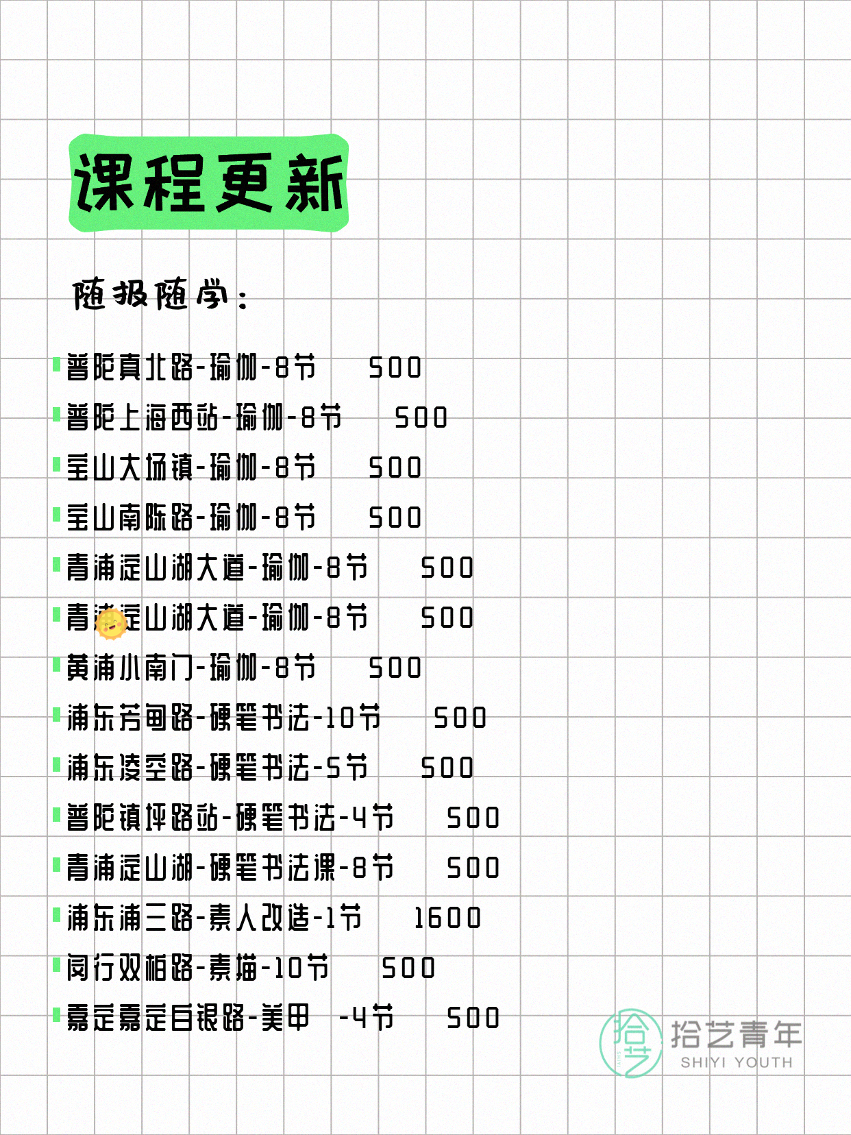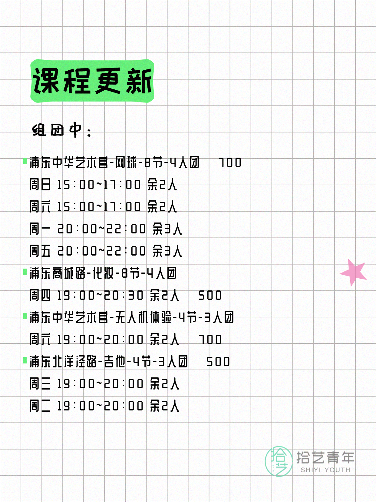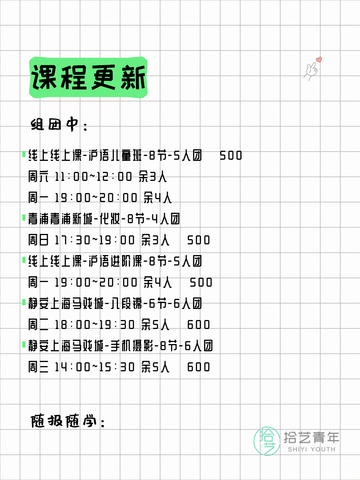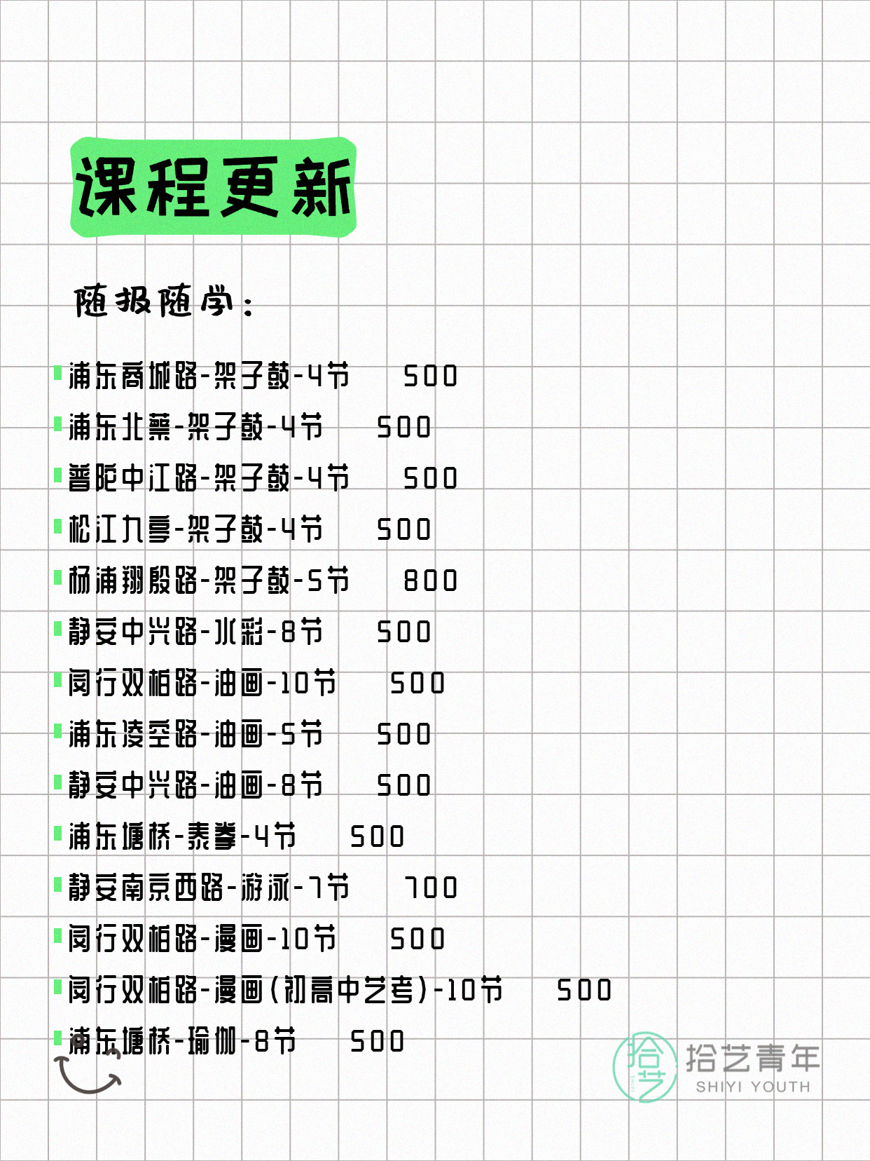 资讯>综合>正文4月13日上海夜校课程合集拾艺青年2026-04-131 / 17📊 本期课程概况• 总课程数:412门• 组团中课程:72门• 覆盖区域:15个区详见图片,欢迎报名咨询。💡 提示:以上课程信息来自拾艺青年小程序,课程可能随报名动态变化,具体以小程序实时信息为准。👉 微信小程序链接:#小程序://拾艺青年/WmfwH22mnQUxZwb