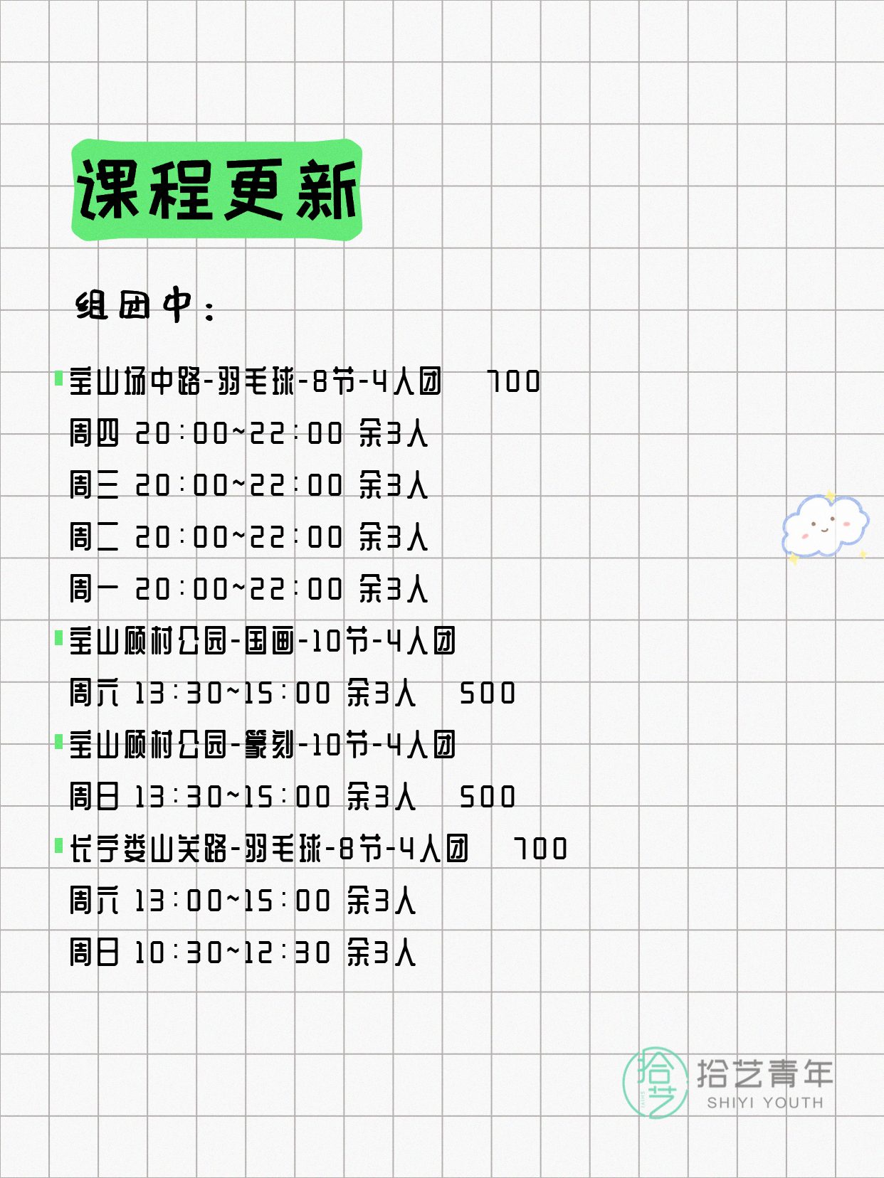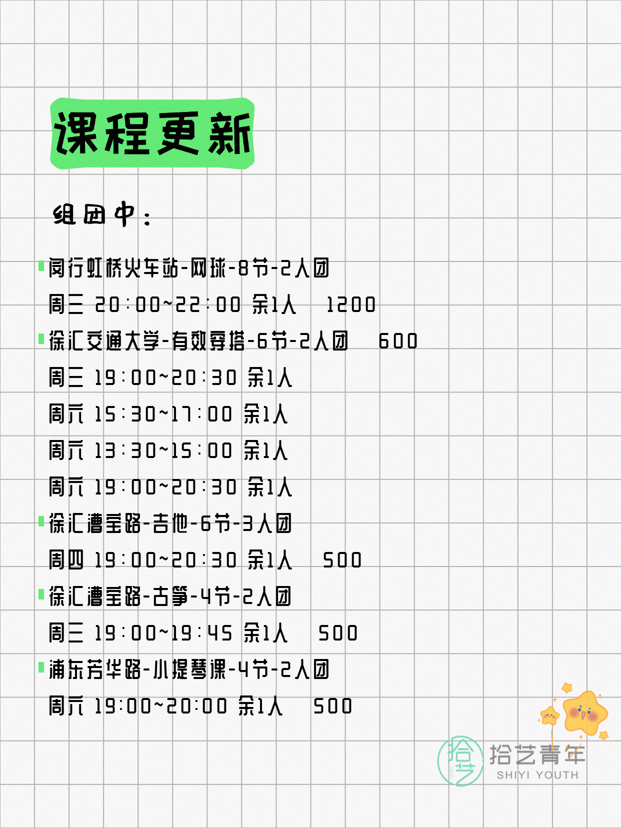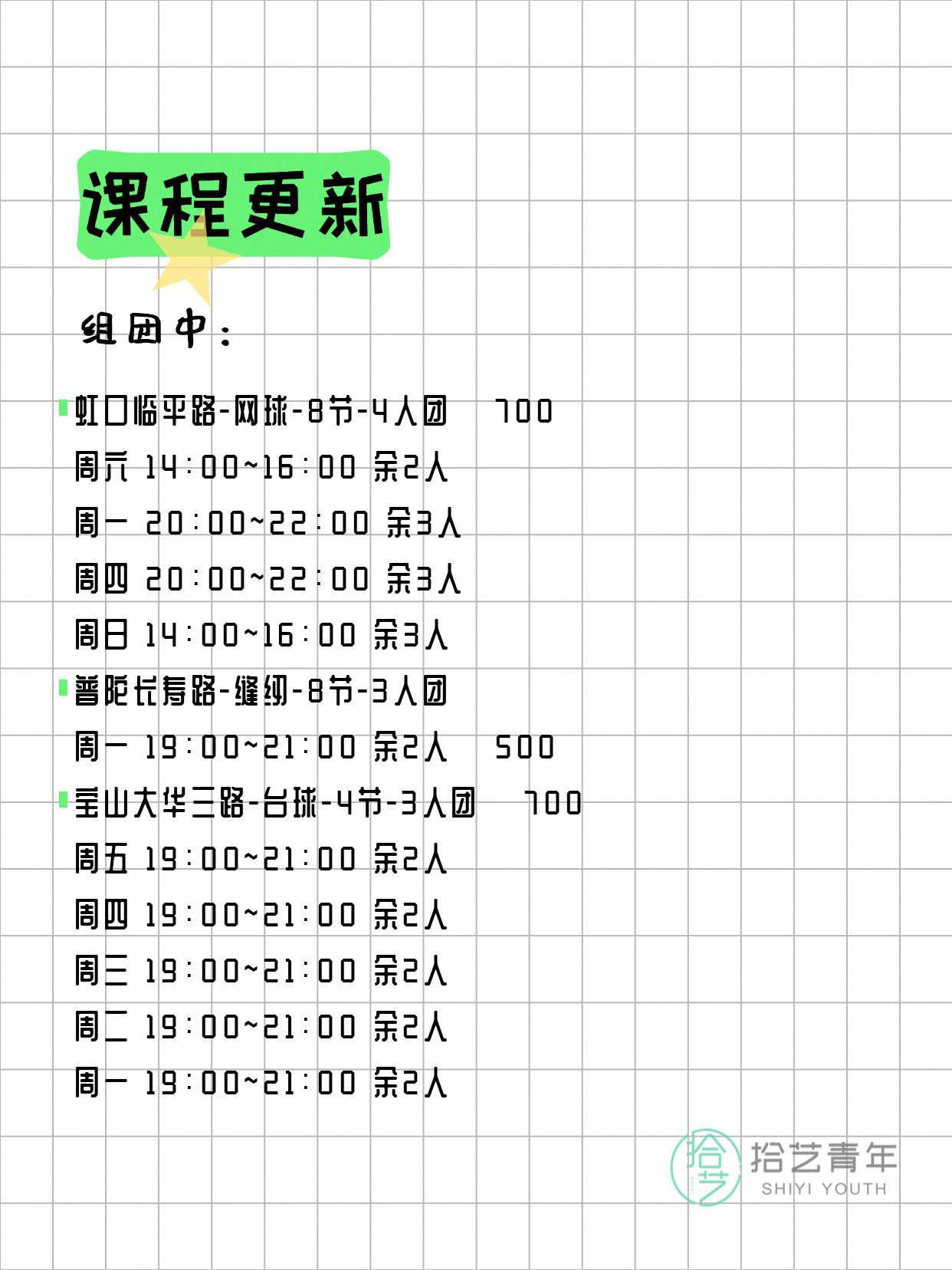 资讯>综合>正文4月13日上海夜校课程合集拾艺青年2026-04-131 / 17📊 本期课程概况• 总课程数:412门• 组团中课程:72门• 覆盖区域:15个区详见图片,欢迎报名咨询。💡 提示:以上课程信息来自拾艺青年小程序,课程可能随报名动态变化,具体以小程序实时信息为准。👉 微信小程序链接:#小程序://拾艺青年/WmfwH22mnQUxZwb