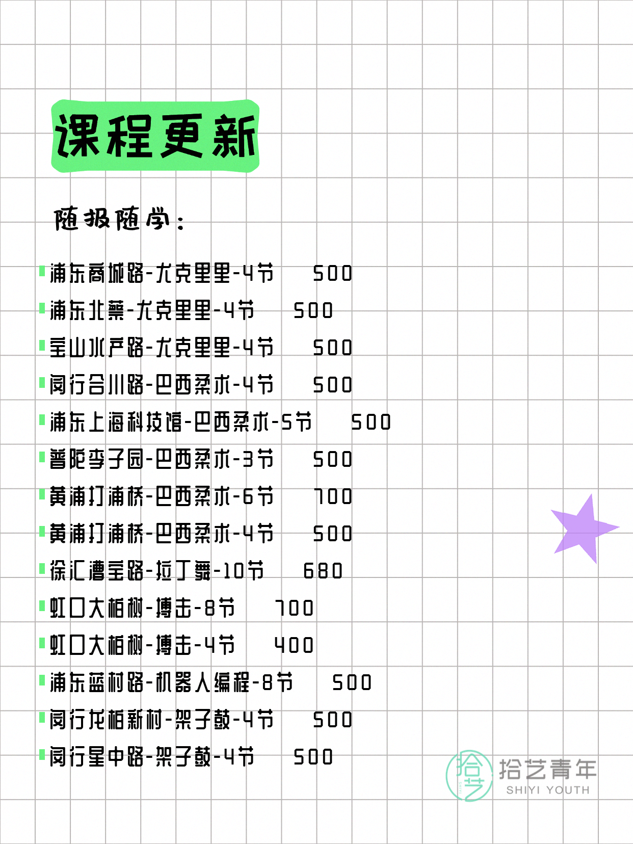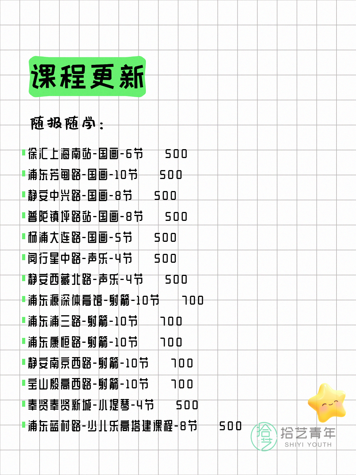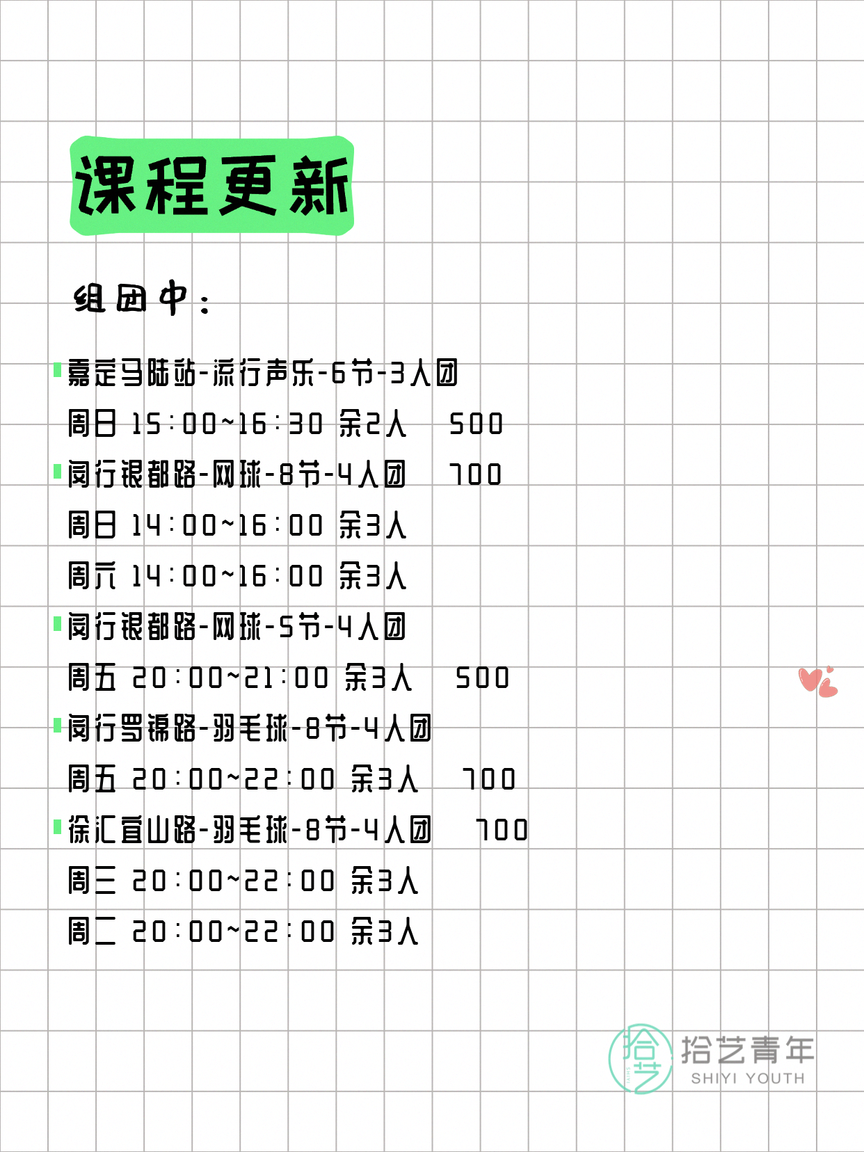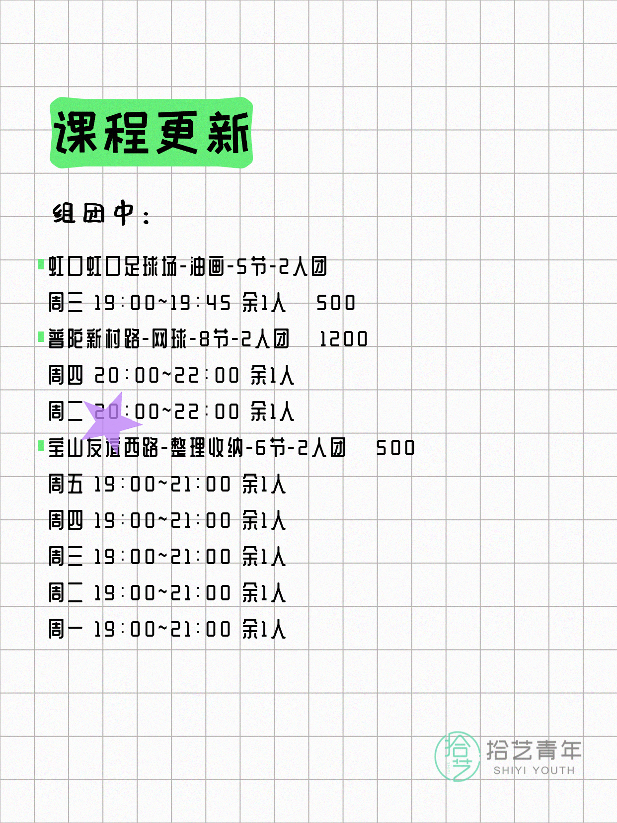 资讯>综合>正文4月13日上海夜校课程合集拾艺青年2026-04-131 / 17📊 本期课程概况• 总课程数:412门• 组团中课程:72门• 覆盖区域:15个区详见图片,欢迎报名咨询。💡 提示:以上课程信息来自拾艺青年小程序,课程可能随报名动态变化,具体以小程序实时信息为准。👉 微信小程序链接:#小程序://拾艺青年/WmfwH22mnQUxZwb