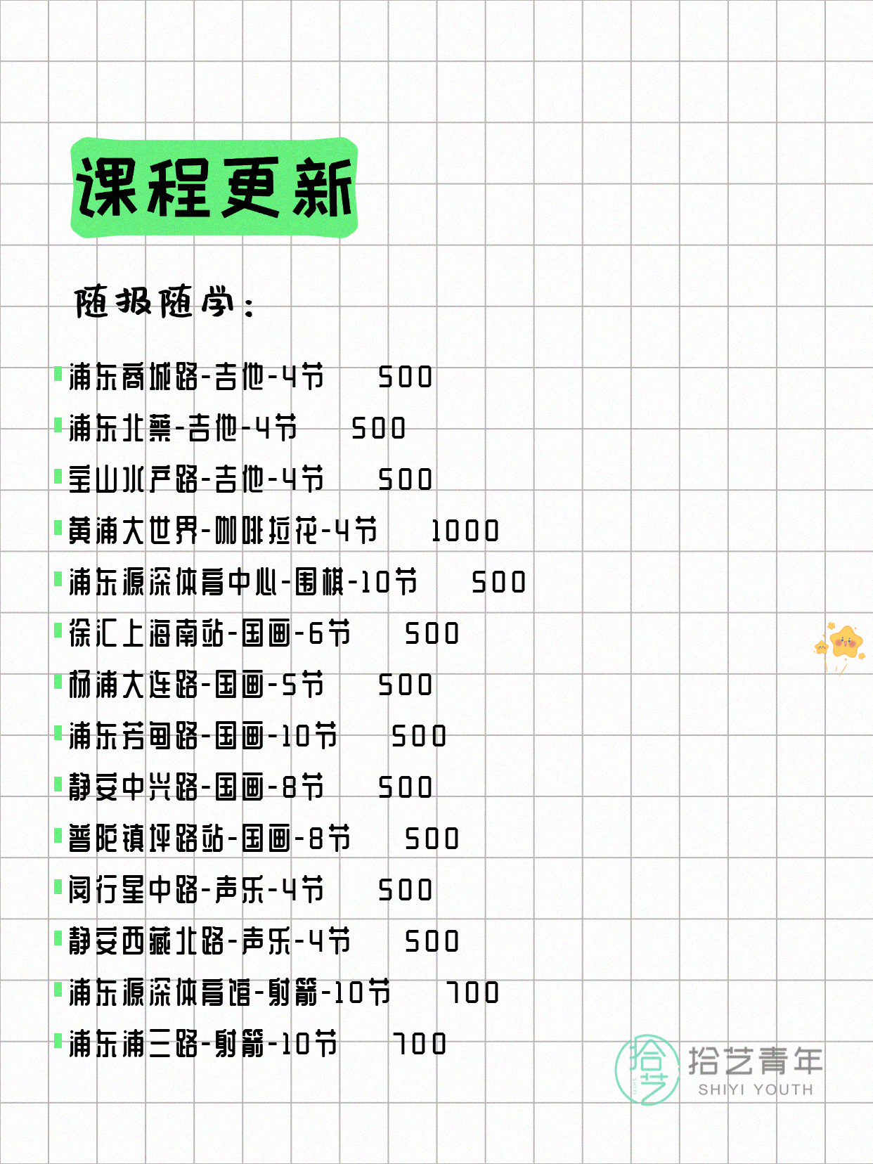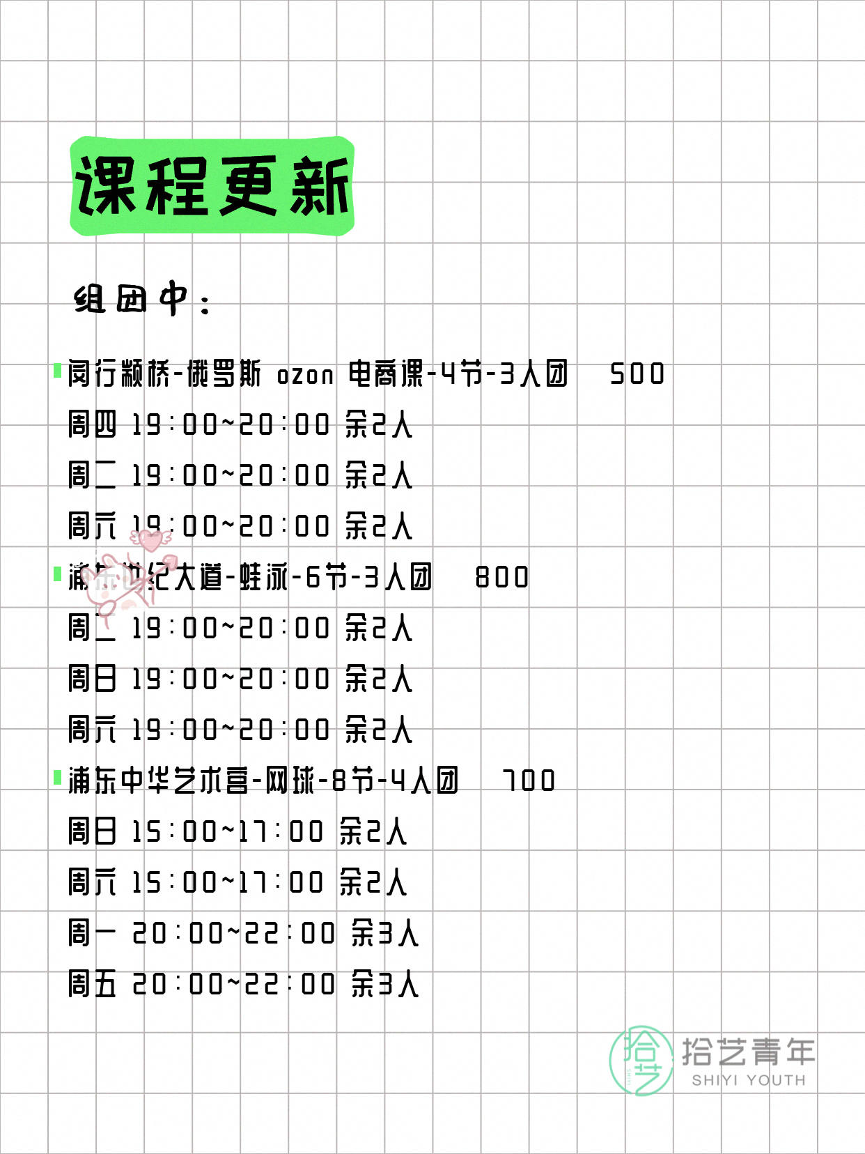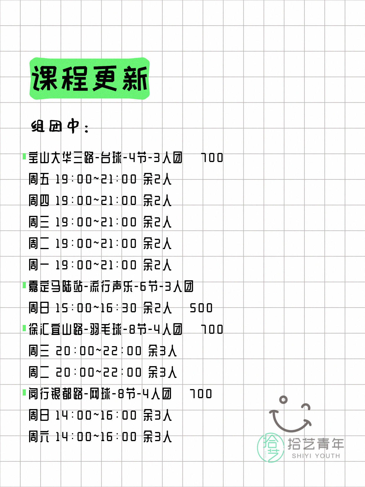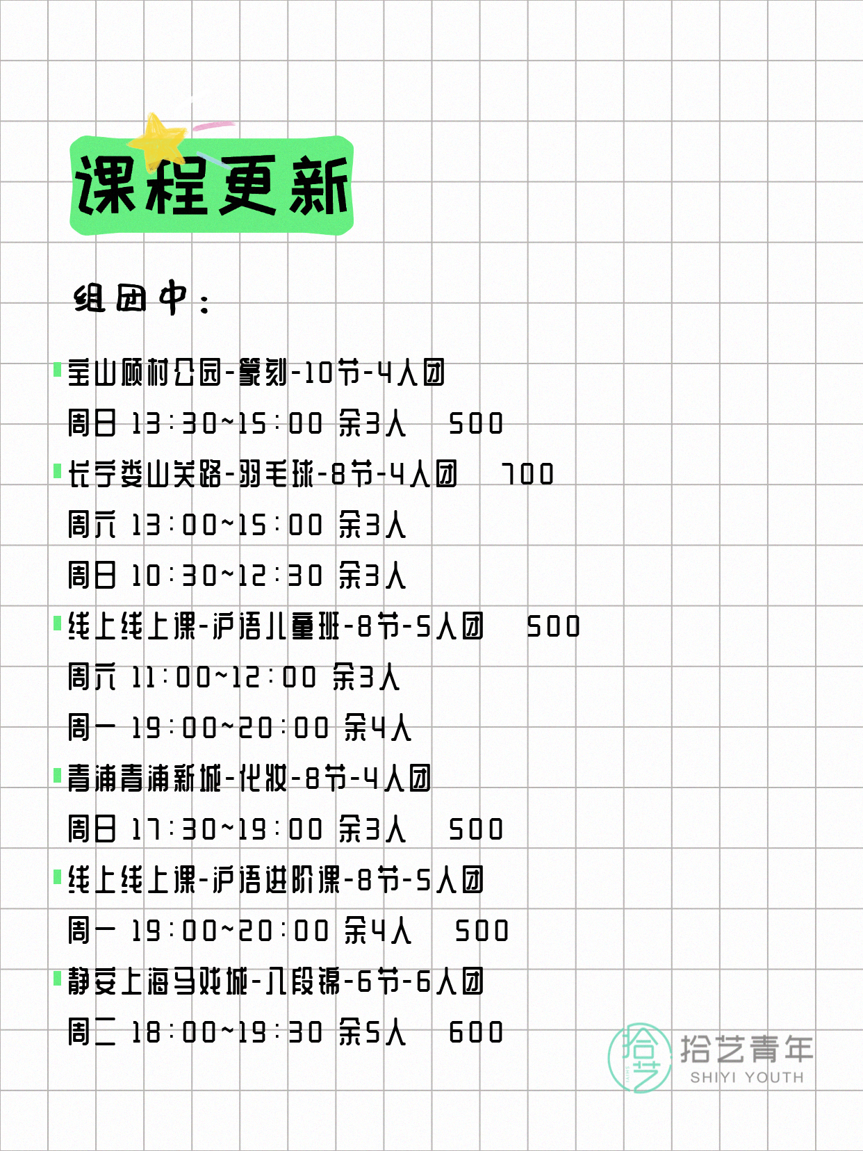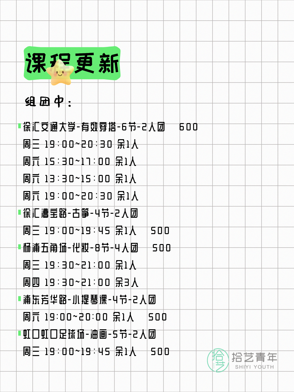 资讯>综合>正文4月14日上海夜校课程合集拾艺青年2026-04-141 / 17📊 本期课程概况• 总课程数:415门• 组团中课程:71门• 覆盖区域:15个区详见图片,欢迎报名咨询。💡 提示:以上课程信息来自拾艺青年小程序,课程可能随报名动态变化,具体以小程序实时信息为准。👉 微信小程序链接:#小程序://拾艺青年/WmfwH22mnQUxZwb