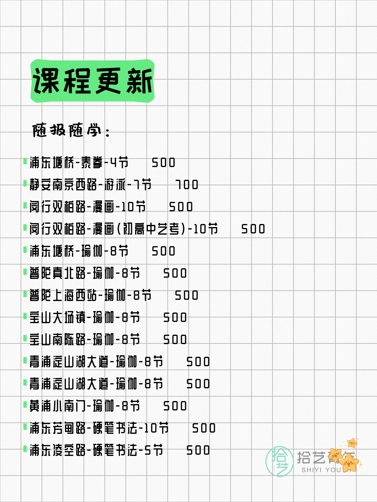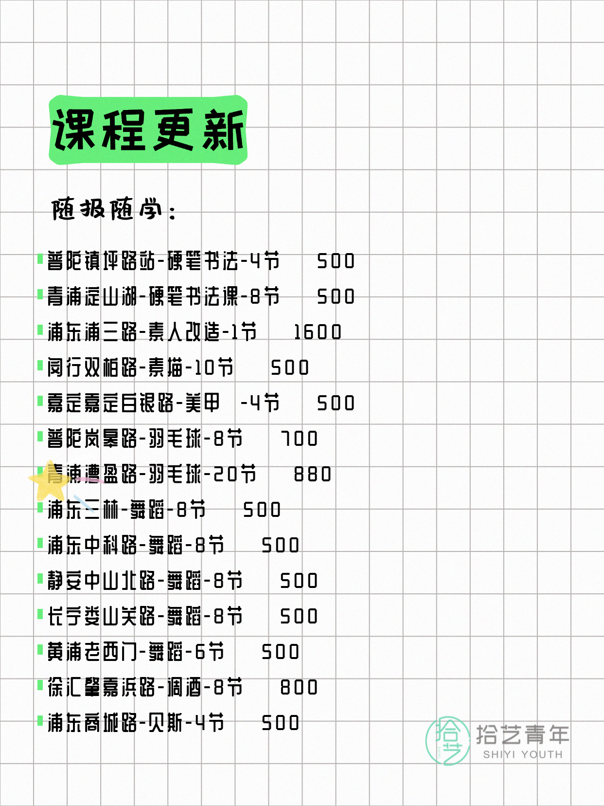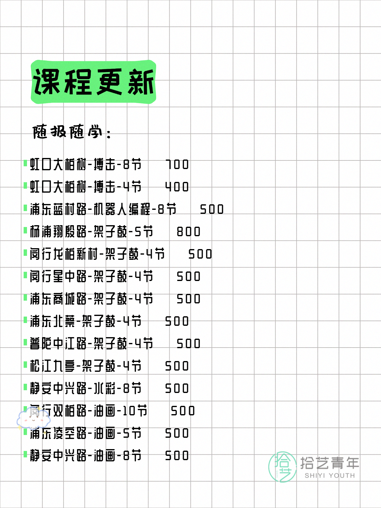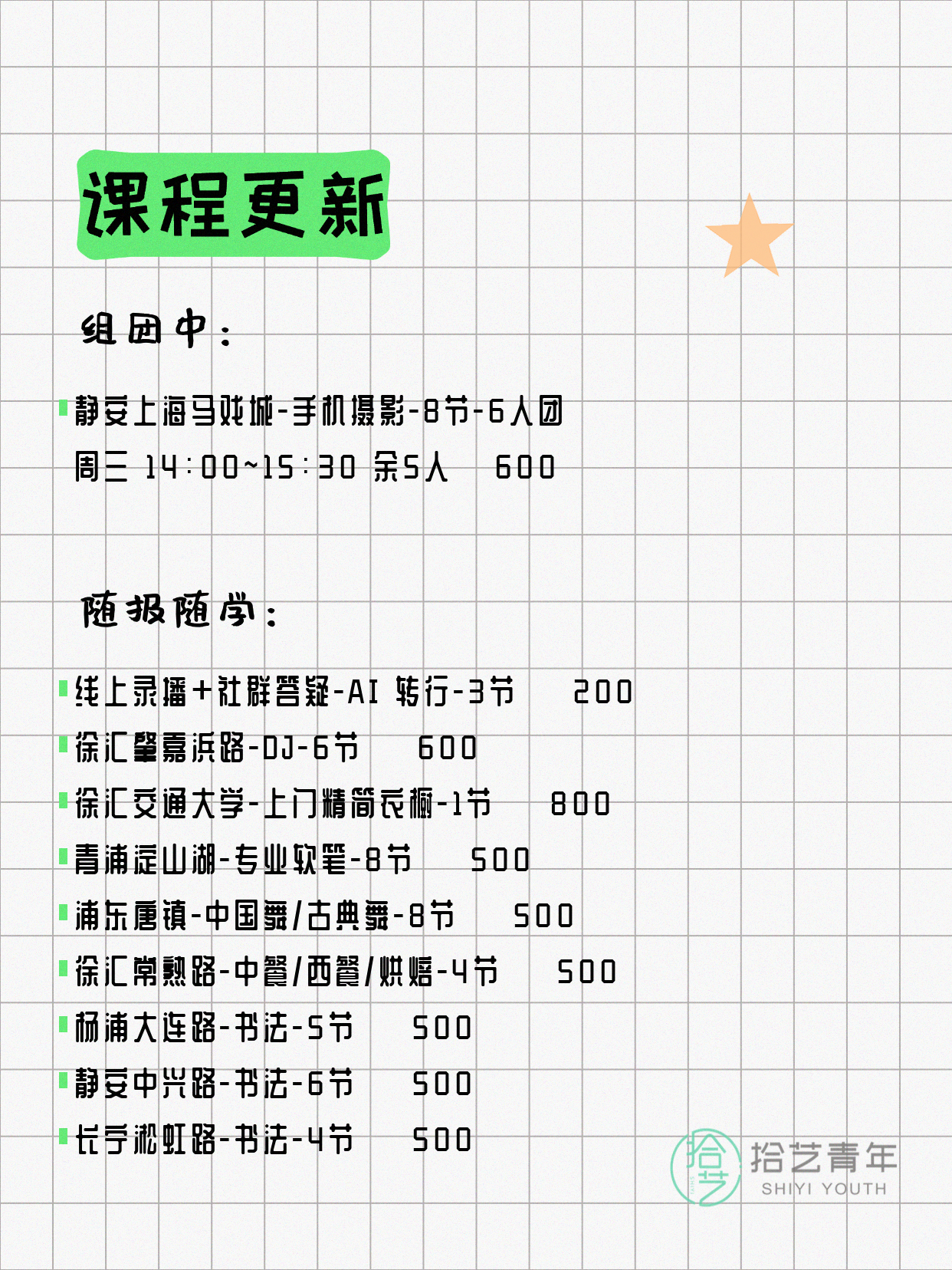 资讯>综合>正文4月14日上海夜校课程合集拾艺青年2026-04-141 / 17📊 本期课程概况• 总课程数:415门• 组团中课程:71门• 覆盖区域:15个区详见图片,欢迎报名咨询。💡 提示:以上课程信息来自拾艺青年小程序,课程可能随报名动态变化,具体以小程序实时信息为准。👉 微信小程序链接:#小程序://拾艺青年/WmfwH22mnQUxZwb