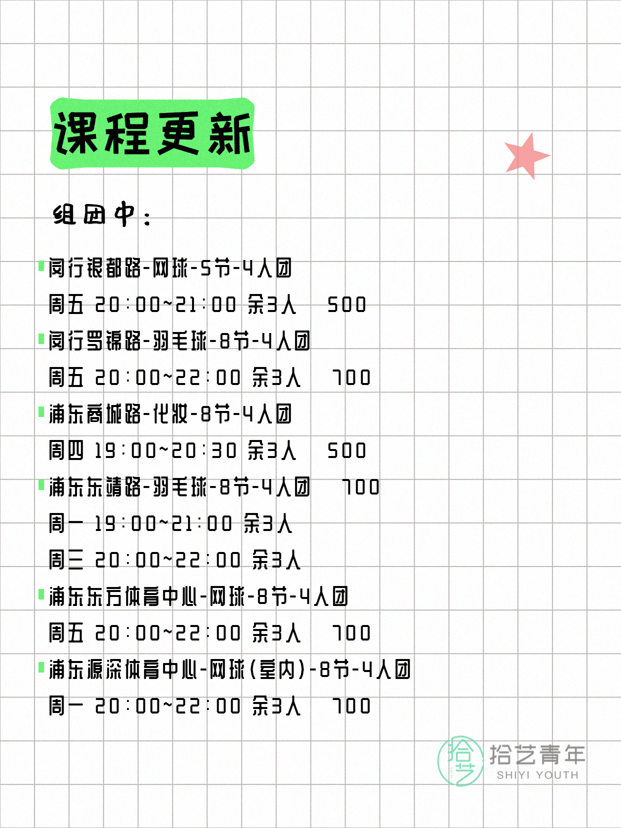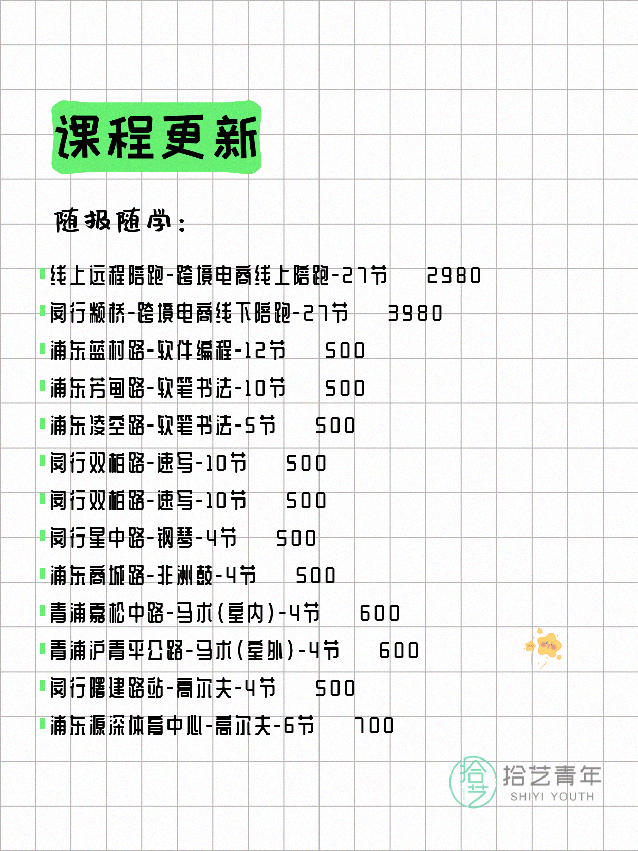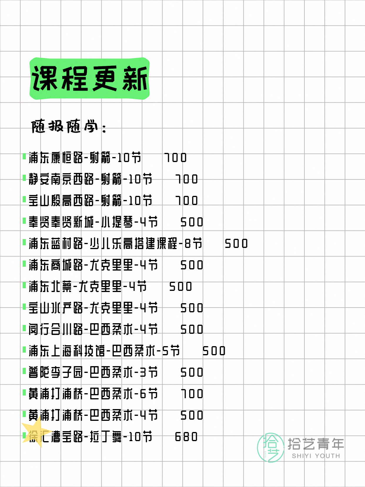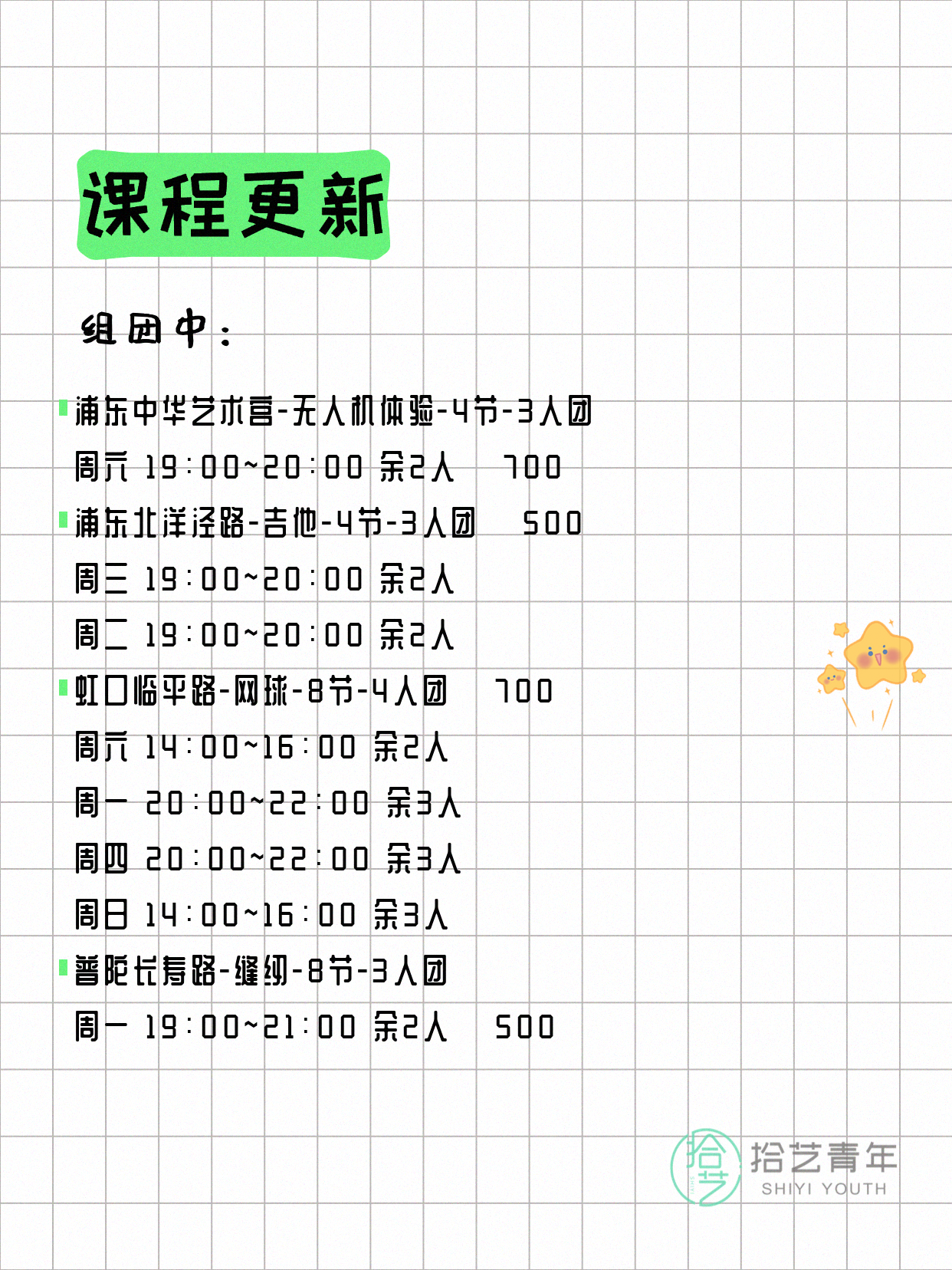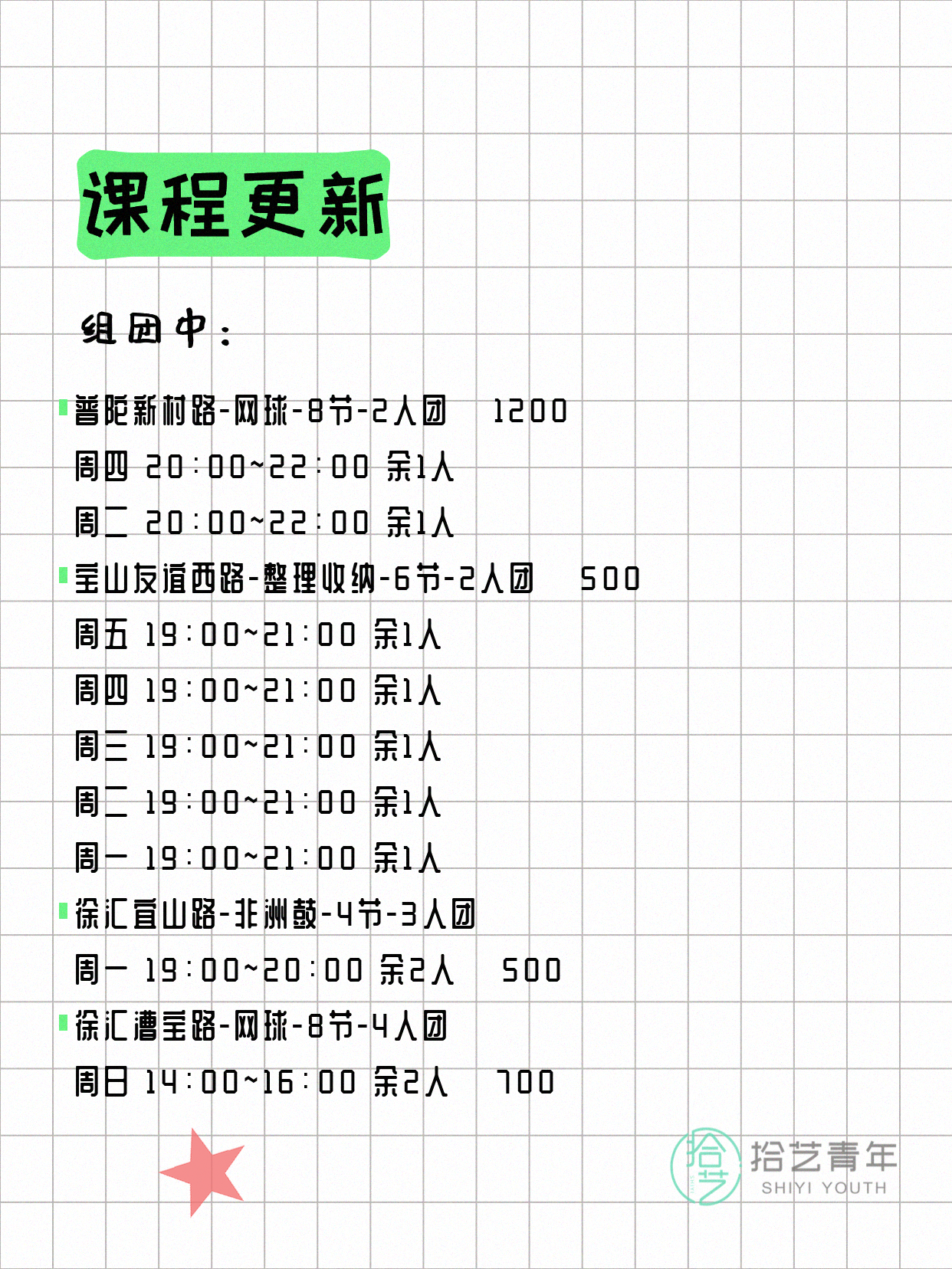 资讯>综合>正文4月14日上海夜校课程合集拾艺青年2026-04-141 / 17📊 本期课程概况• 总课程数:415门• 组团中课程:71门• 覆盖区域:15个区详见图片,欢迎报名咨询。💡 提示:以上课程信息来自拾艺青年小程序,课程可能随报名动态变化,具体以小程序实时信息为准。👉 微信小程序链接:#小程序://拾艺青年/WmfwH22mnQUxZwb