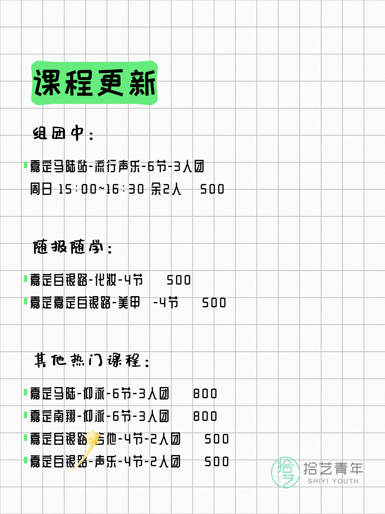 💡 提示:以上课程信息来自拾艺青年小程序,课程可能随报名动态变化,具体以小程序实时信息为准。