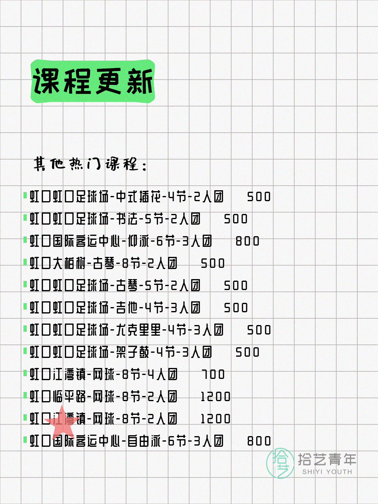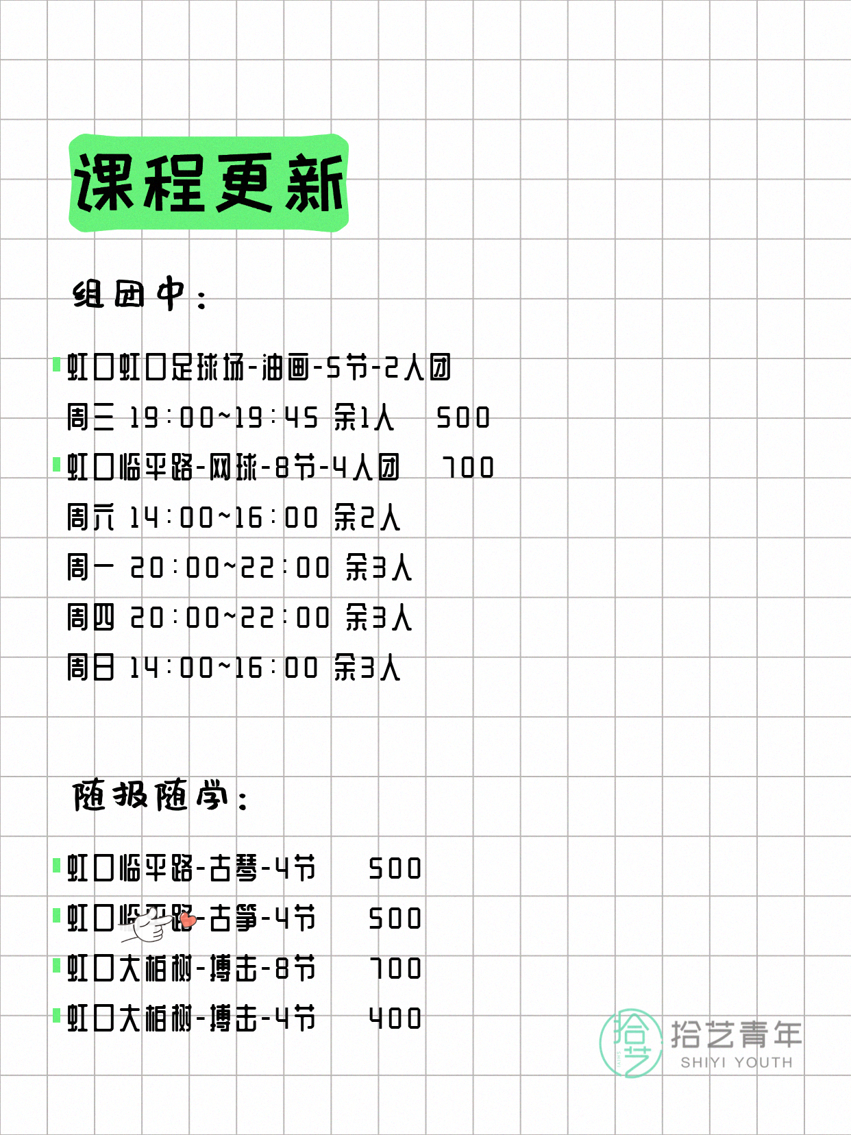 💡 提示:以上课程信息来自拾艺青年小程序,课程可能随报名动态变化,具体以小程序实时信息为准。