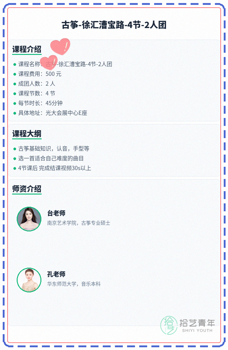 资讯>综合>正文徐汇漕宝路古筝课差1人就开拾艺青年2026-04-141 / 2漕宝路想学古筝的搭子速来,就差你开课啦🎐🏫 上课地点:光大会展中心E座📅 课程安排:共4节 | 周三 19:00-19:45📖 课程大纲:古筝基础知识,认音,手型等选一首适合自己难度的曲目4节课后 完成结课视频30s以上👥 2人团 | 已报1人 | 还差1人开课#上海夜校 #徐汇夜校 #古筝课程 #夜校拼团 #上海线下课相关标签#上海夜校#徐汇夜校#古筝课程#夜校拼团#上海线下课