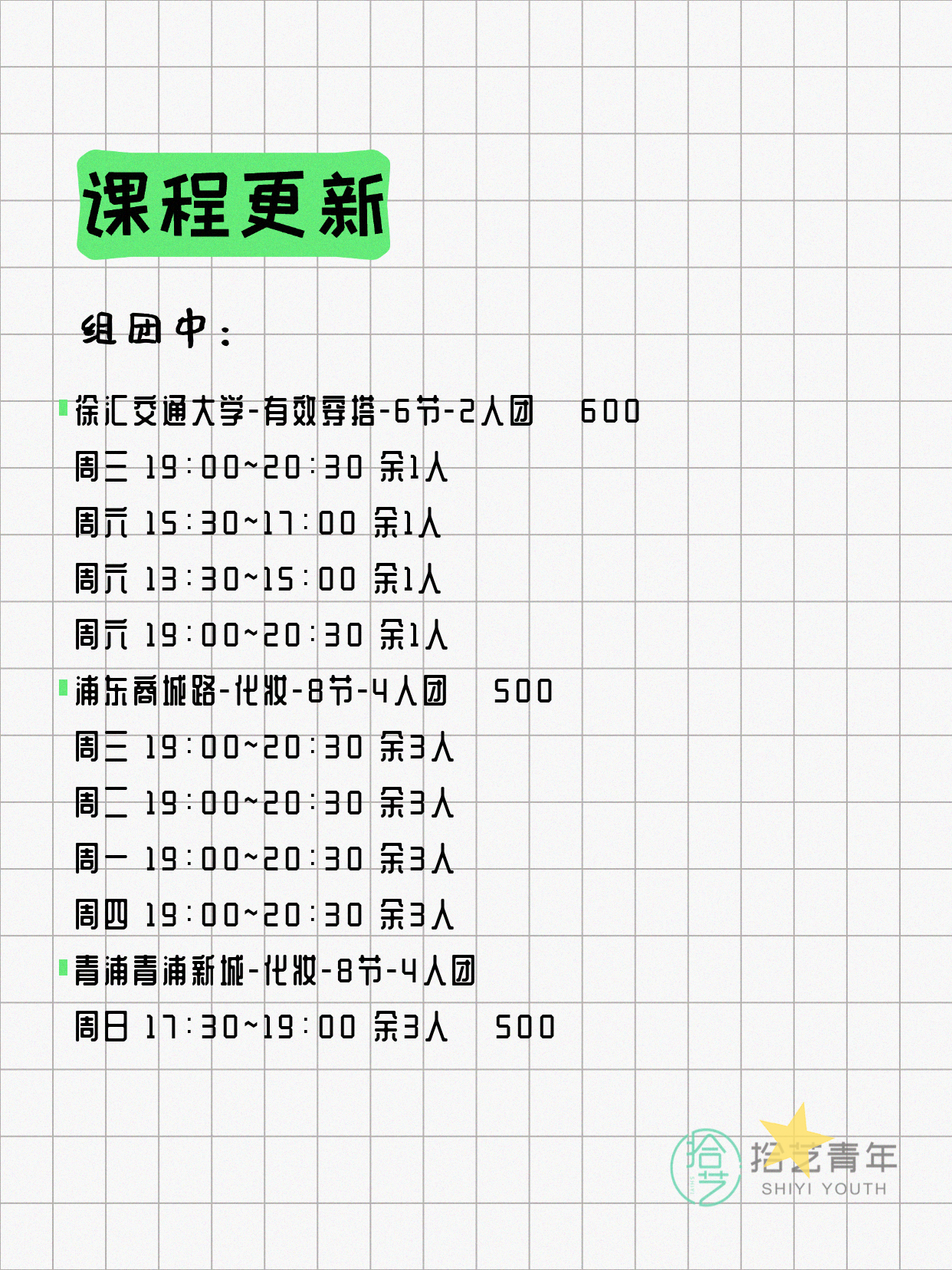💡 提示:以上课程信息来自拾艺青年小程序,课程可能随报名动态变化,具体以小程序实时信息为准。