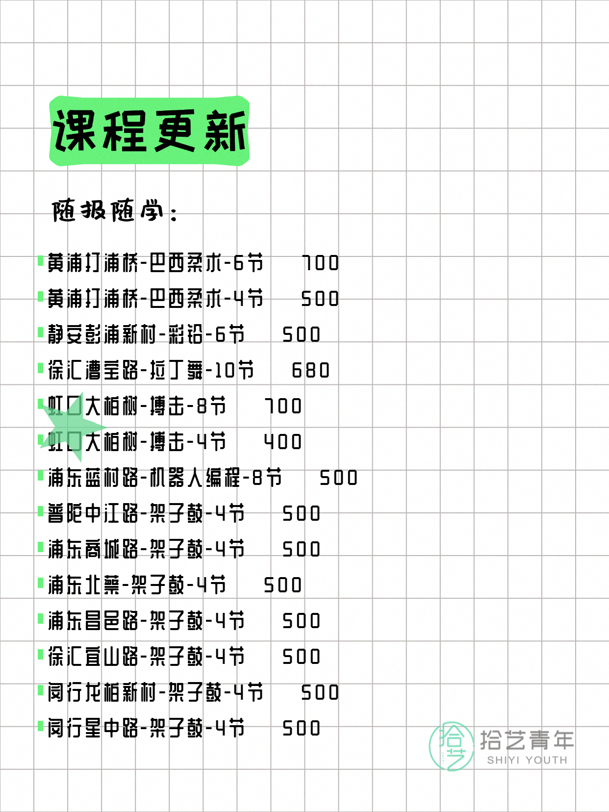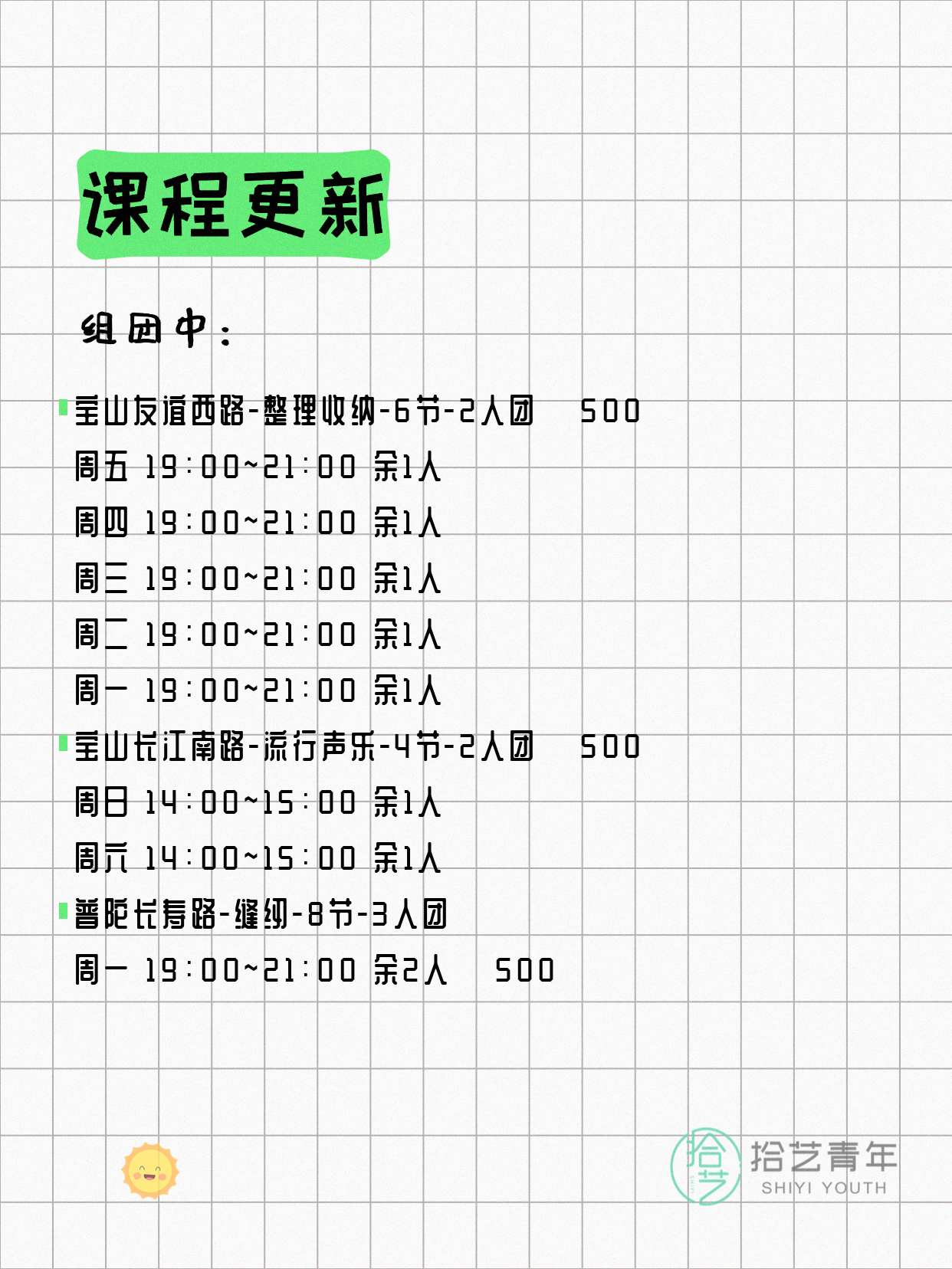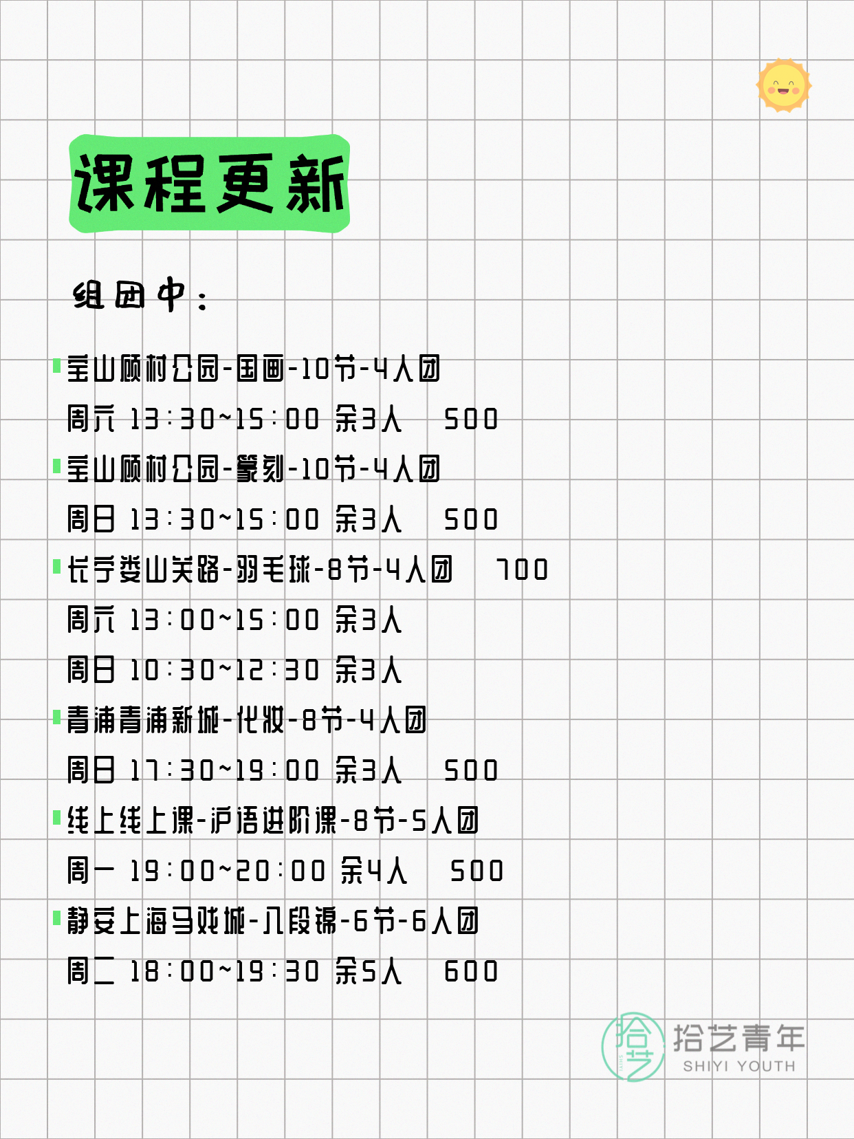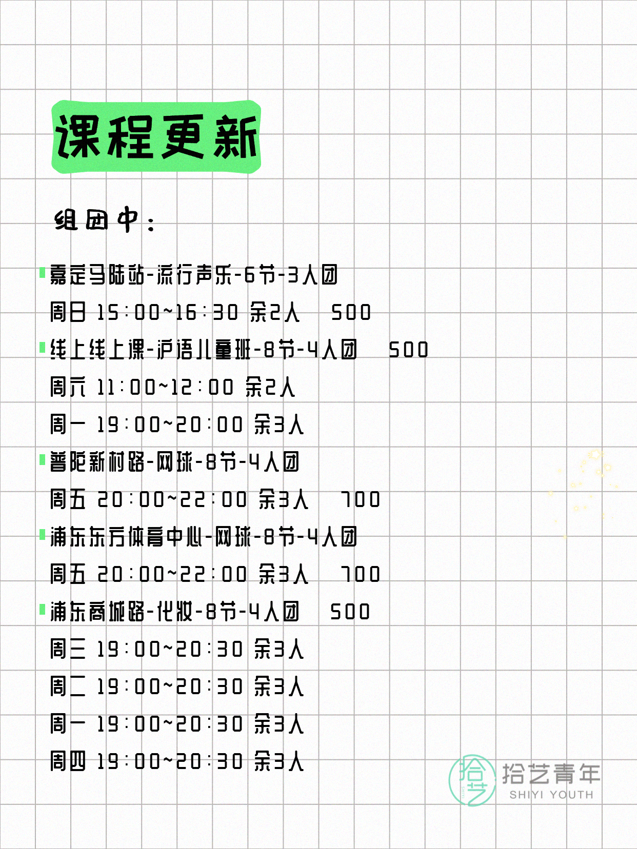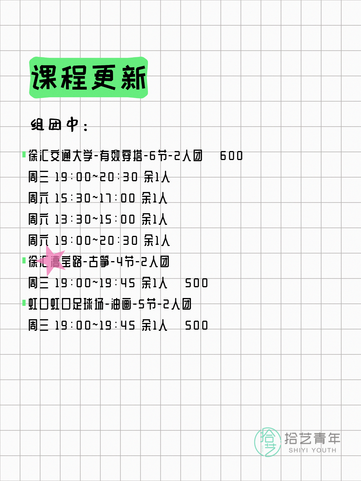 💡 提示:以上课程信息来自拾艺青年小程序,课程可能随报名动态变化,具体以小程序实时信息为准。