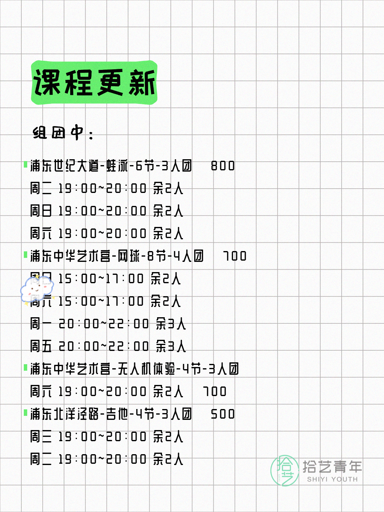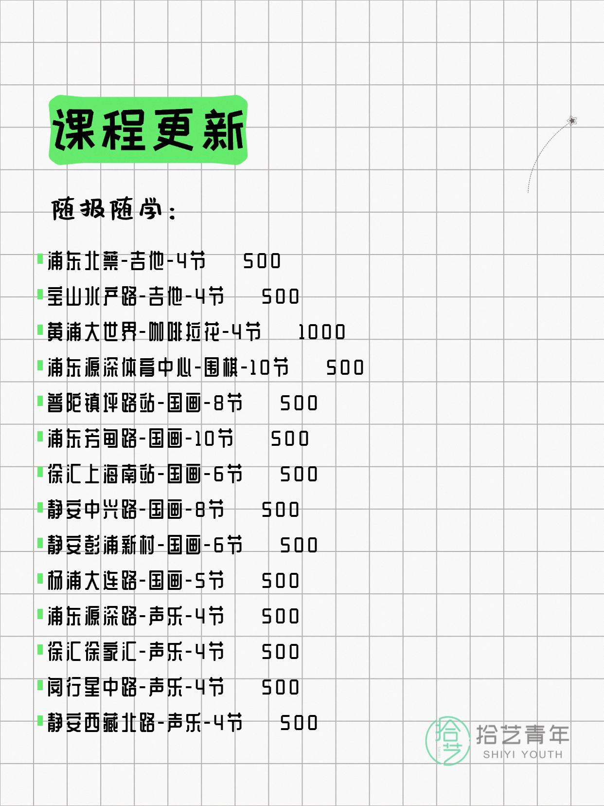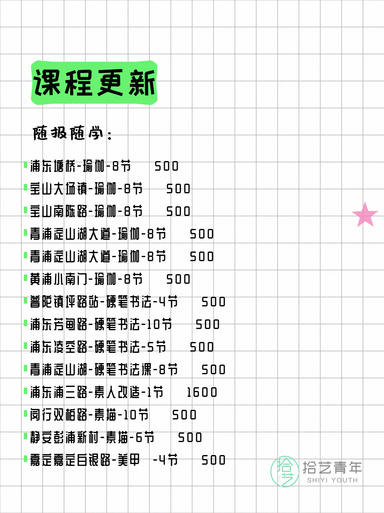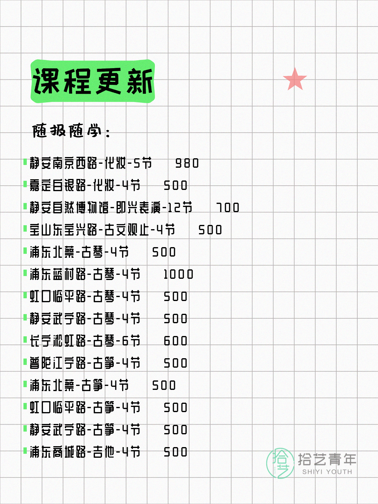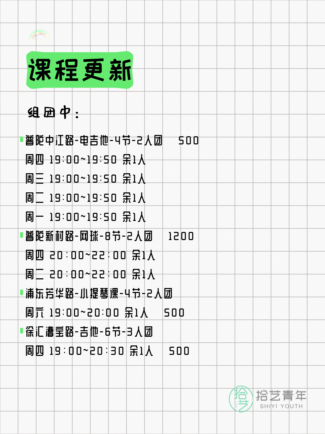 💡 提示:以上课程信息来自拾艺青年小程序,课程可能随报名动态变化,具体以小程序实时信息为准。