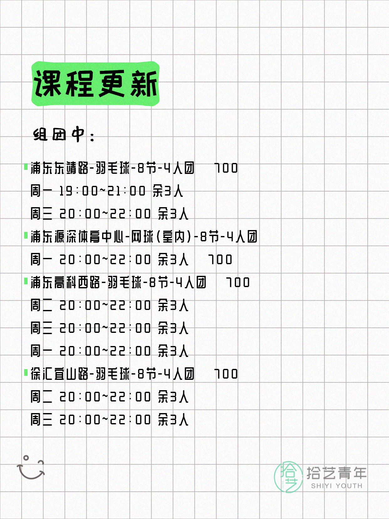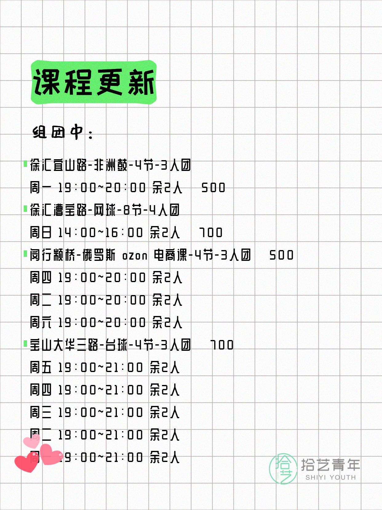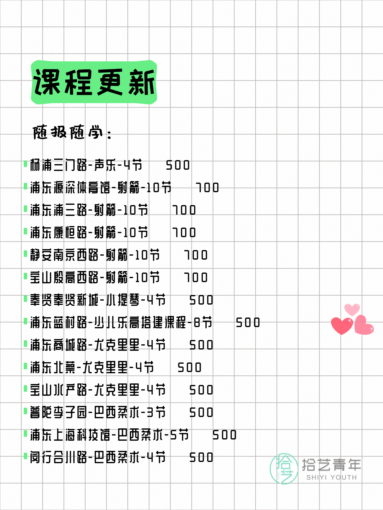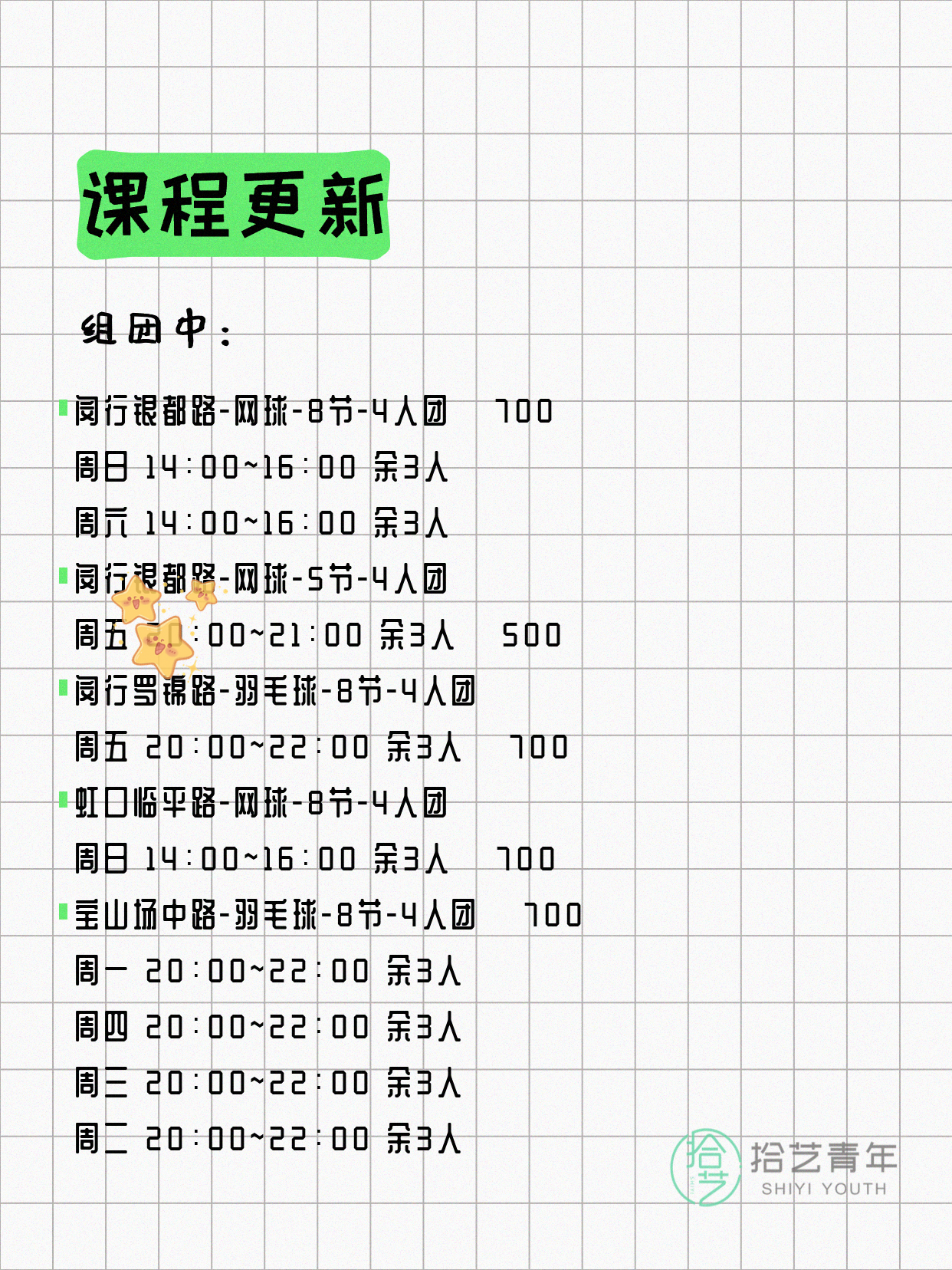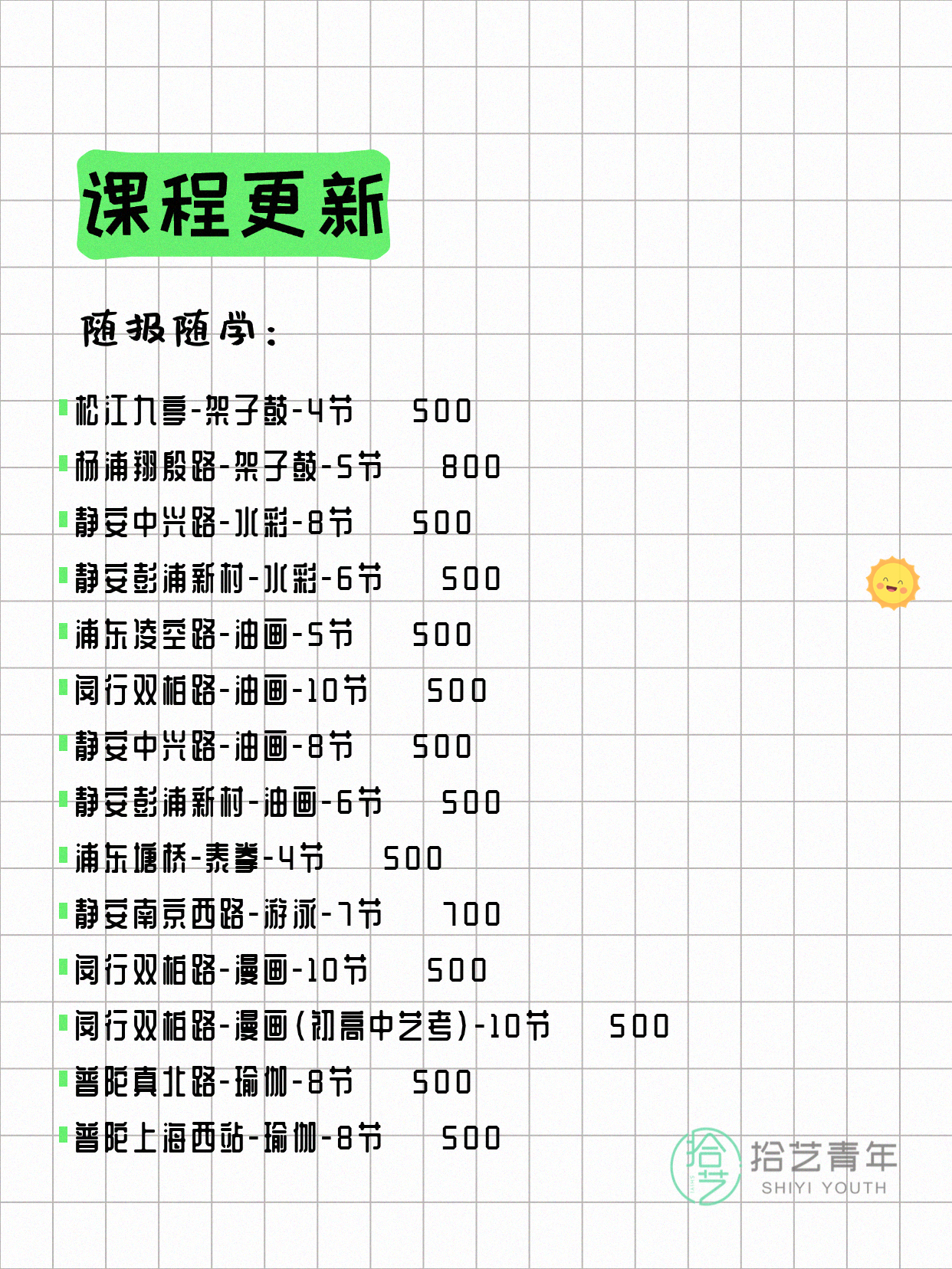 💡 提示:以上课程信息来自拾艺青年小程序,课程可能随报名动态变化,具体以小程序实时信息为准。