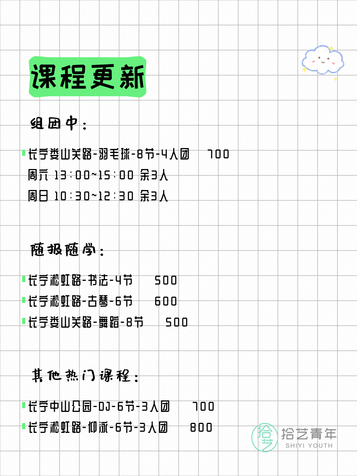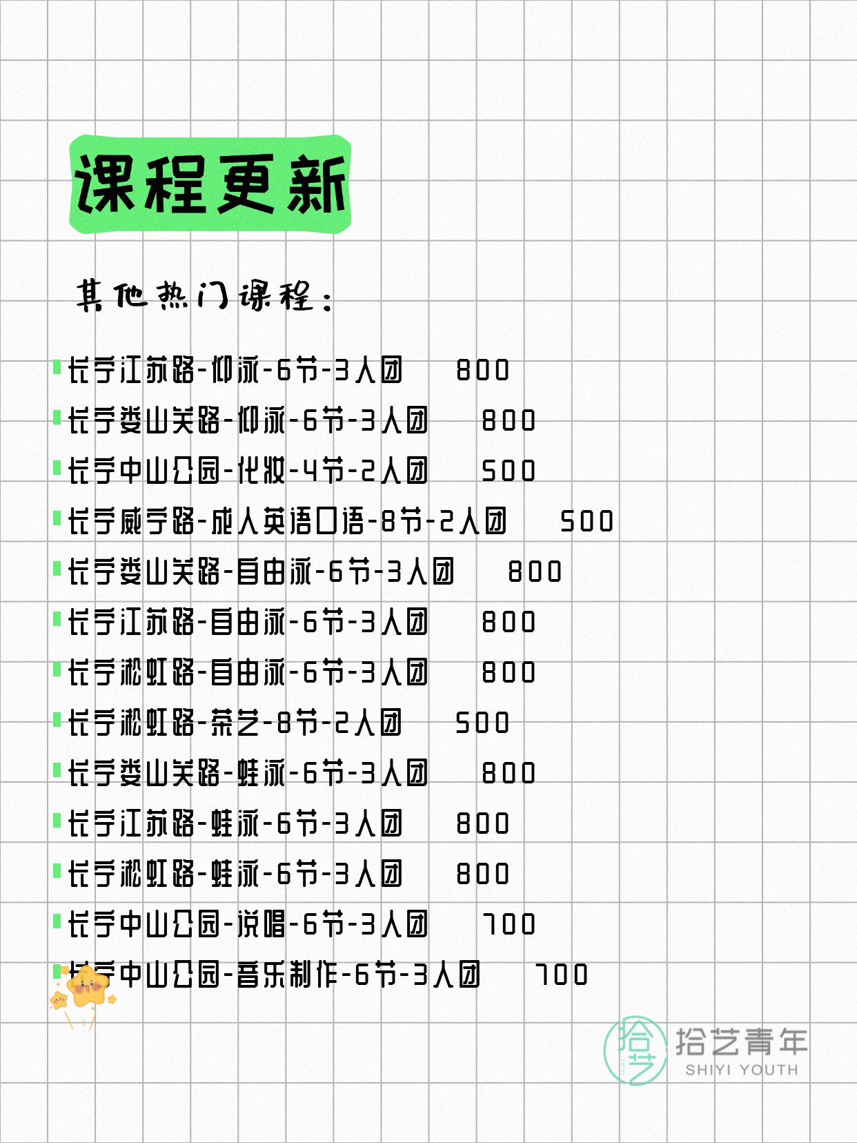 💡 提示:以上课程信息来自拾艺青年小程序,课程可能随报名动态变化,具体以小程序实时信息为准。