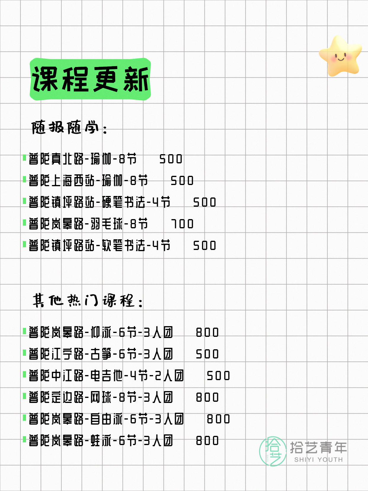 💡 提示:以上课程信息来自拾艺青年小程序,课程可能随报名动态变化,具体以小程序实时信息为准。