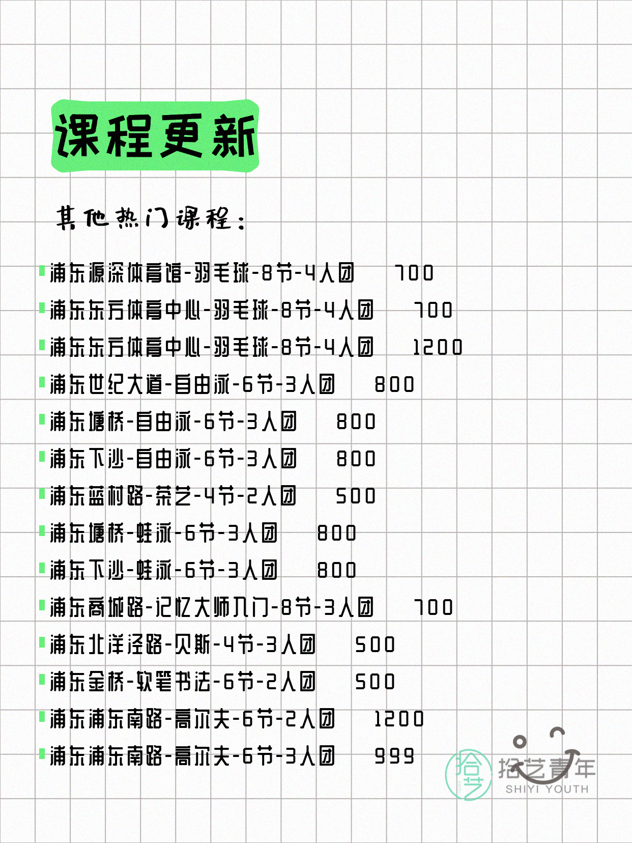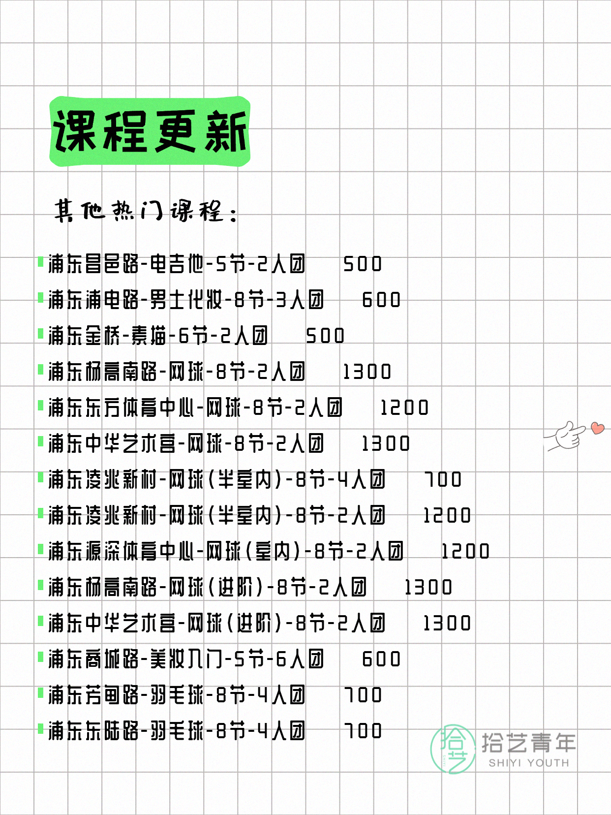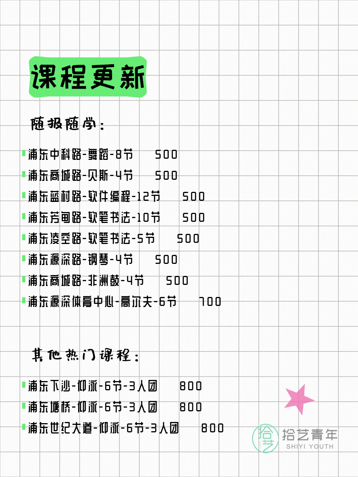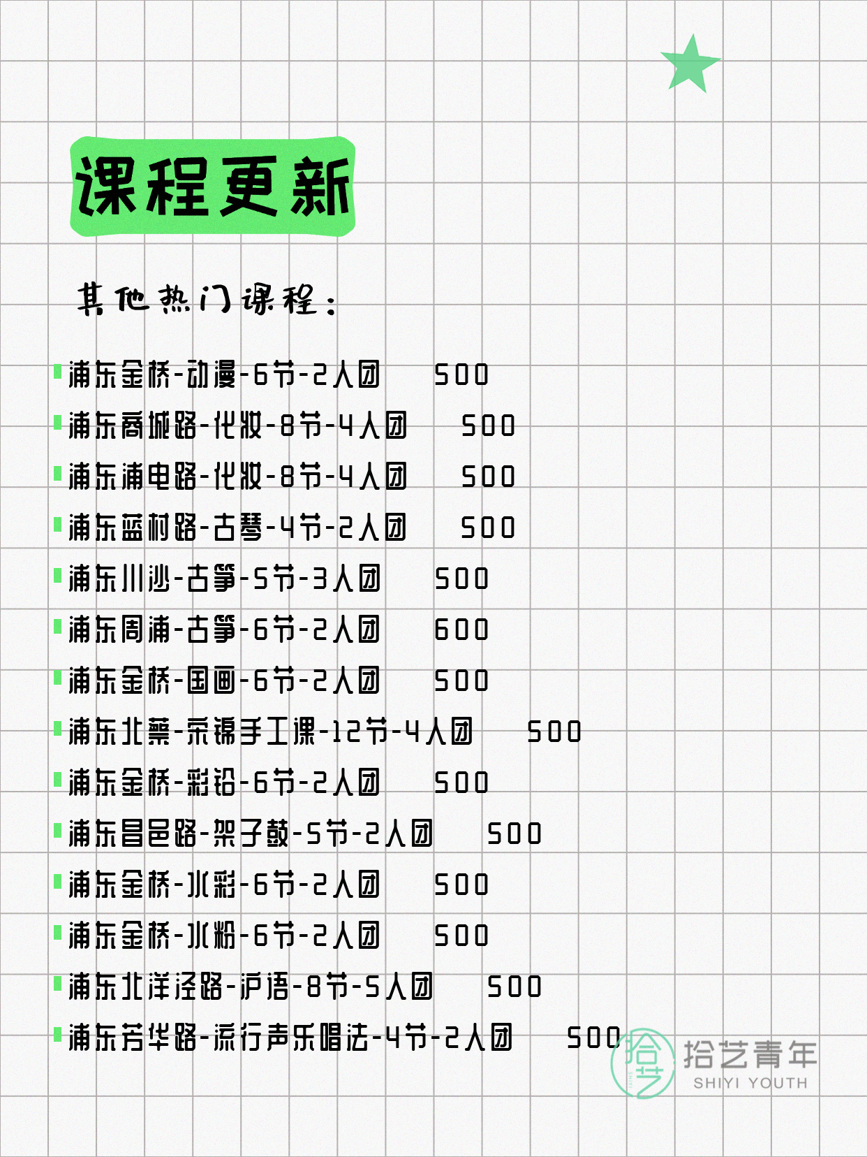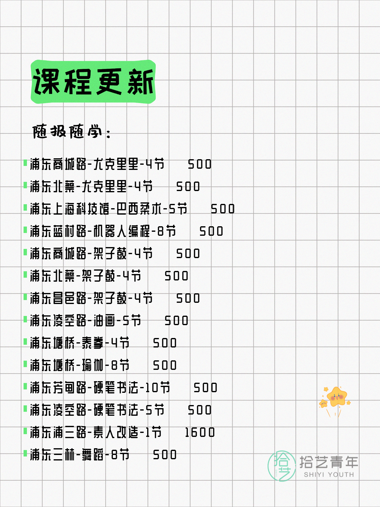 💡 提示:以上课程信息来自拾艺青年小程序,课程可能随报名动态变化,具体以小程序实时信息为准。