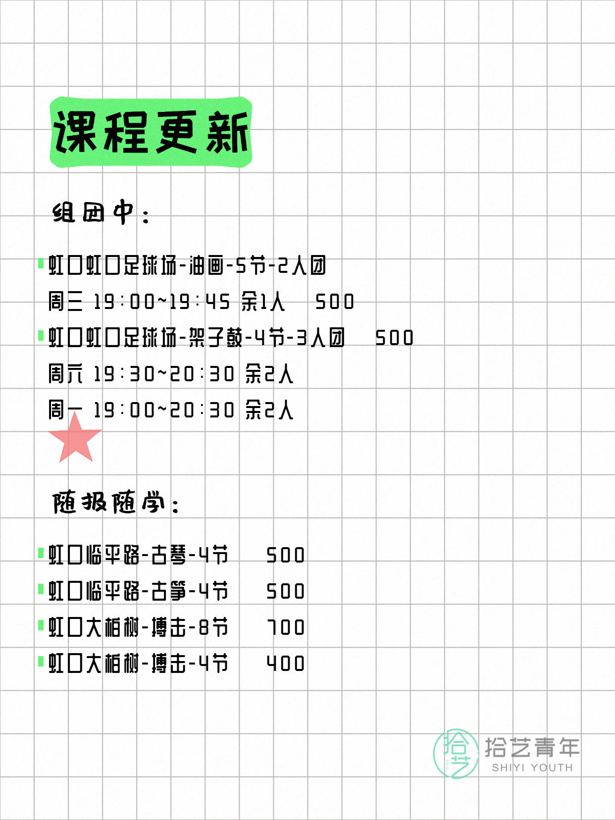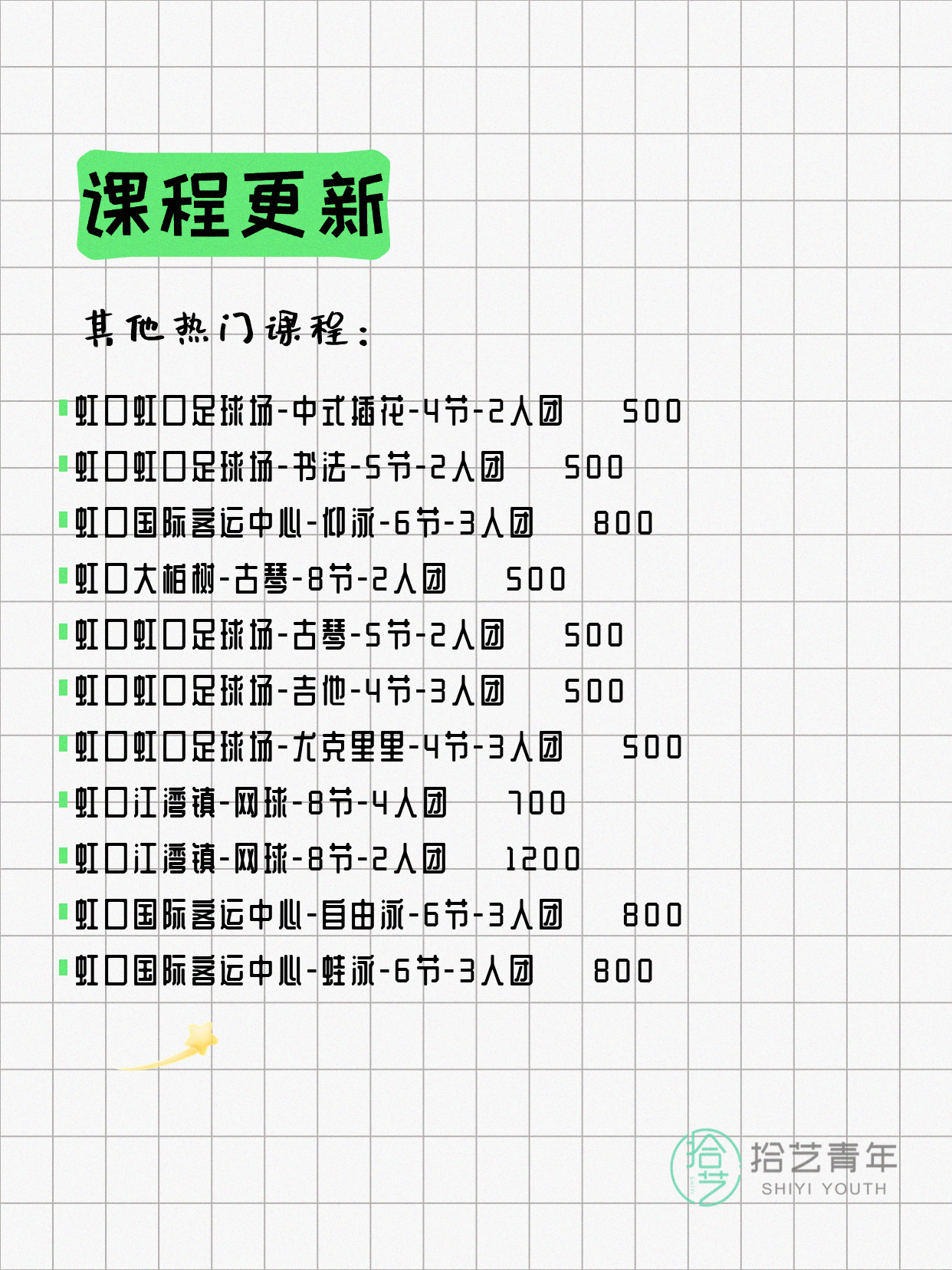💡 提示:以上课程信息来自拾艺青年小程序,课程可能随报名动态变化,具体以小程序实时信息为准。