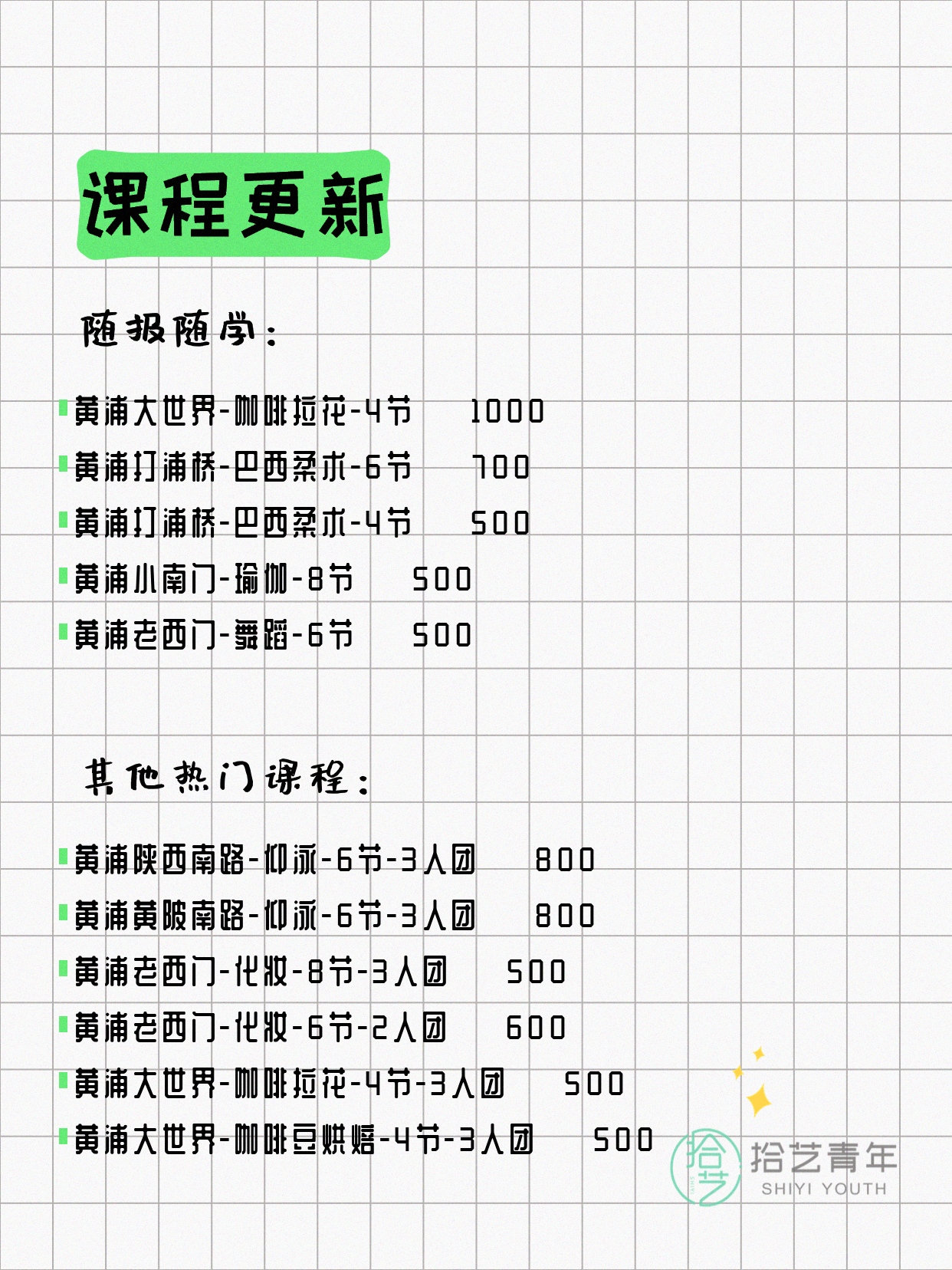 💡 提示:以上课程信息来自拾艺青年小程序,课程可能随报名动态变化,具体以小程序实时信息为准。