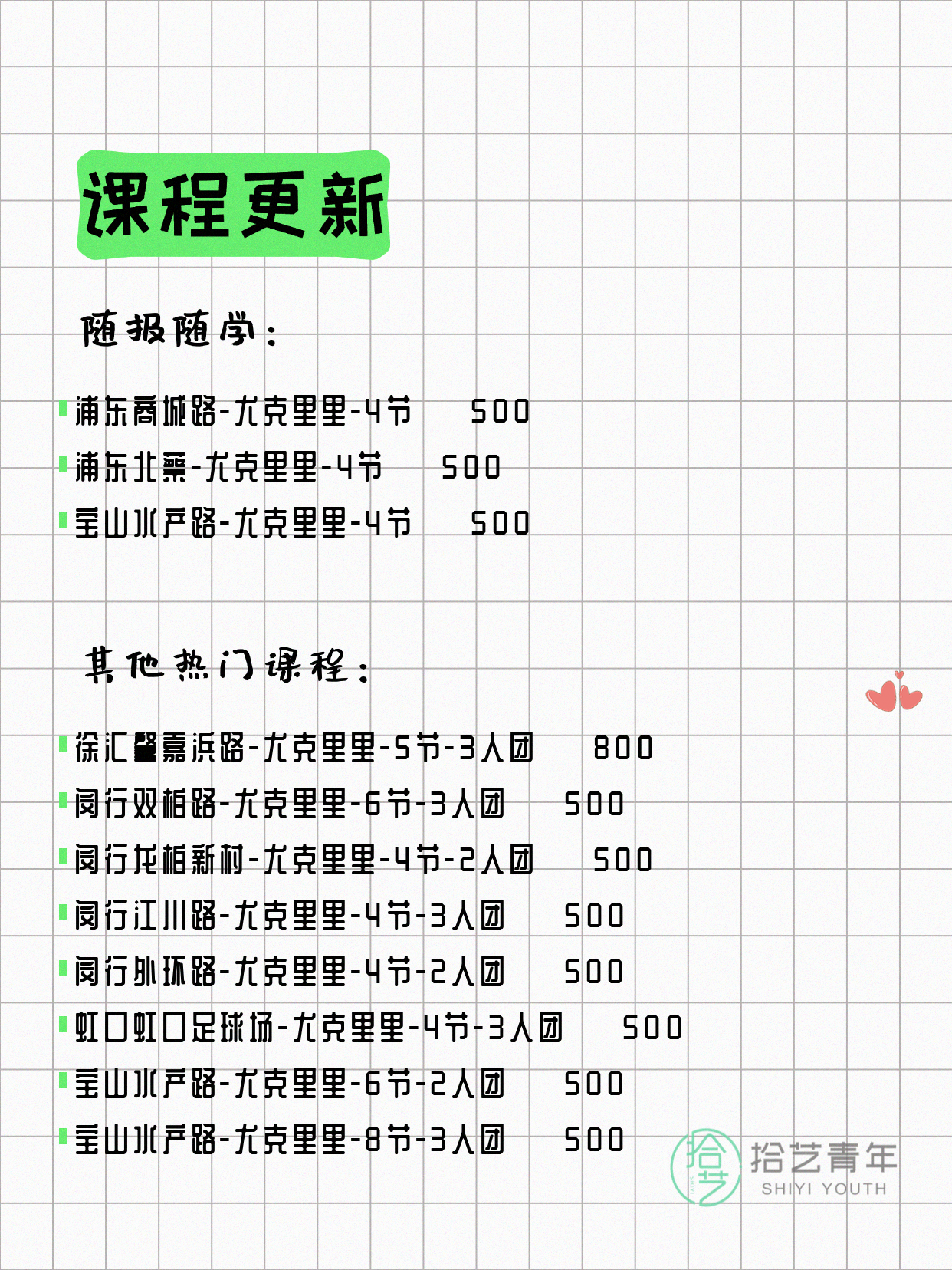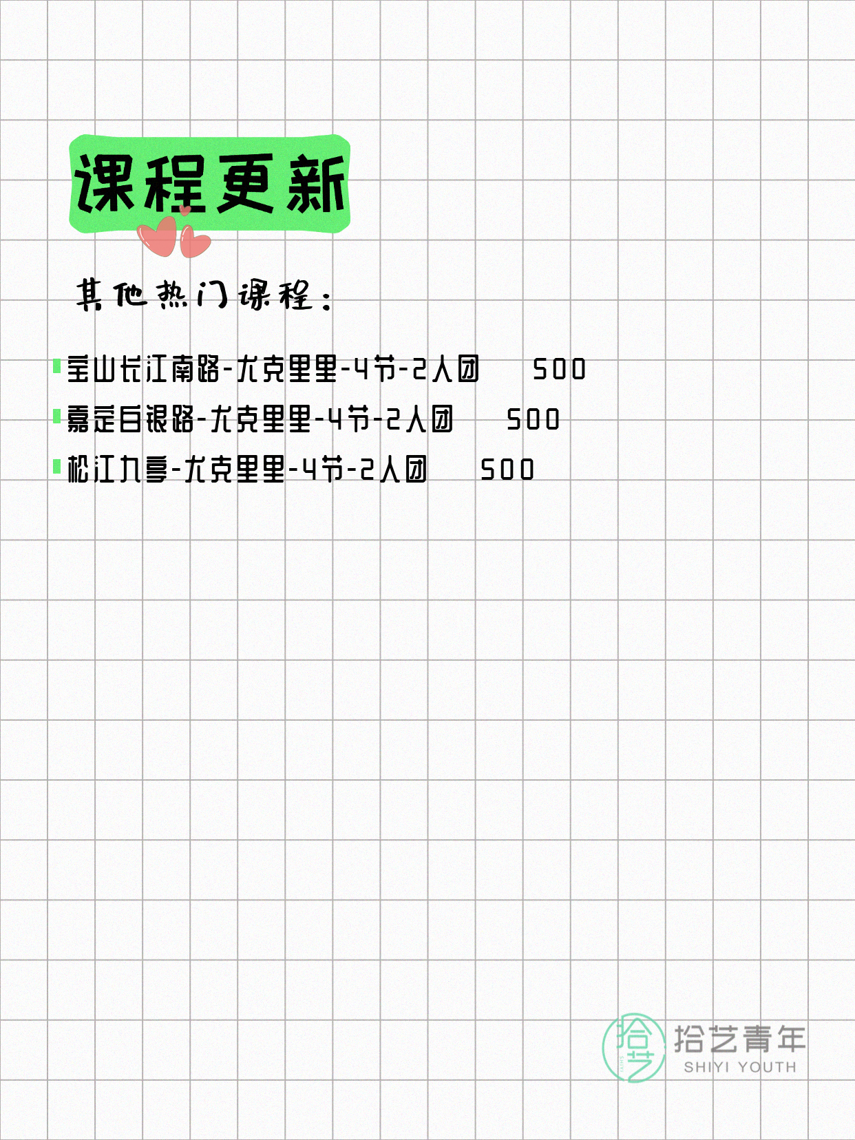 💡 提示:以上课程信息来自拾艺青年小程序,课程可能随报名动态变化,具体以小程序实时信息为准。