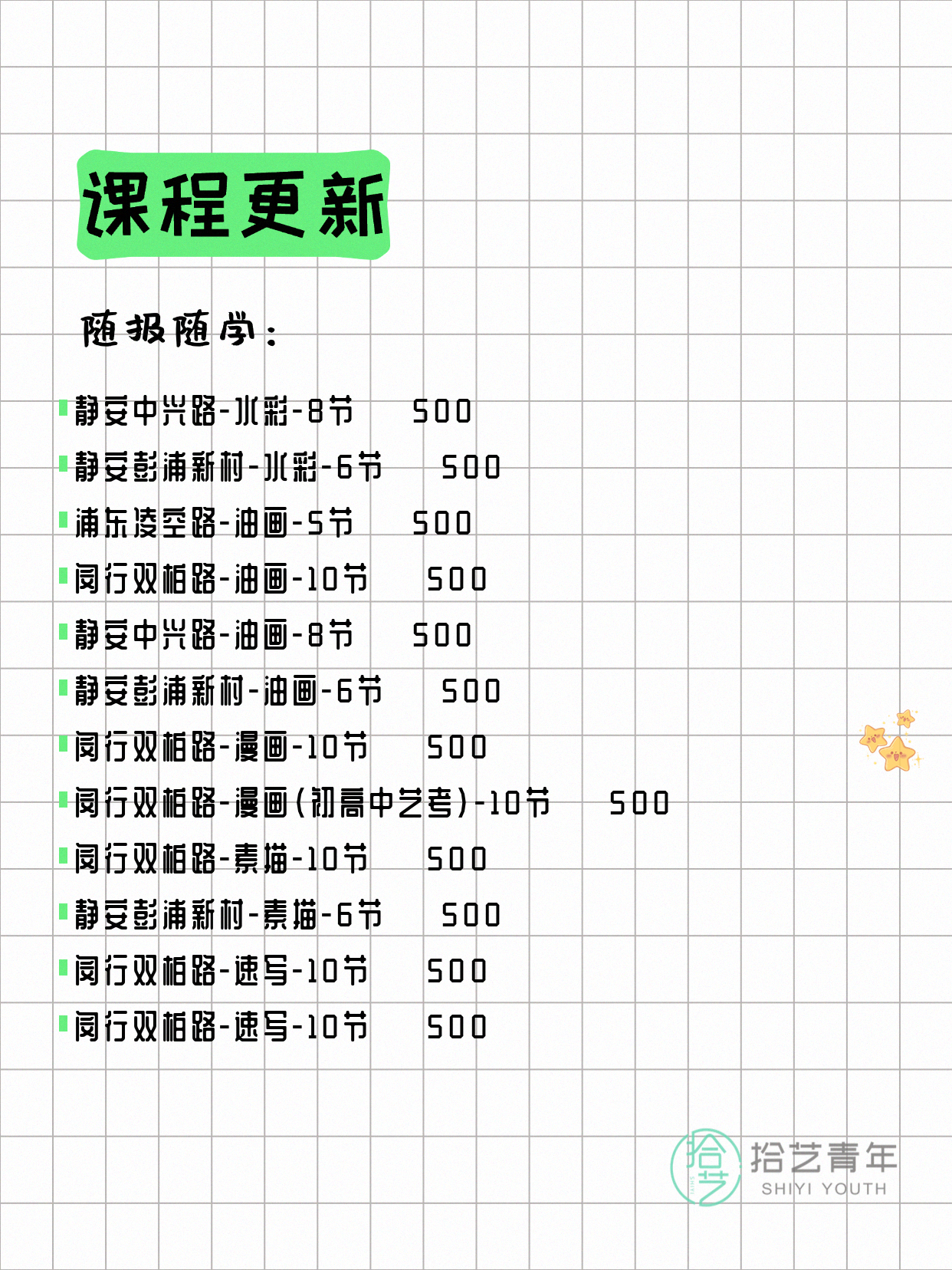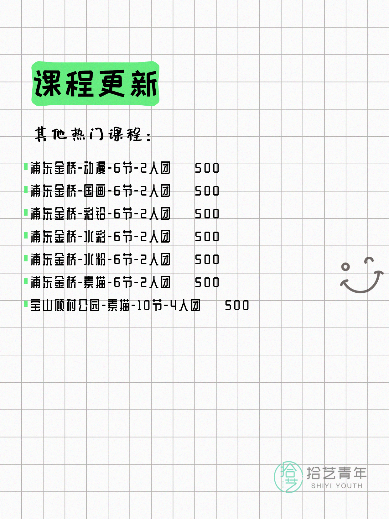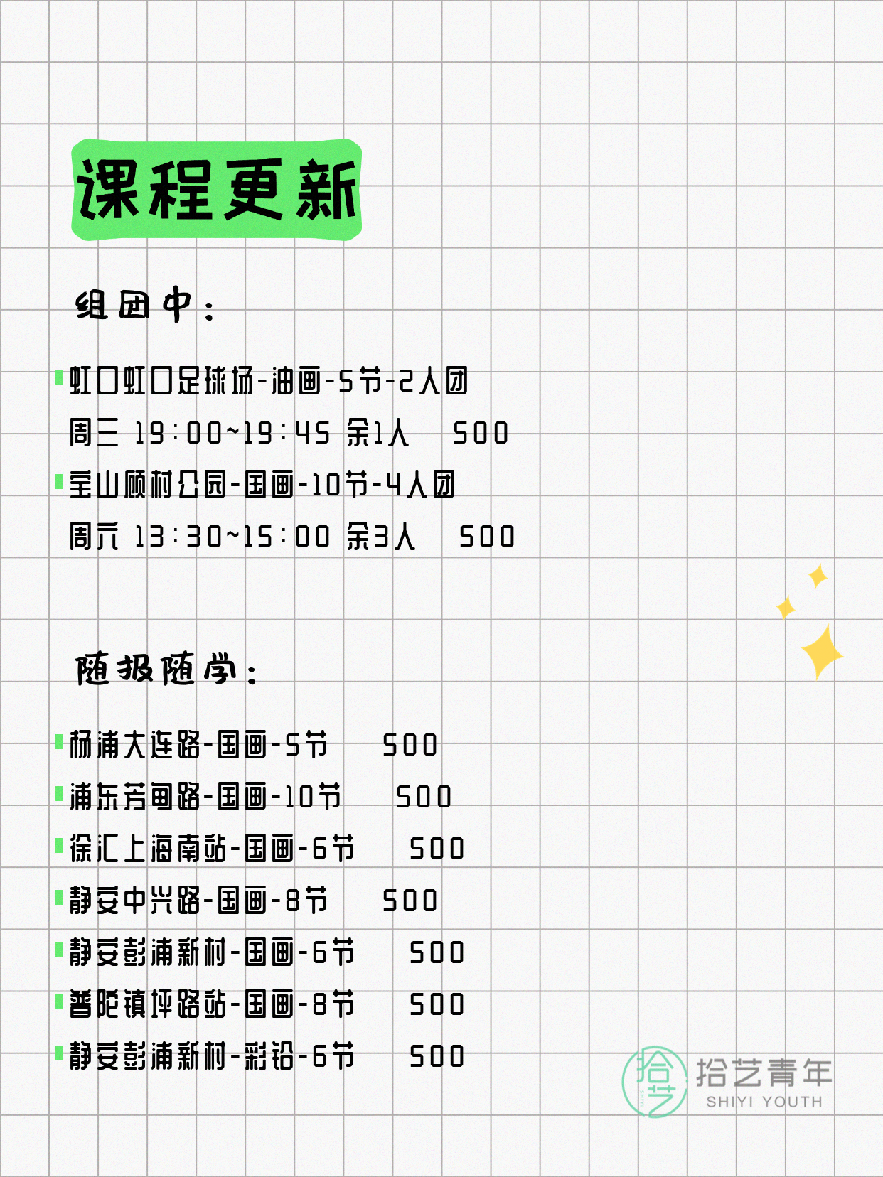 💡 提示:以上课程信息来自拾艺青年小程序,课程可能随报名动态变化,具体以小程序实时信息为准。