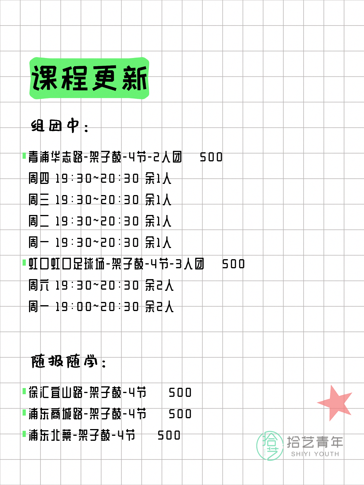 🔥 架子鼓-虹口虹口足球场-4节-3人团 💰500