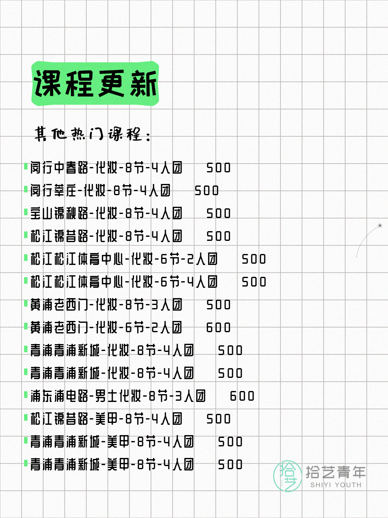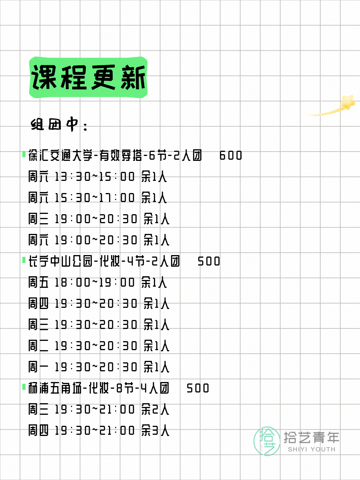 💡 提示:以上课程信息来自拾艺青年小程序,课程可能随报名动态变化,具体以小程序实时信息为准。