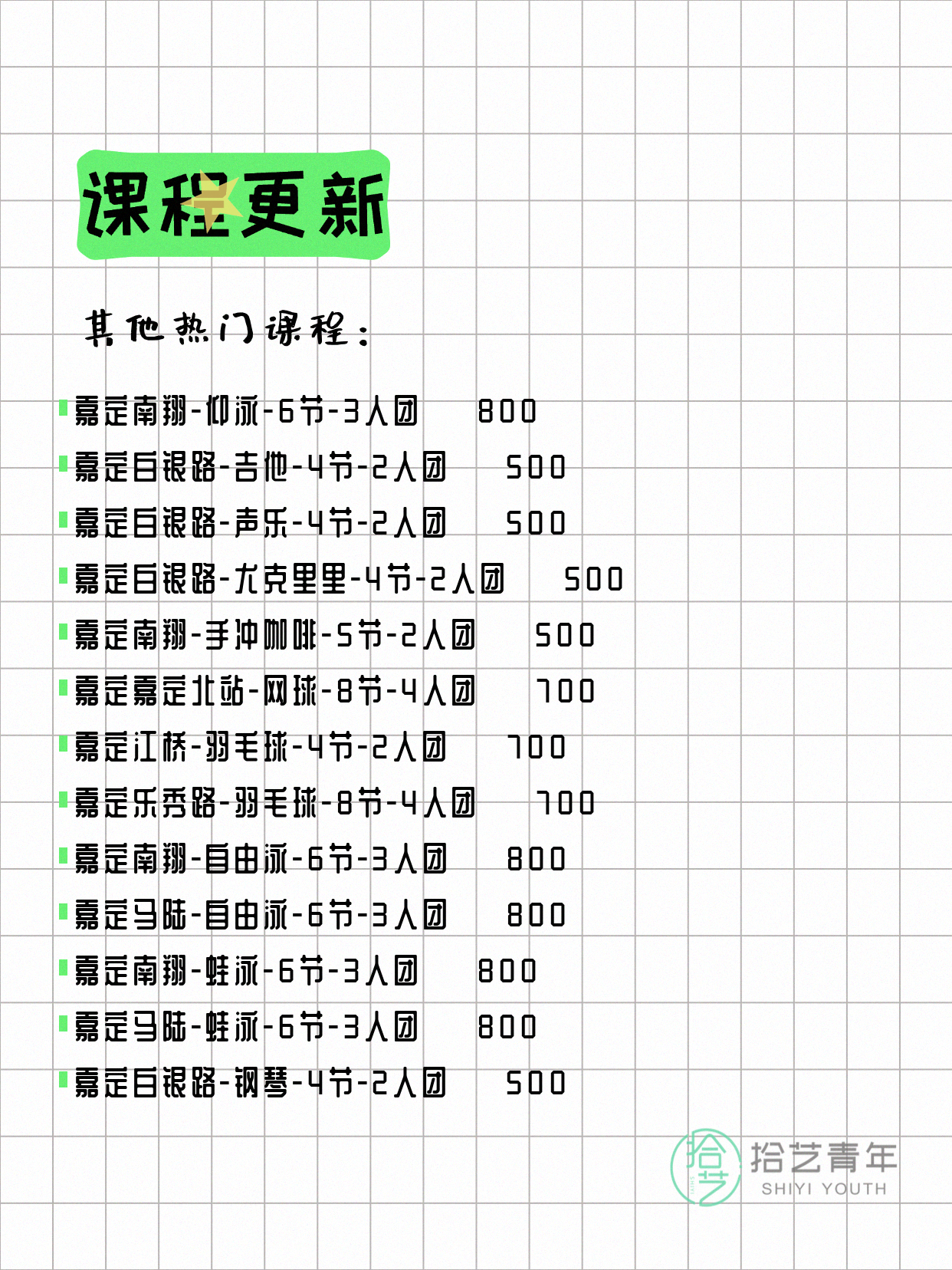 💡 提示:以上课程信息来自拾艺青年小程序,课程可能随报名动态变化,具体以小程序实时信息为准。