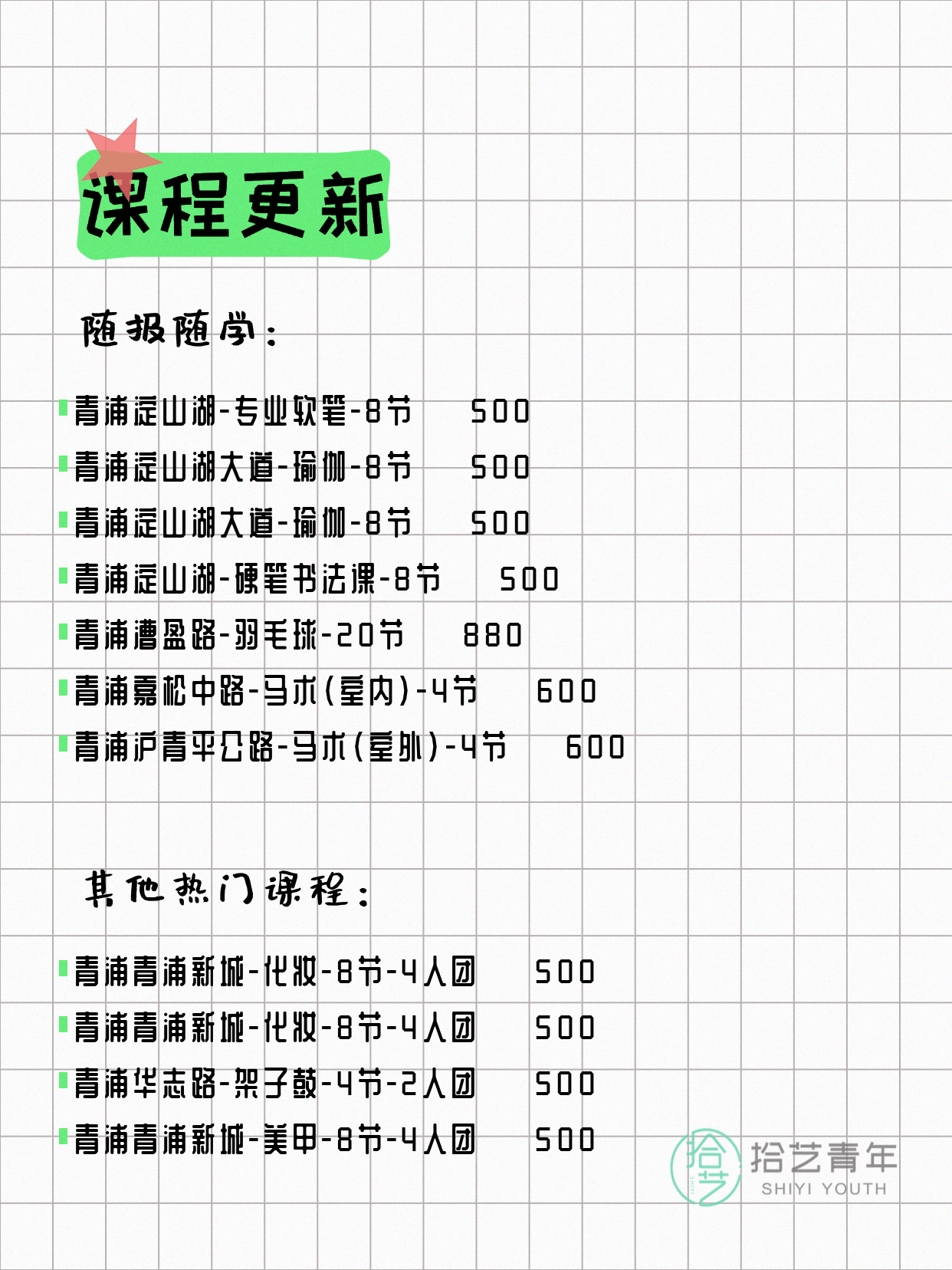 💡 提示:以上课程信息来自拾艺青年小程序,课程可能随报名动态变化,具体以小程序实时信息为准。
