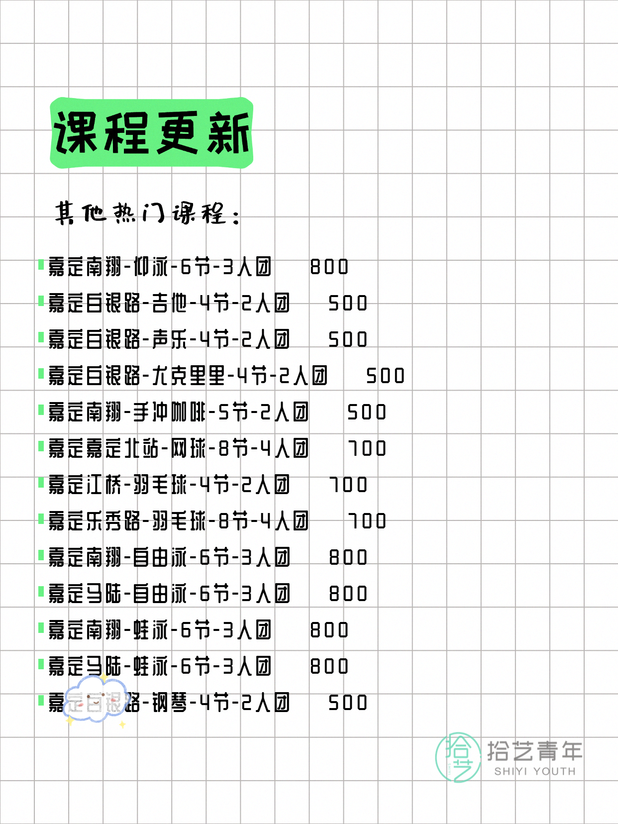 💡 提示:以上课程信息来自拾艺青年小程序,课程可能随报名动态变化,具体以小程序实时信息为准。