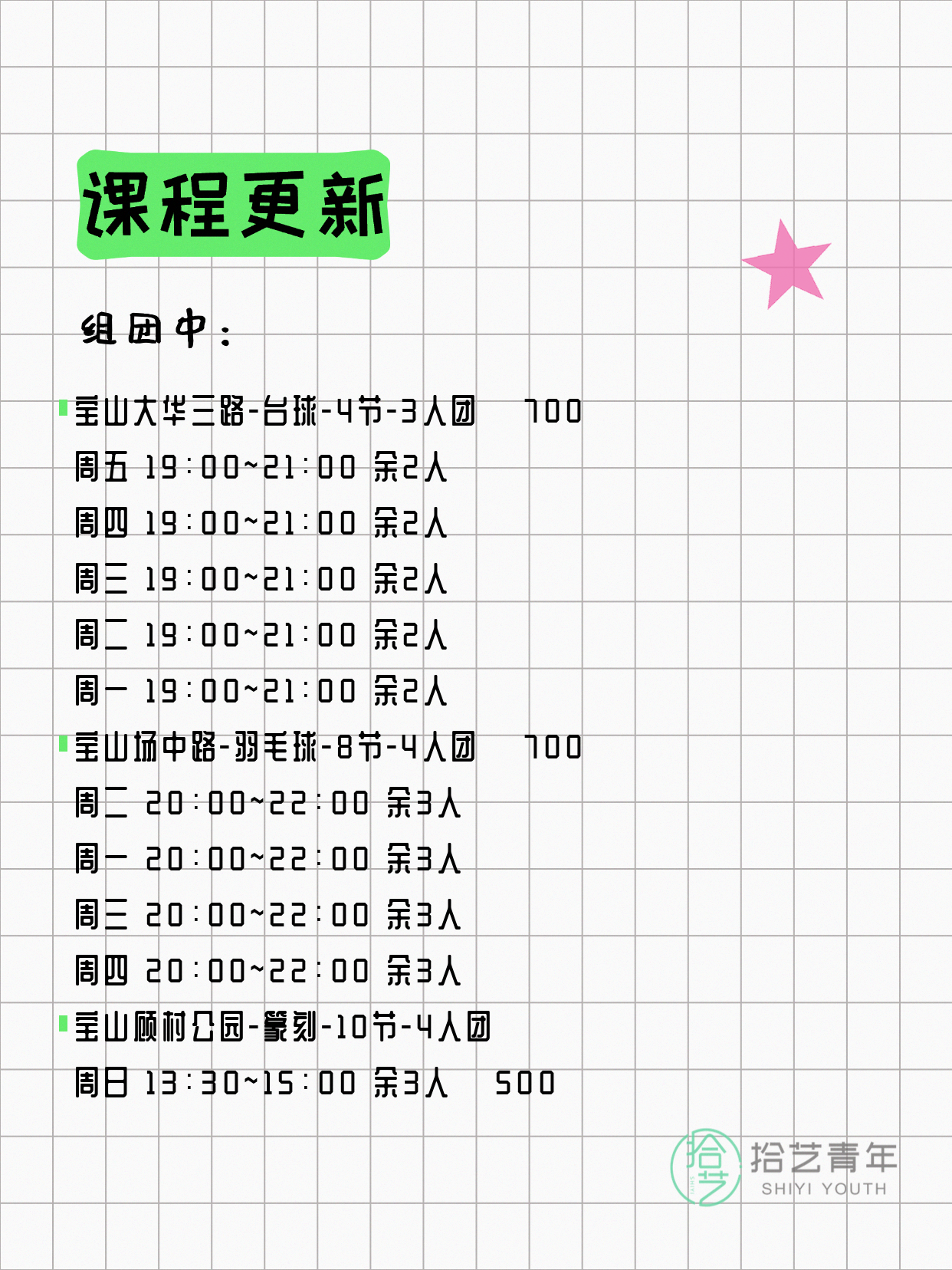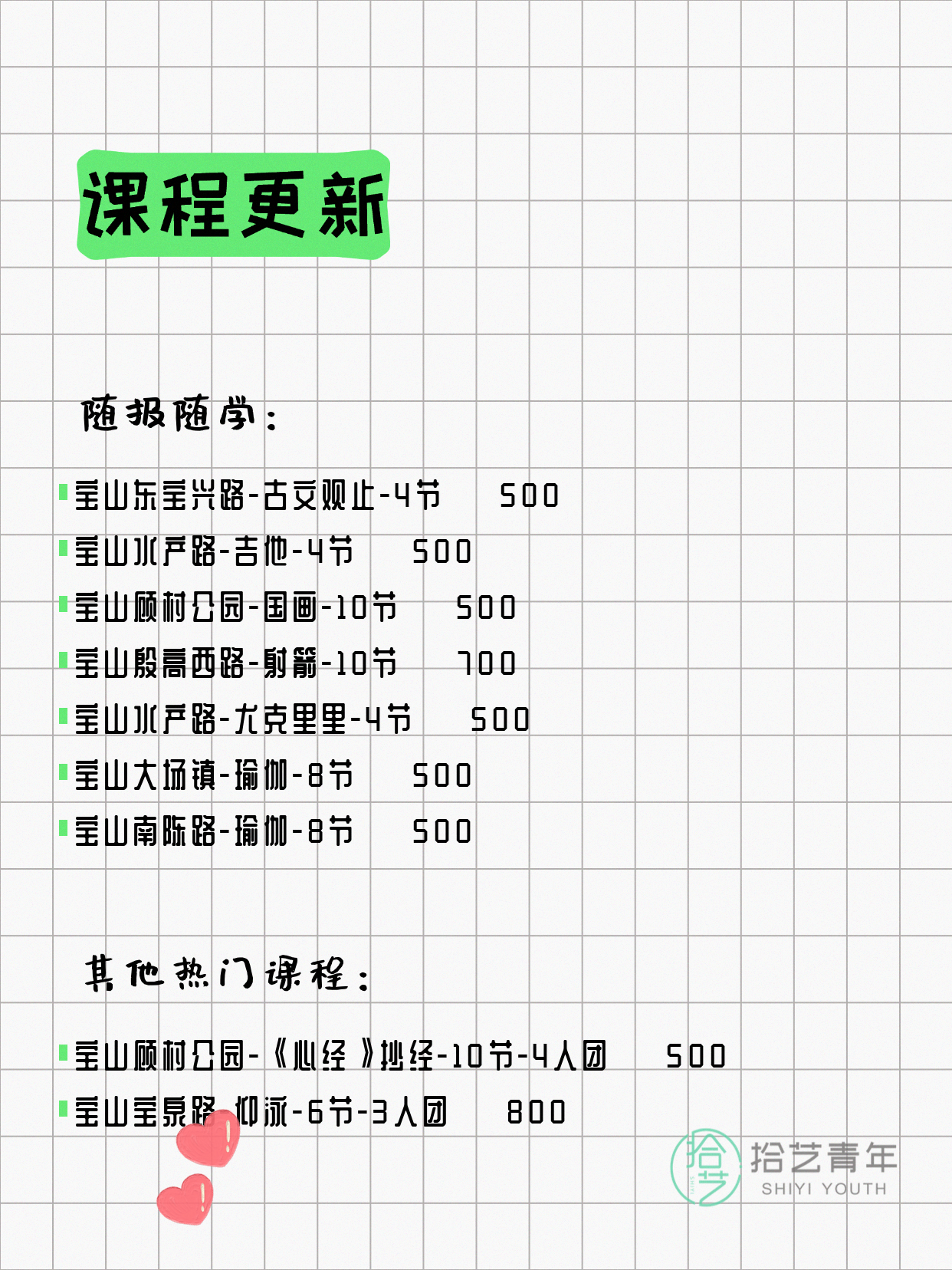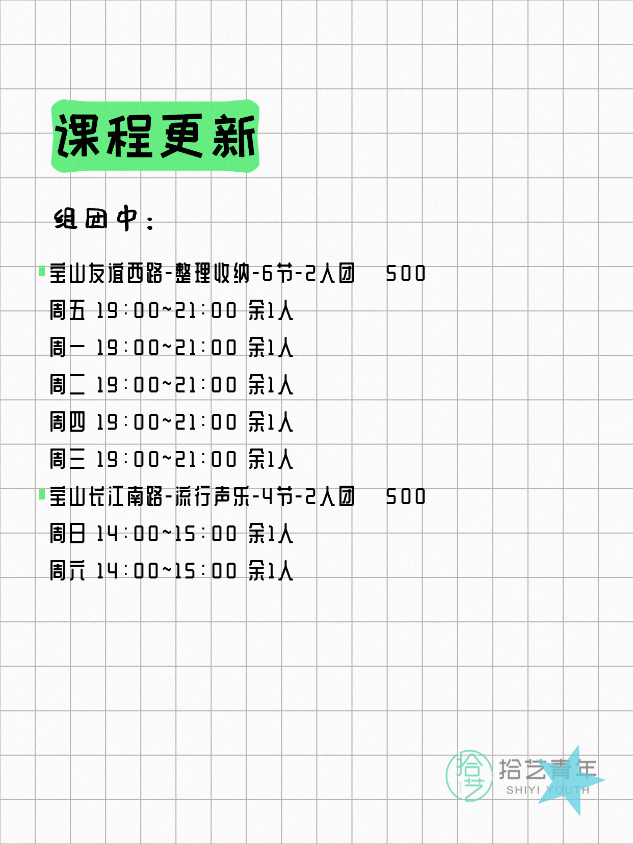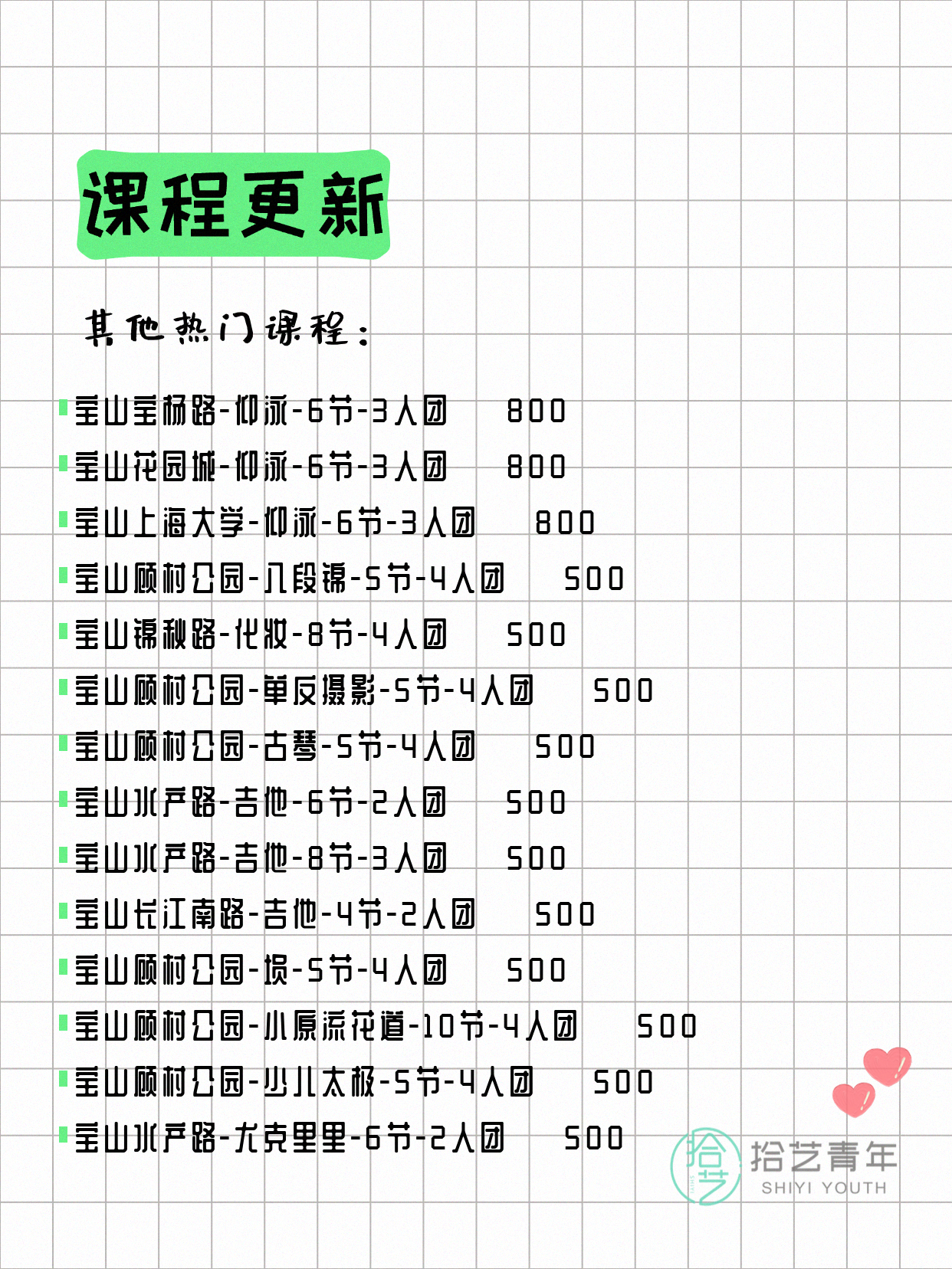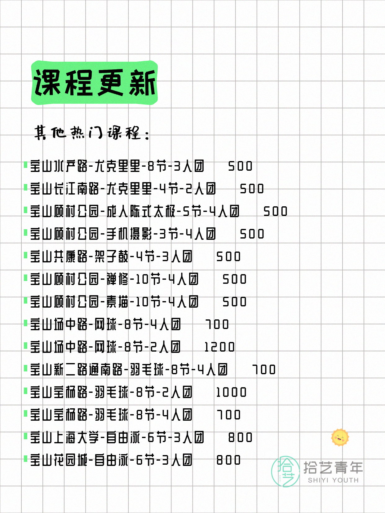 💡 提示:以上课程信息来自拾艺青年小程序,课程可能随报名动态变化,具体以小程序实时信息为准。