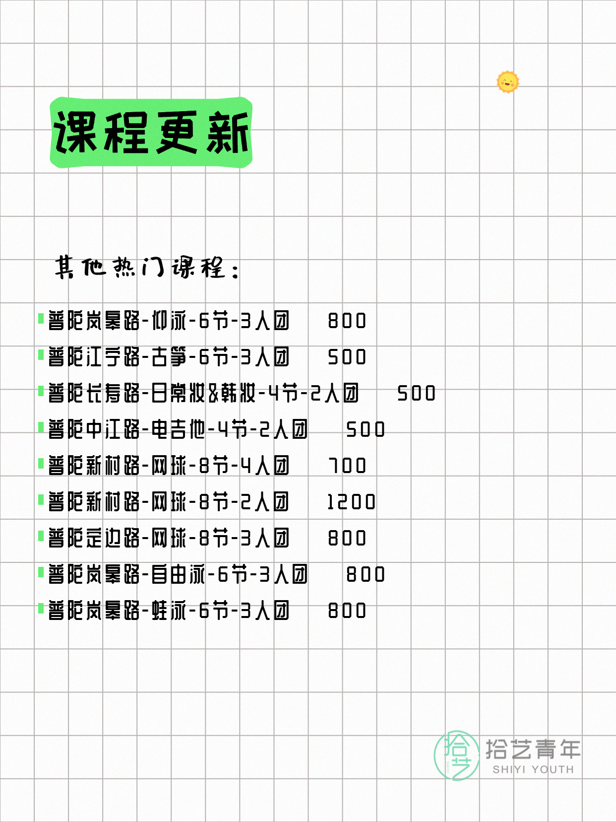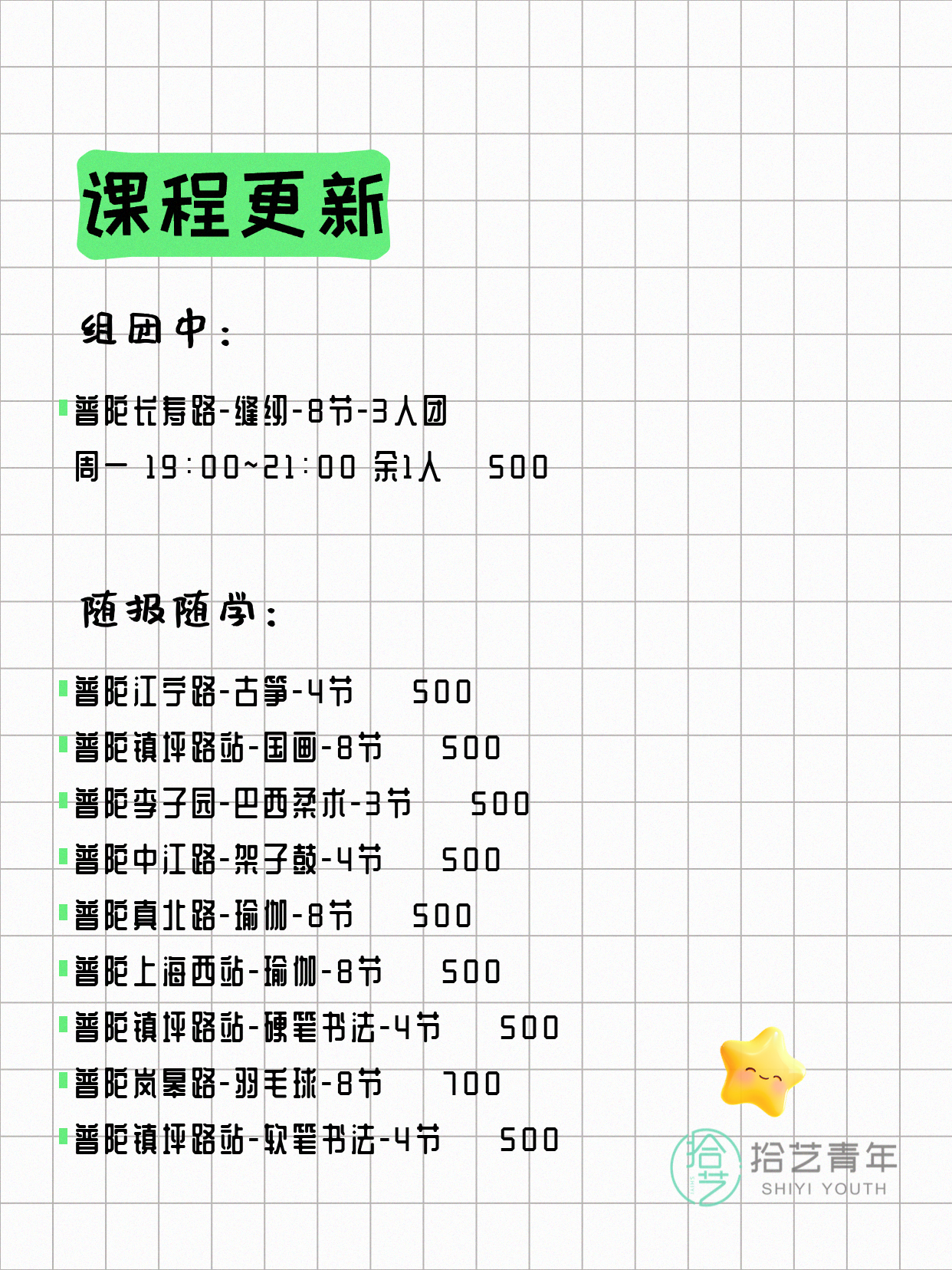 💡 提示:以上课程信息来自拾艺青年小程序,课程可能随报名动态变化,具体以小程序实时信息为准。