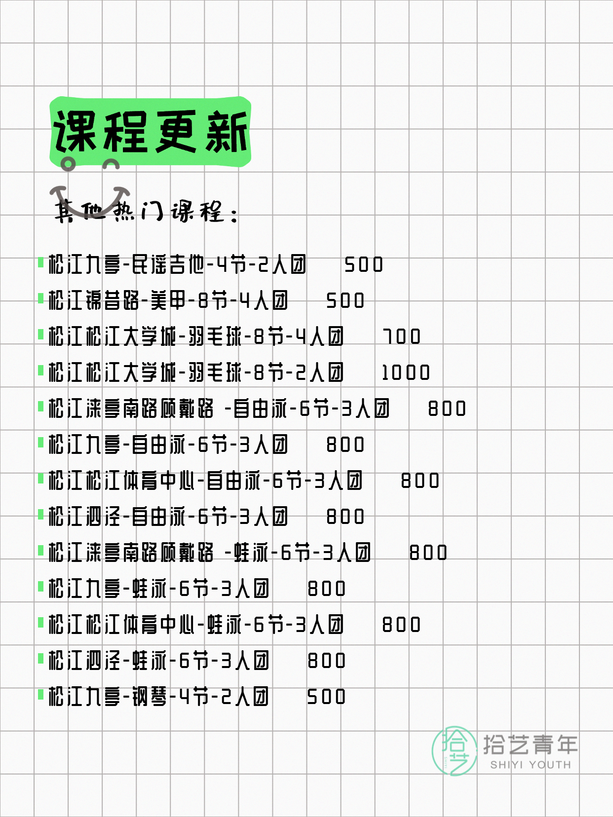💡 提示:以上课程信息来自拾艺青年小程序,课程可能随报名动态变化,具体以小程序实时信息为准。