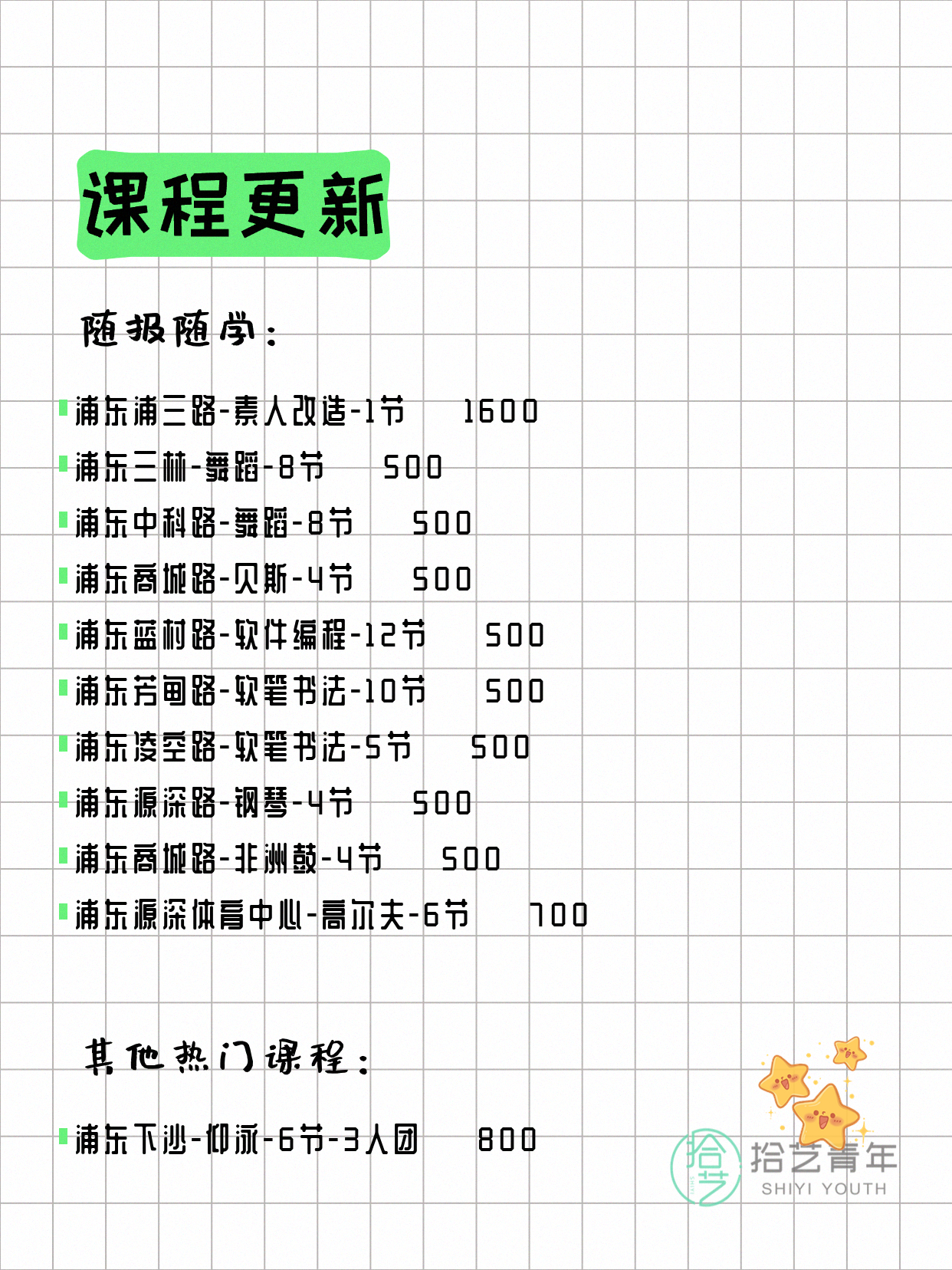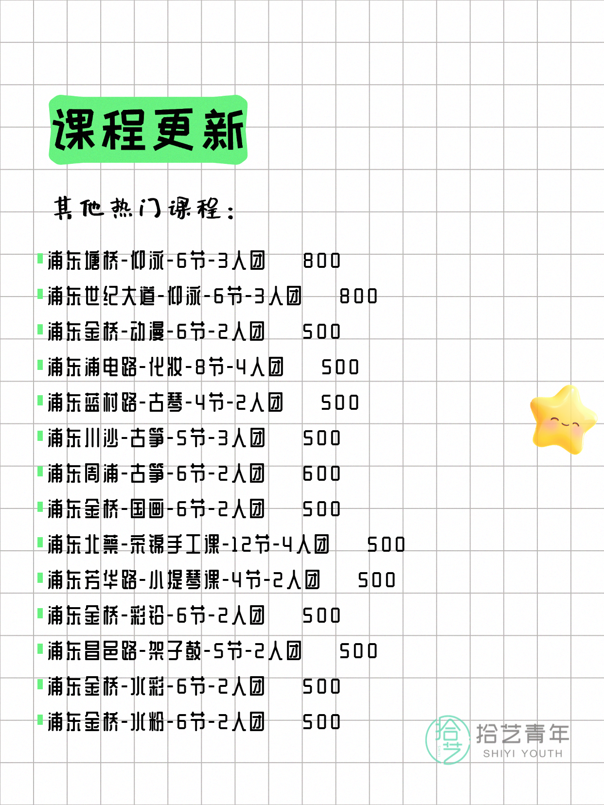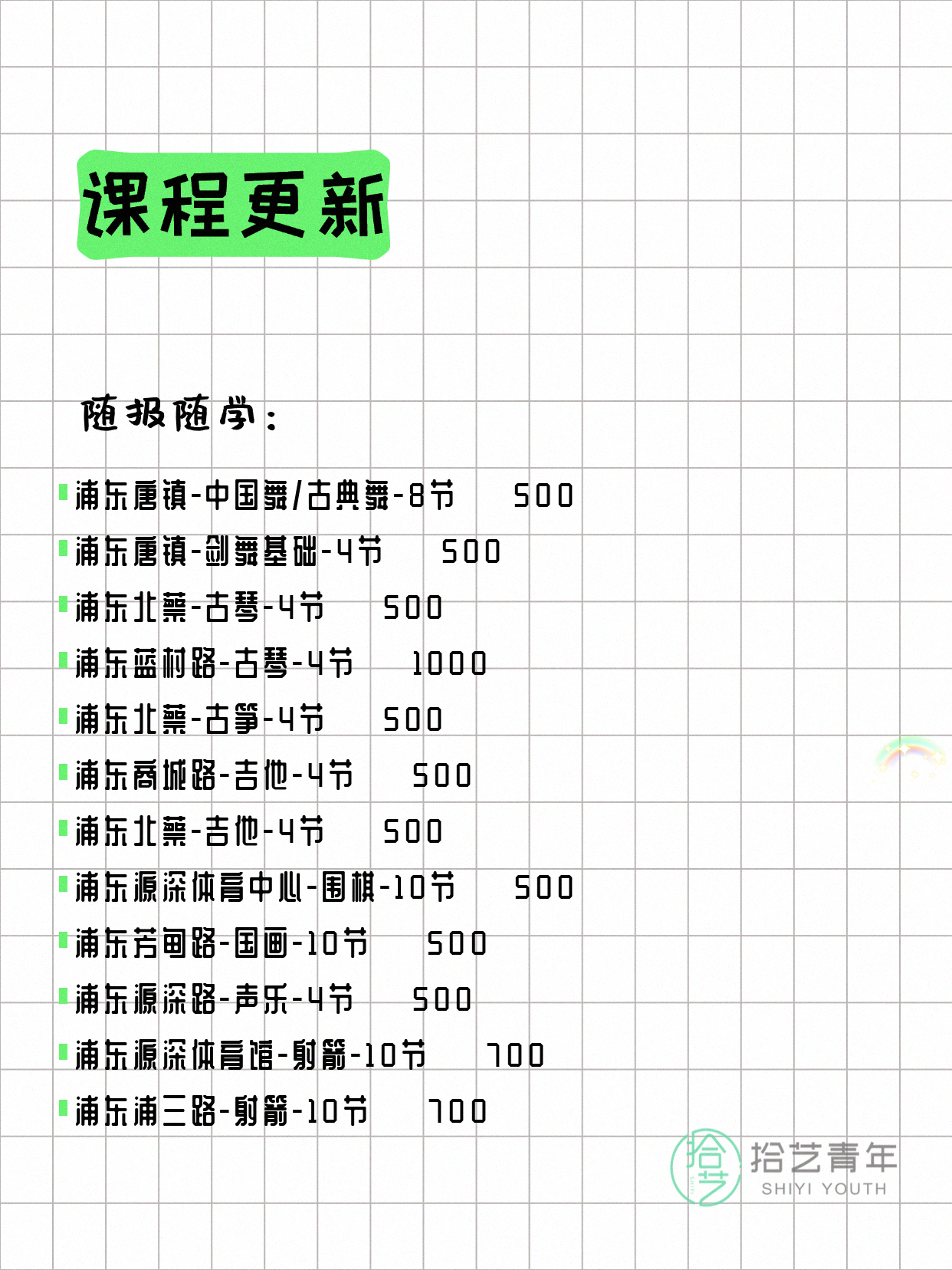 💡 提示:以上课程信息来自拾艺青年小程序,课程可能随报名动态变化,具体以小程序实时信息为准。