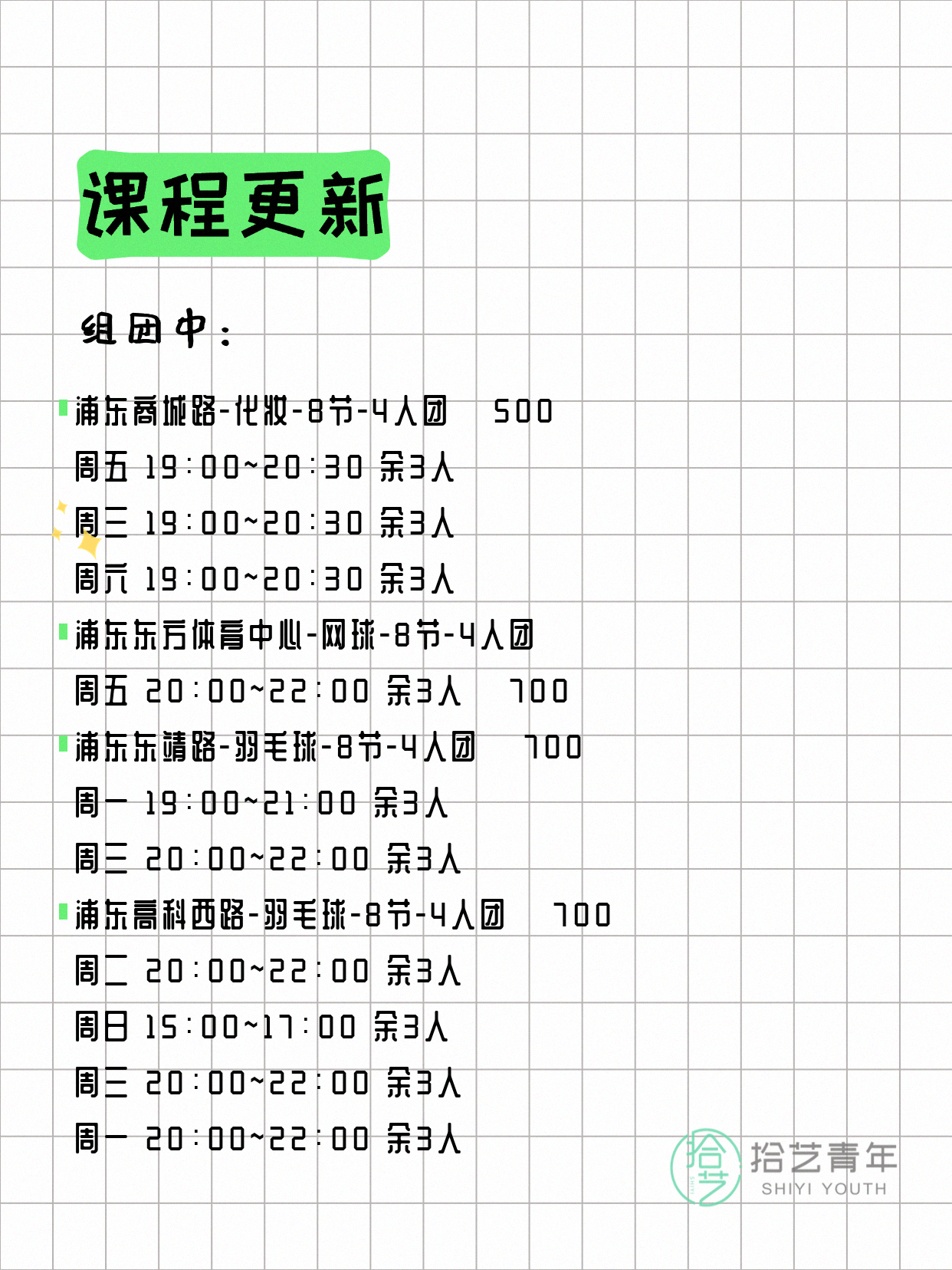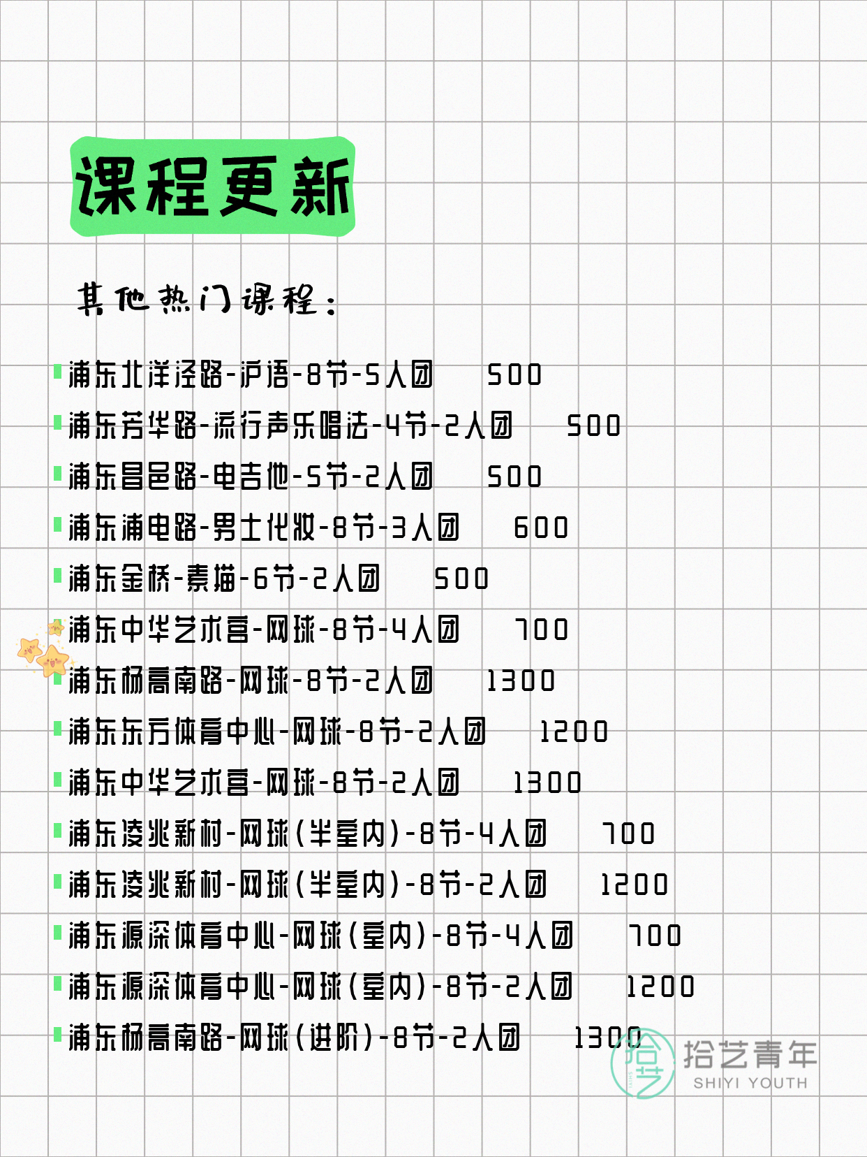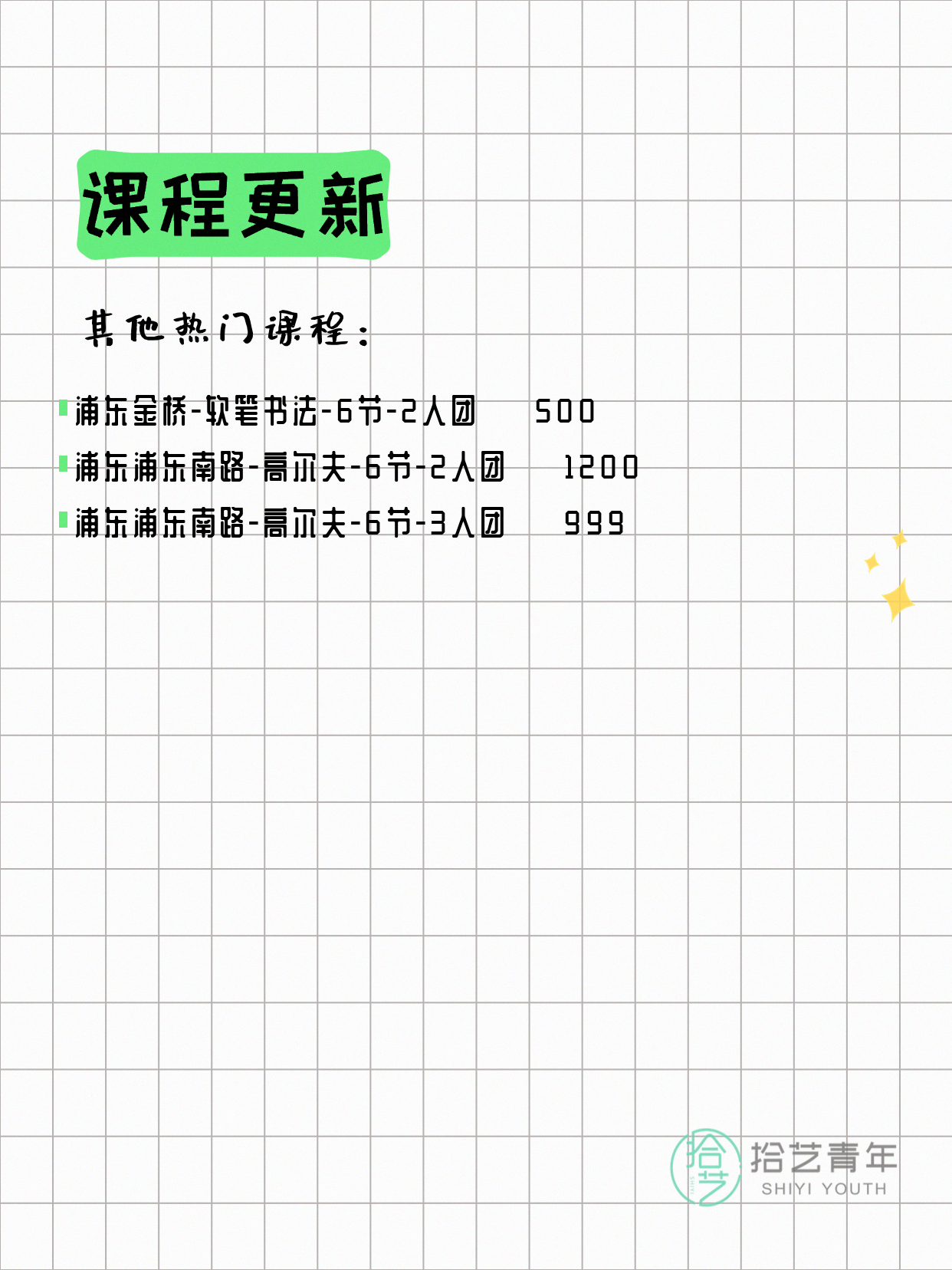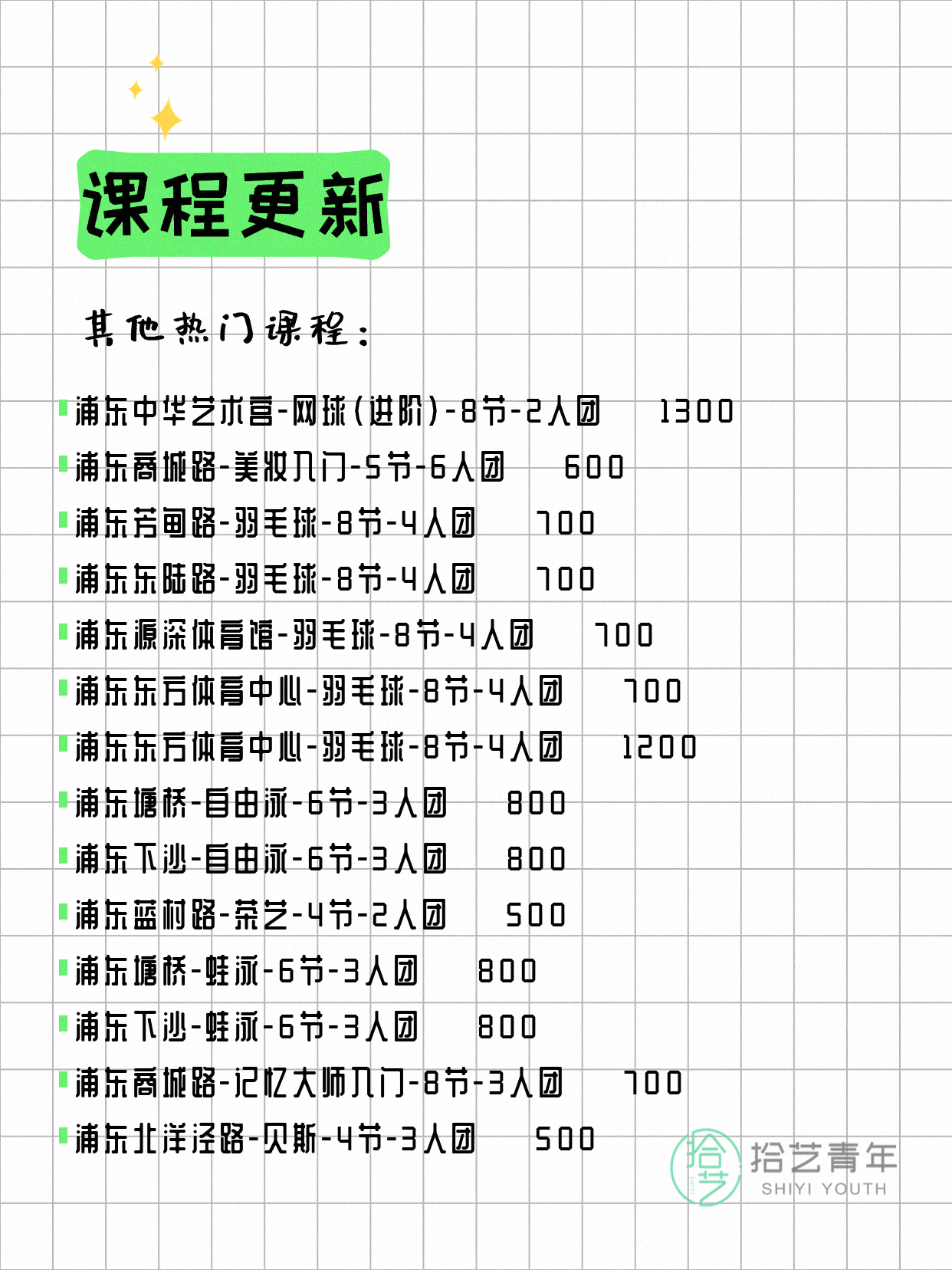 💡 提示:以上课程信息来自拾艺青年小程序,课程可能随报名动态变化,具体以小程序实时信息为准。