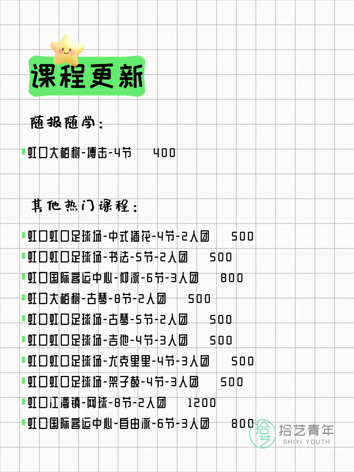 💡 提示:以上课程信息来自拾艺青年小程序,课程可能随报名动态变化,具体以小程序实时信息为准。