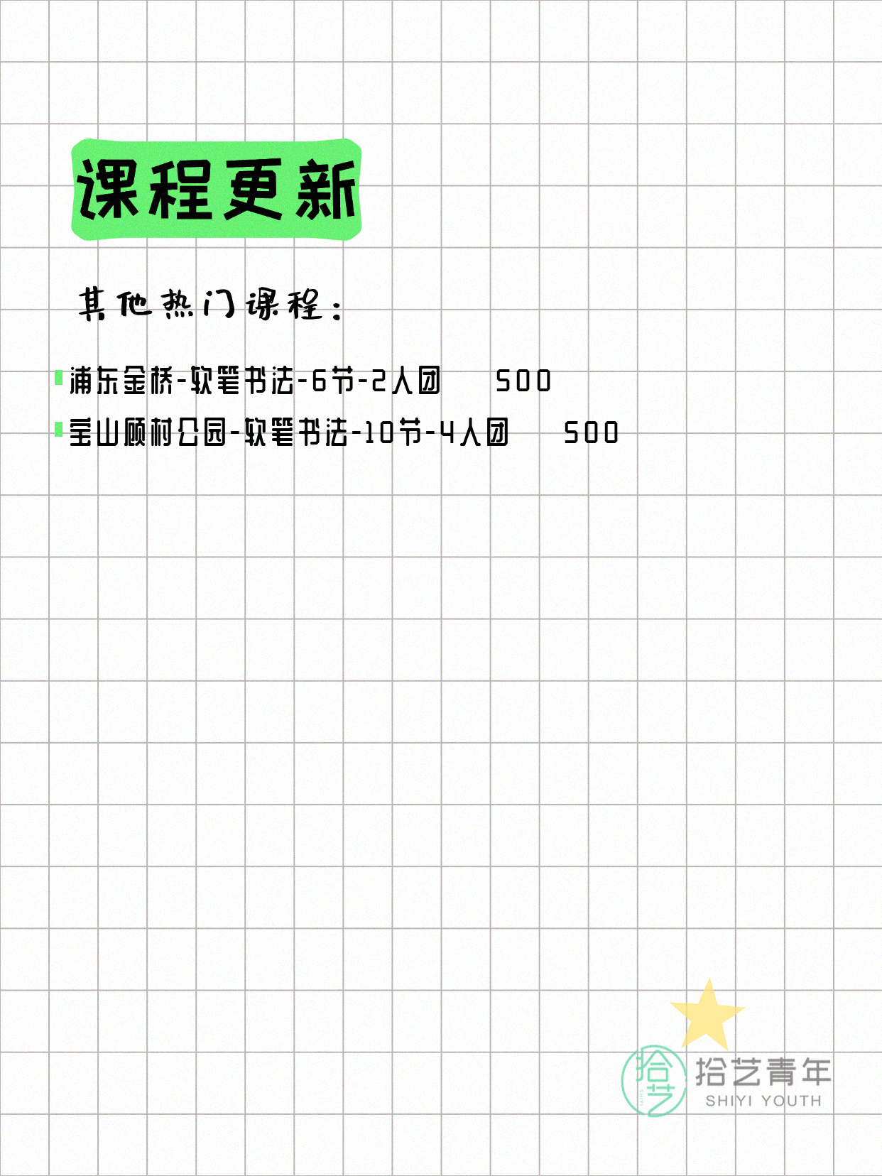 💡 提示:以上课程信息来自拾艺青年小程序,课程可能随报名动态变化,具体以小程序实时信息为准。