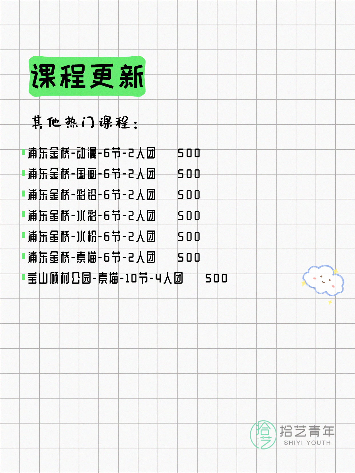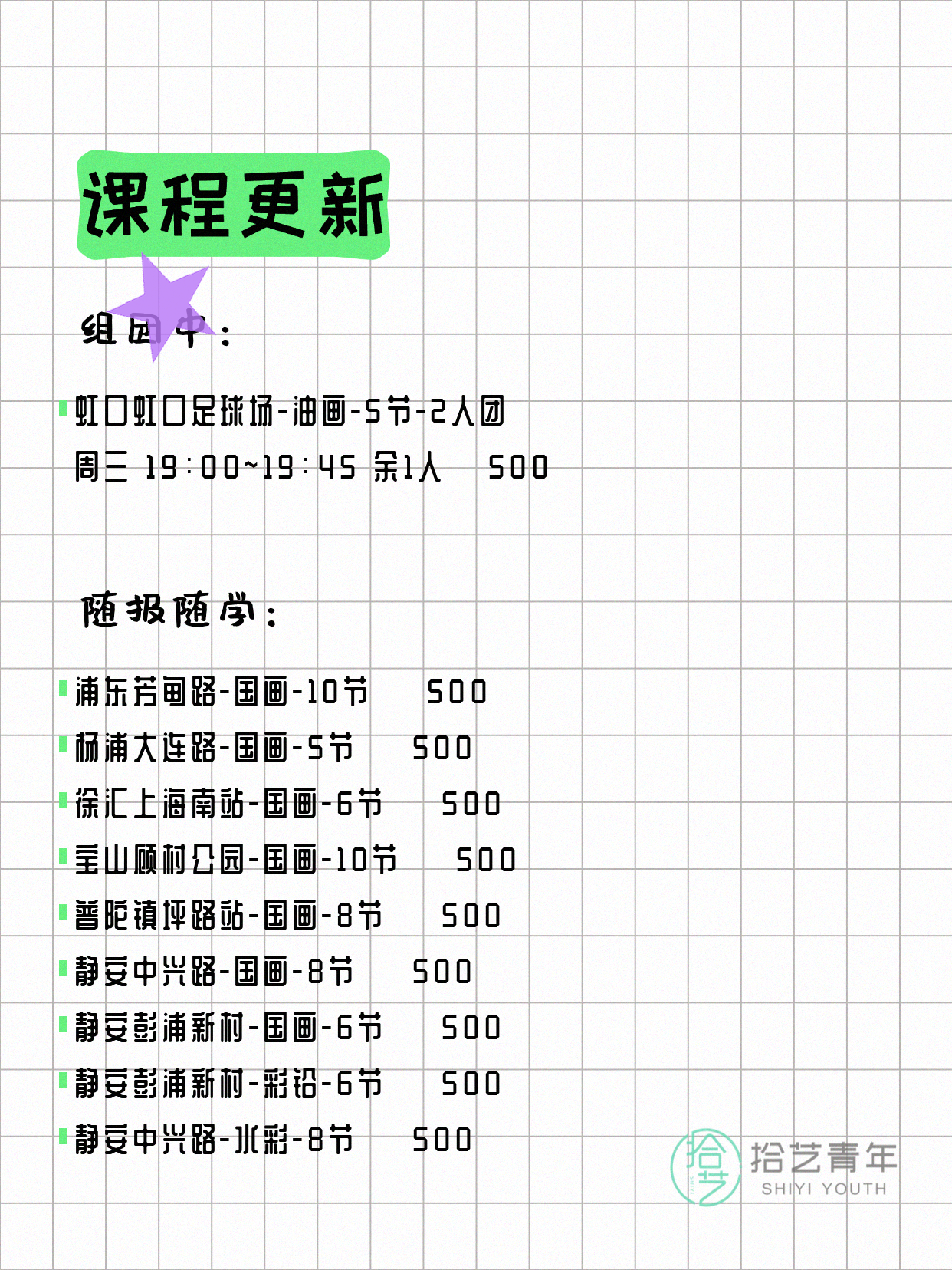 💡 提示:以上课程信息来自拾艺青年小程序,课程可能随报名动态变化,具体以小程序实时信息为准。