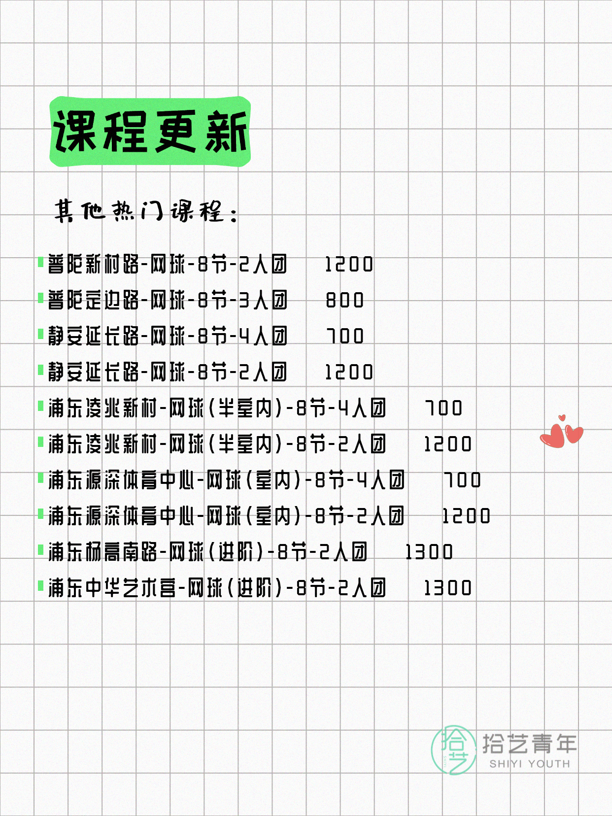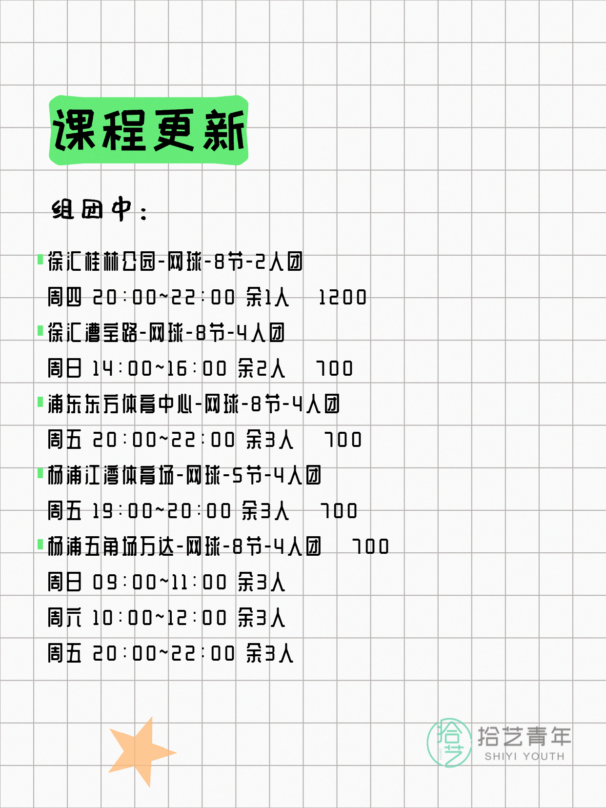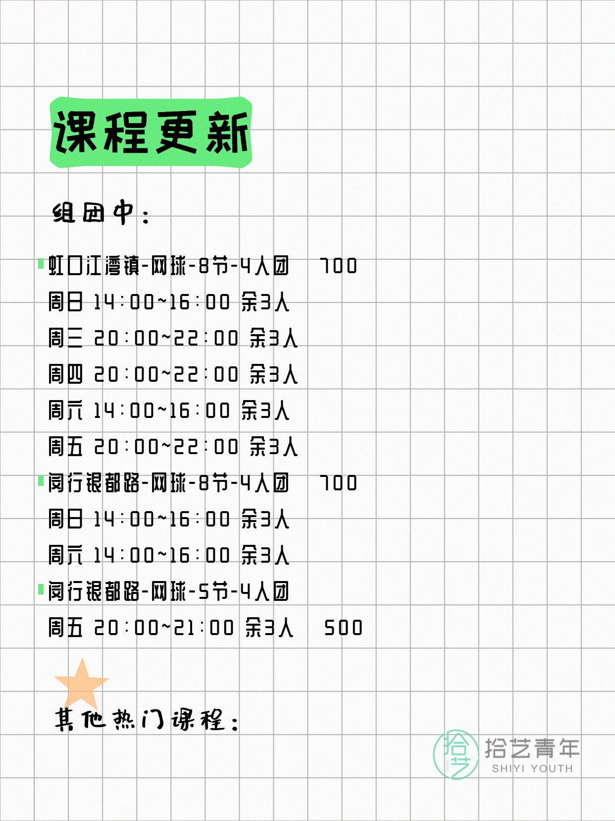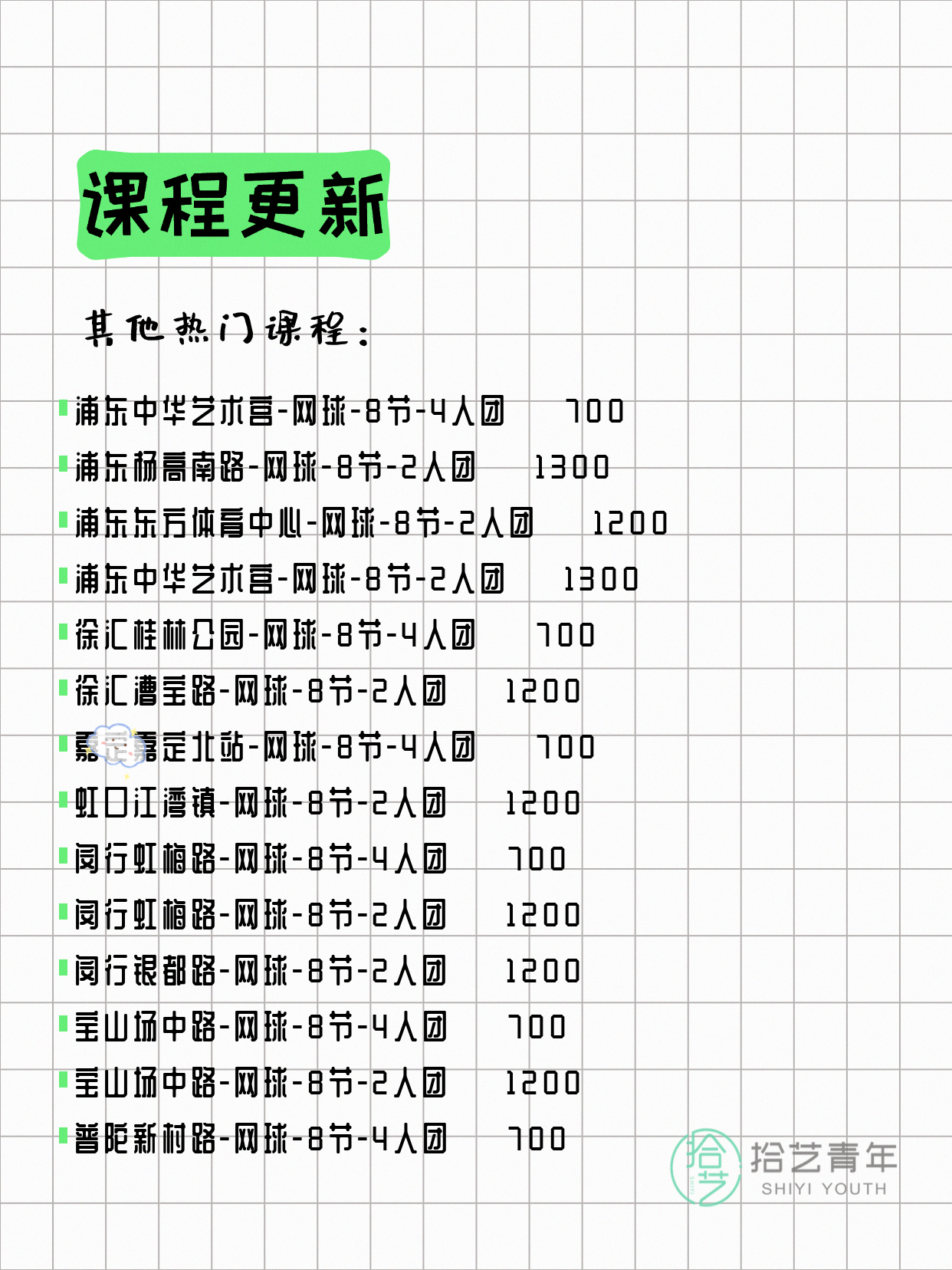💡 提示:以上课程信息来自拾艺青年小程序,课程可能随报名动态变化,具体以小程序实时信息为准。