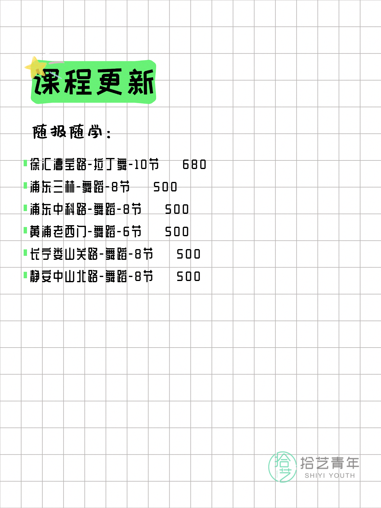 💡 提示:以上课程信息来自拾艺青年小程序,课程可能随报名动态变化,具体以小程序实时信息为准。