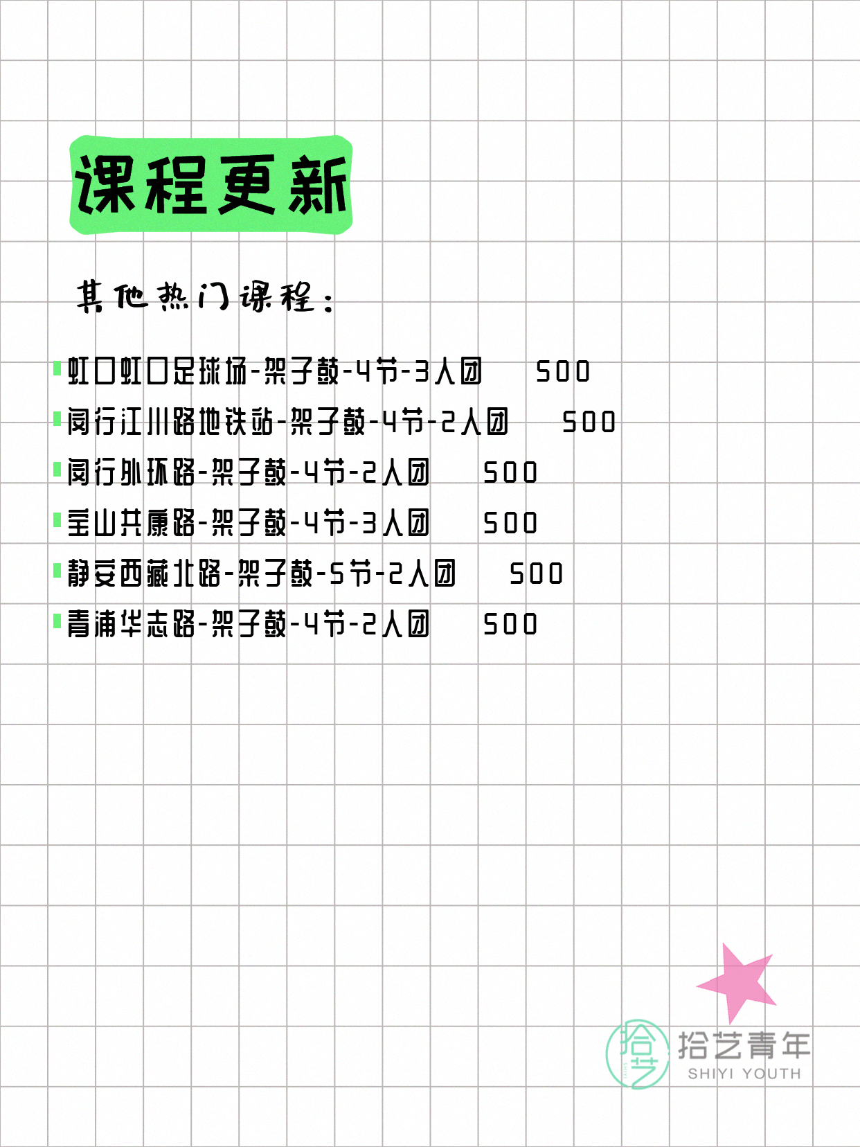 💡 提示:以上课程信息来自拾艺青年小程序,课程可能随报名动态变化,具体以小程序实时信息为准。