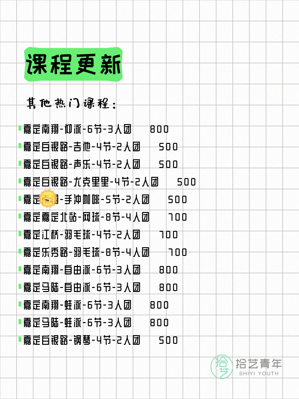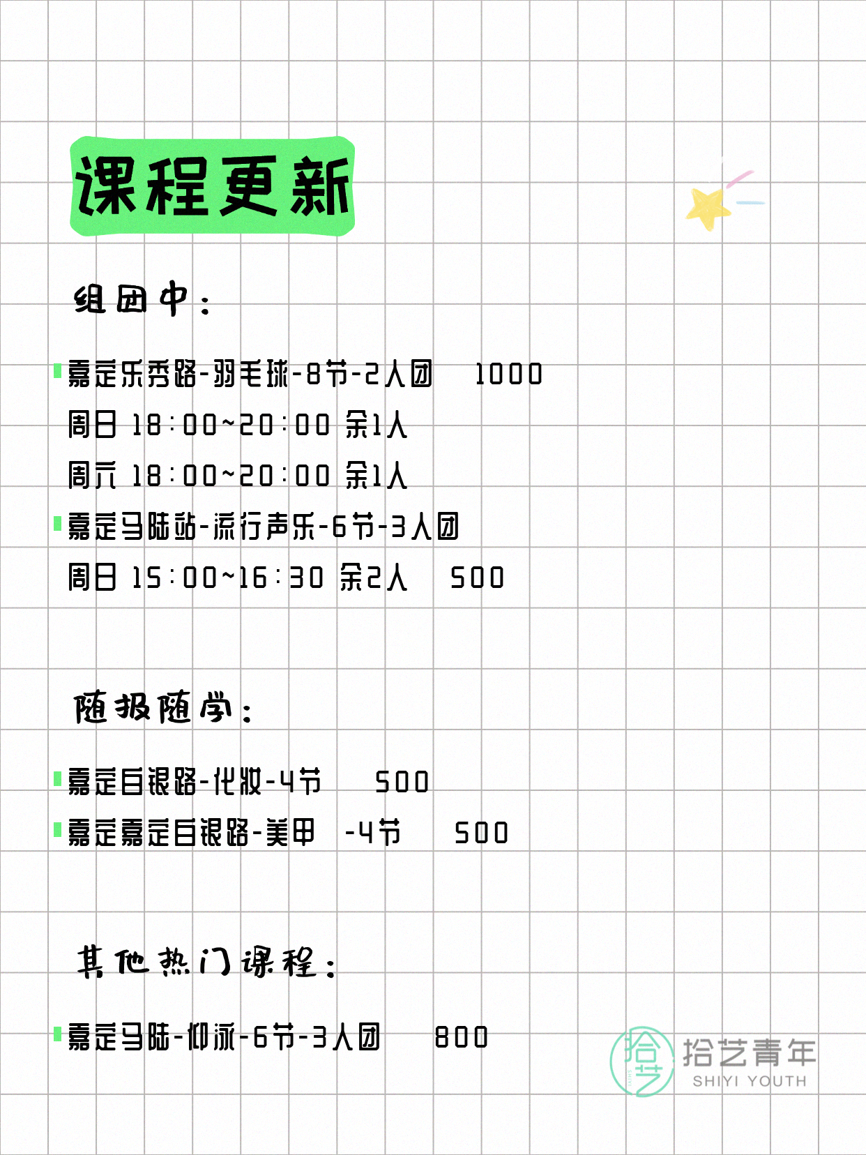 💡 提示:以上课程信息来自拾艺青年小程序,课程可能随报名动态变化,具体以小程序实时信息为准。