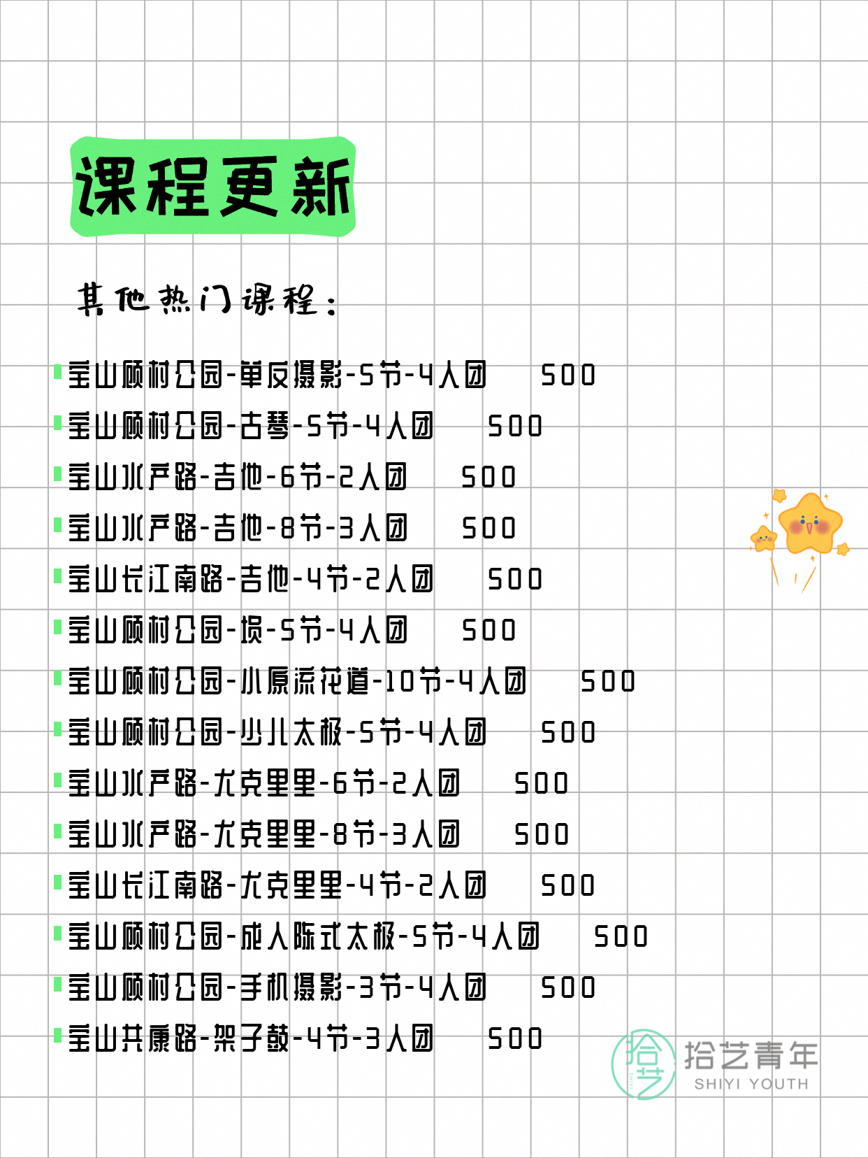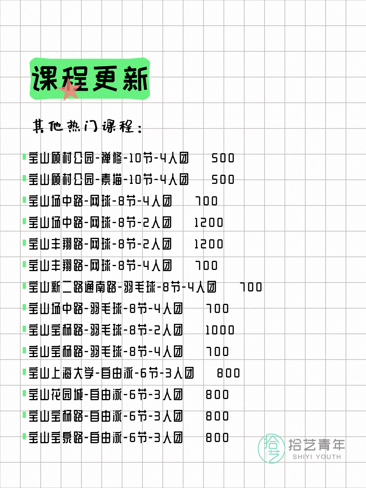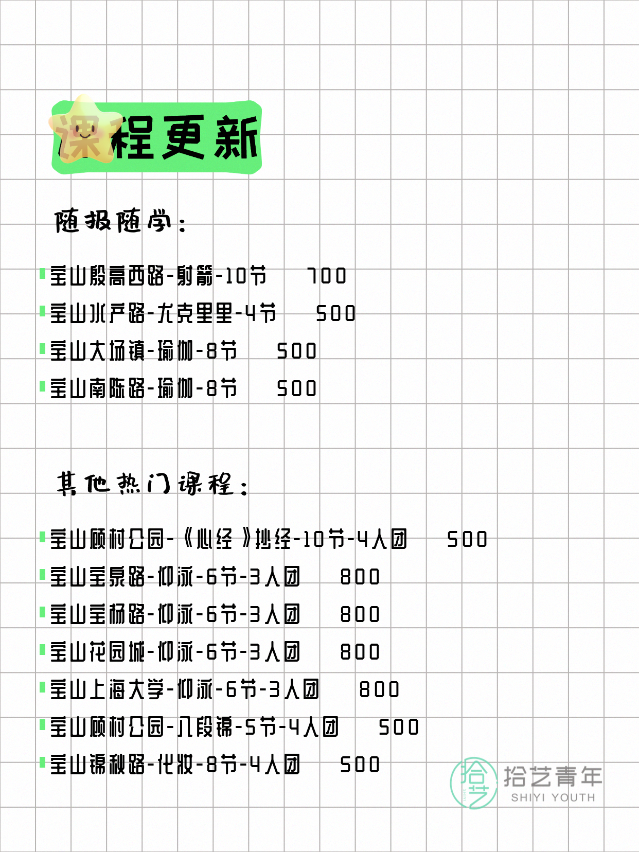 💡 提示:以上课程信息来自拾艺青年小程序,课程可能随报名动态变化,具体以小程序实时信息为准。