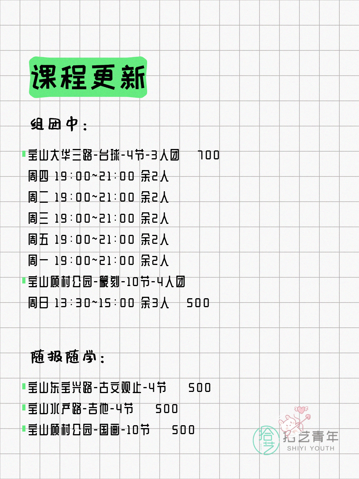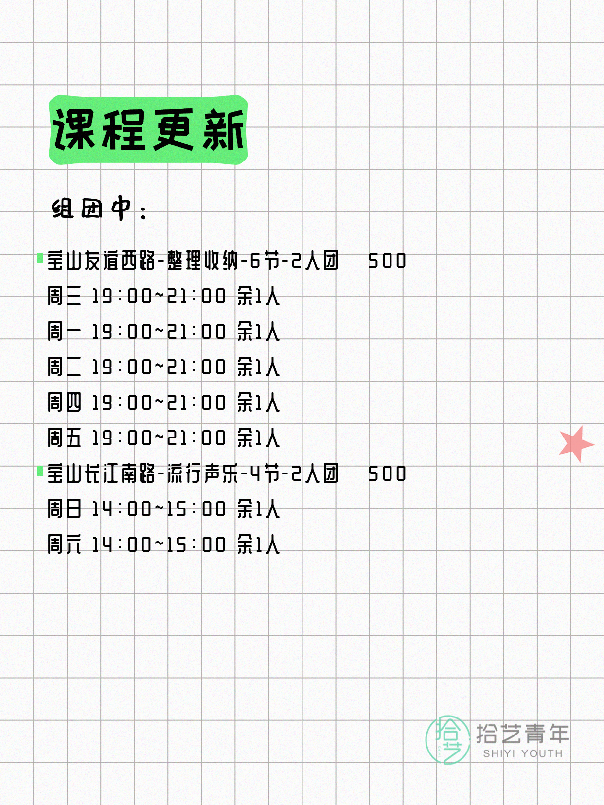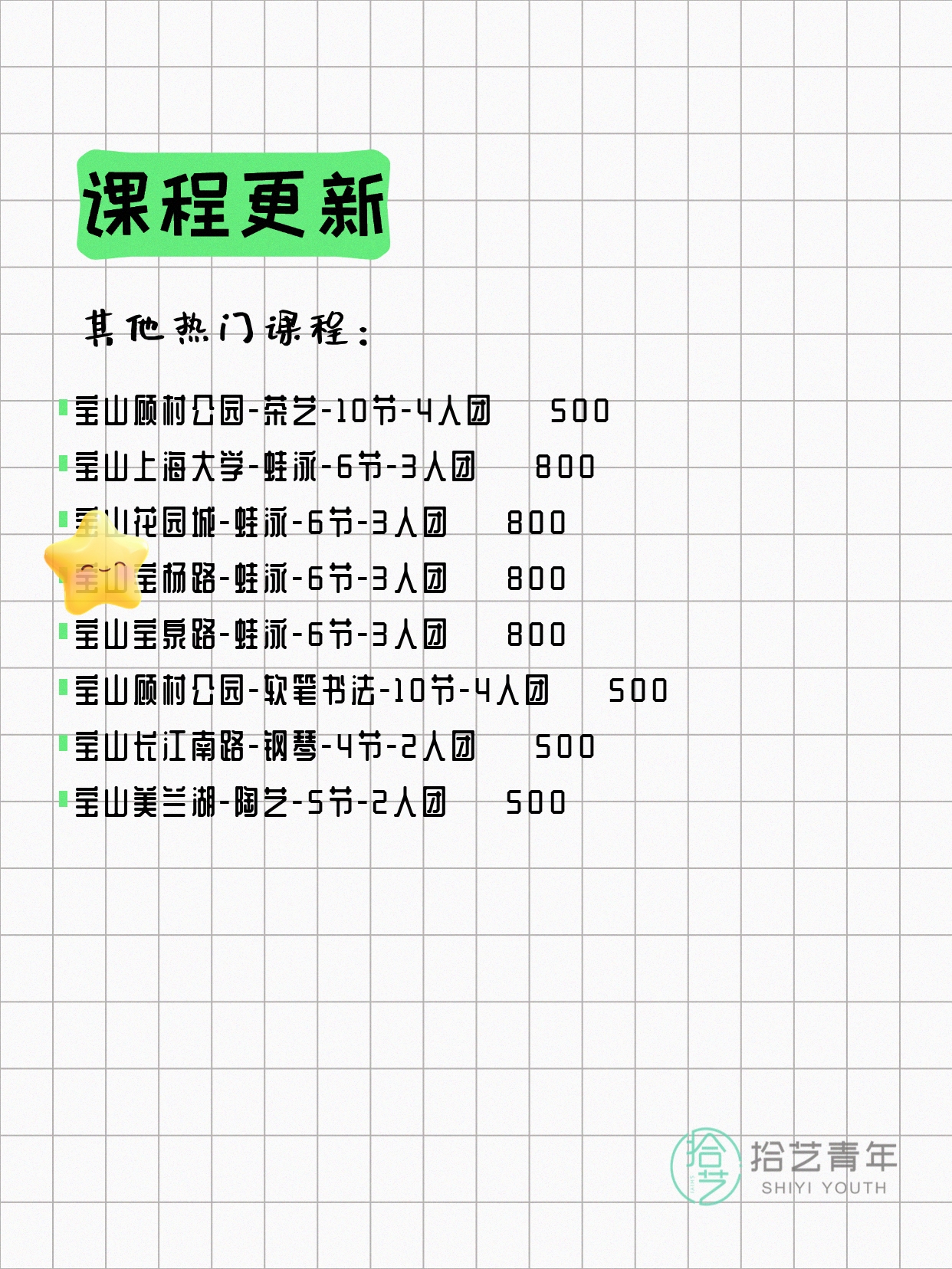 💡 提示:以上课程信息来自拾艺青年小程序,课程可能随报名动态变化,具体以小程序实时信息为准。
