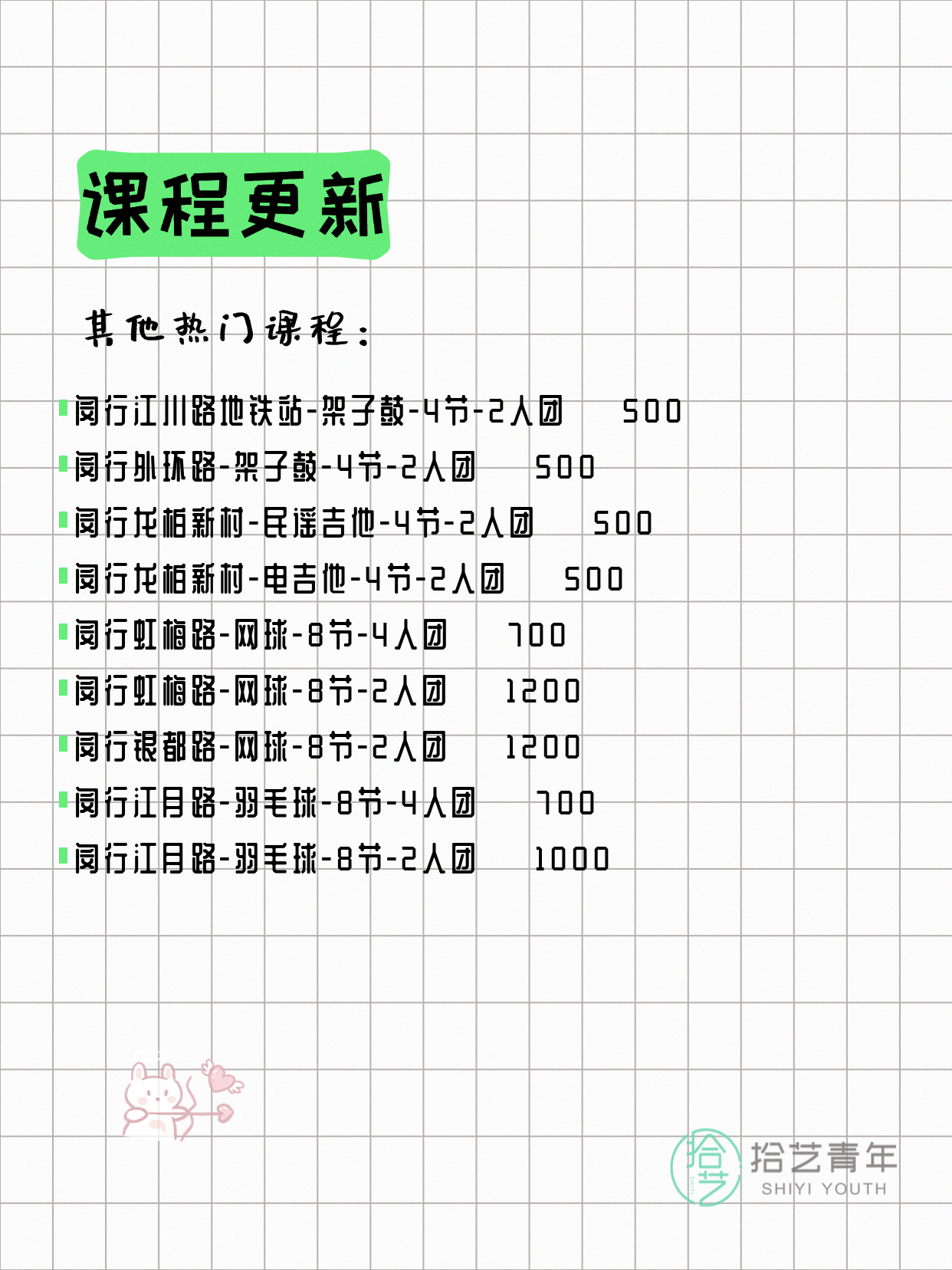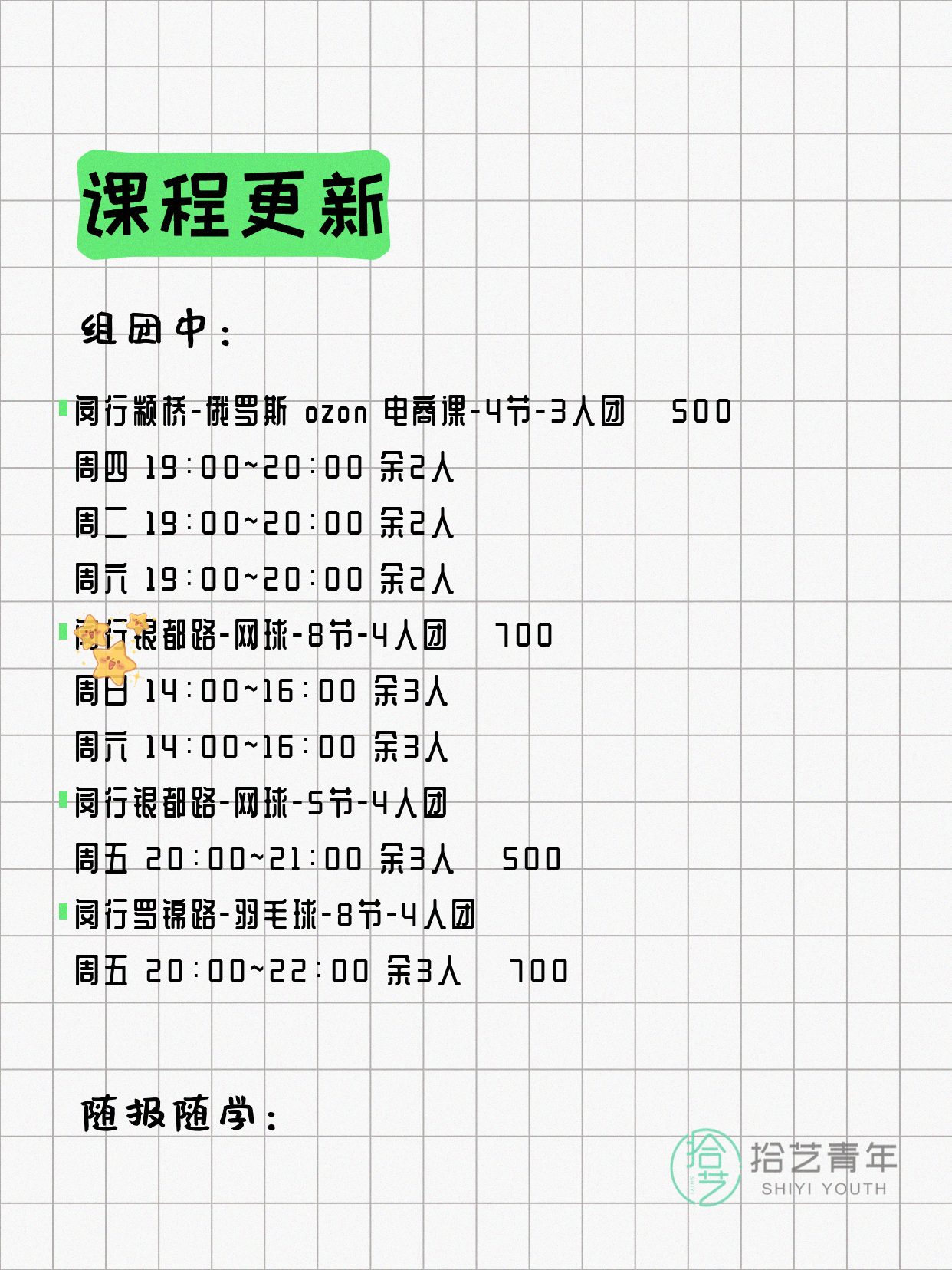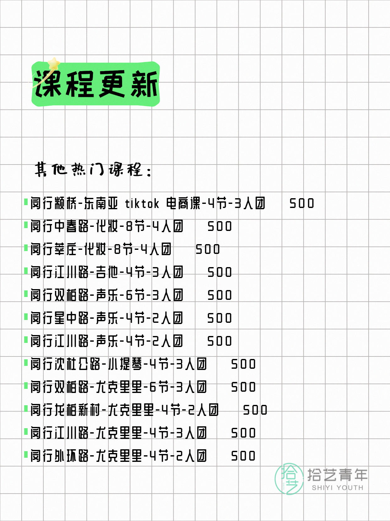 💡 提示:以上课程信息来自拾艺青年小程序,课程可能随报名动态变化,具体以小程序实时信息为准。