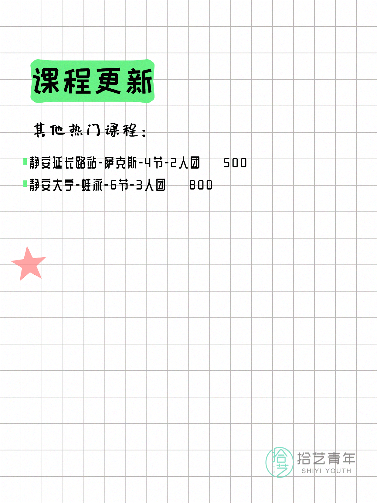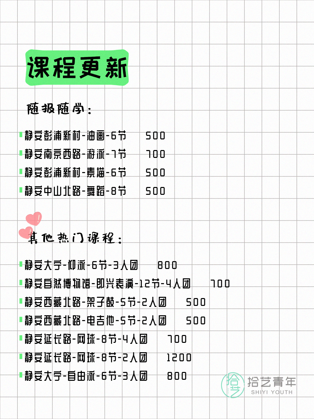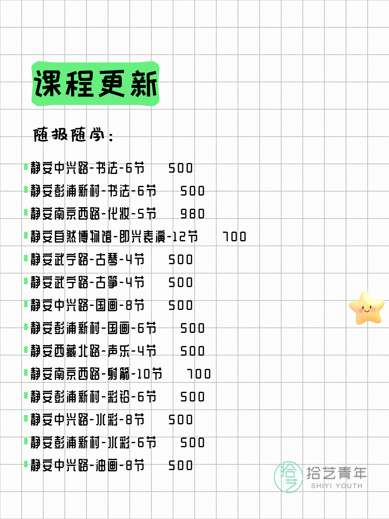 💡 提示:以上课程信息来自拾艺青年小程序,课程可能随报名动态变化,具体以小程序实时信息为准。