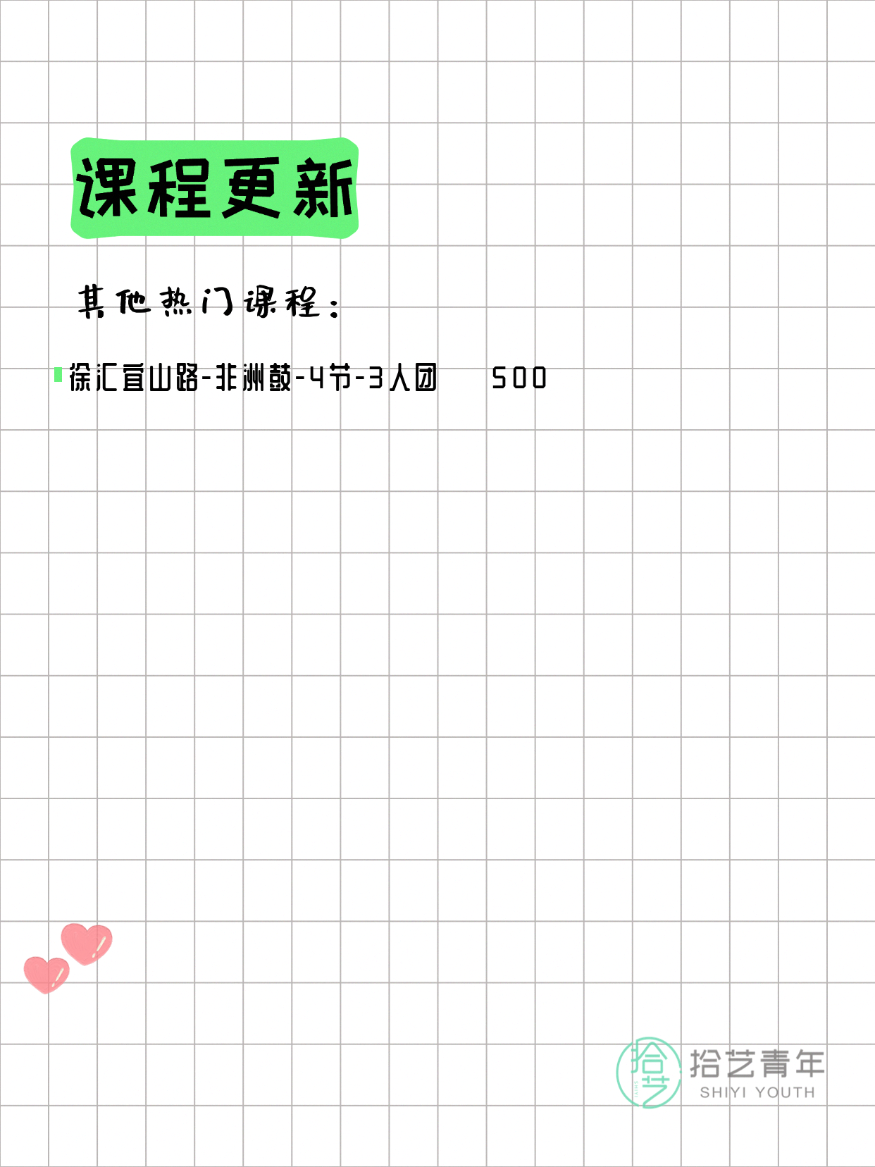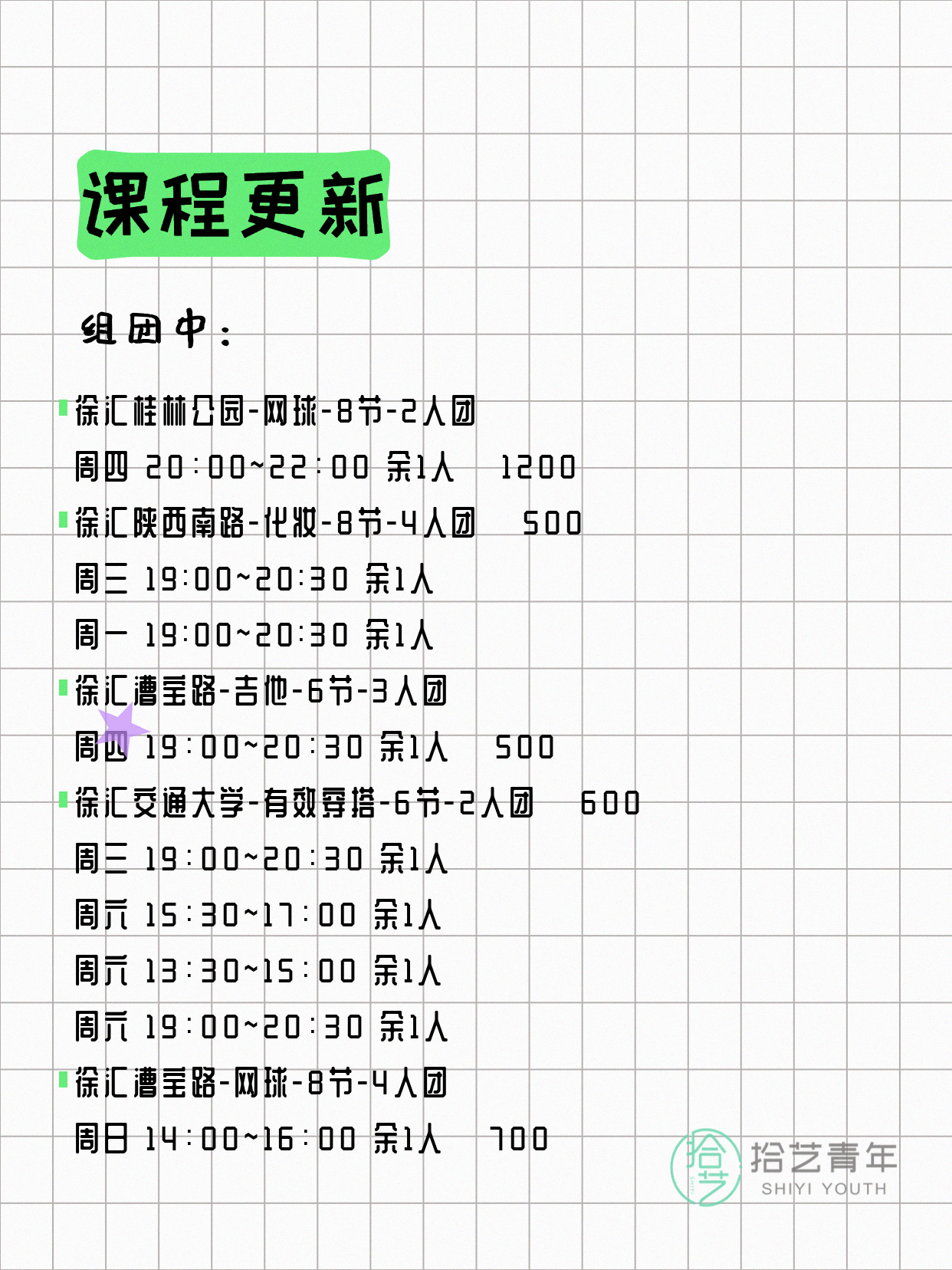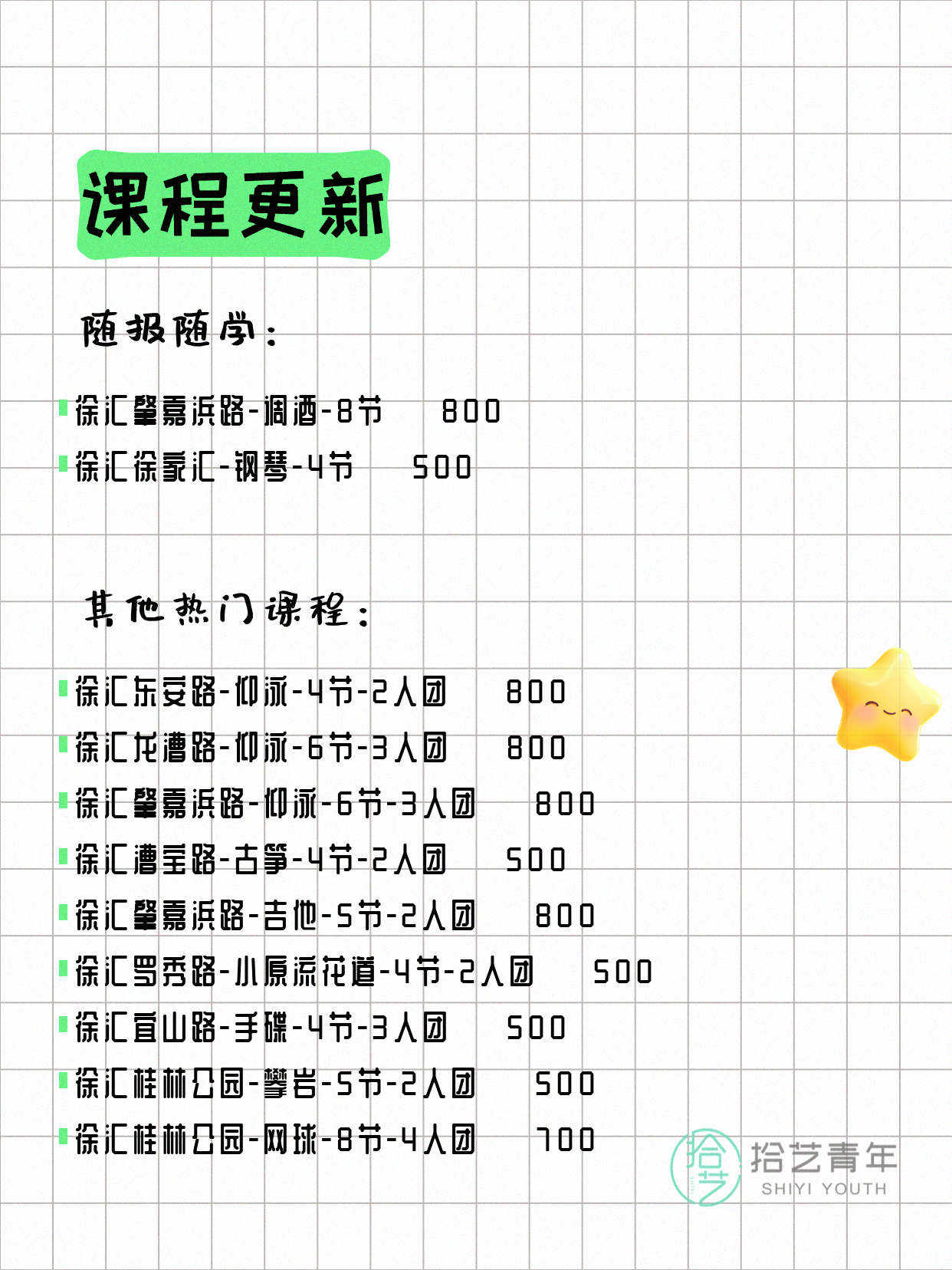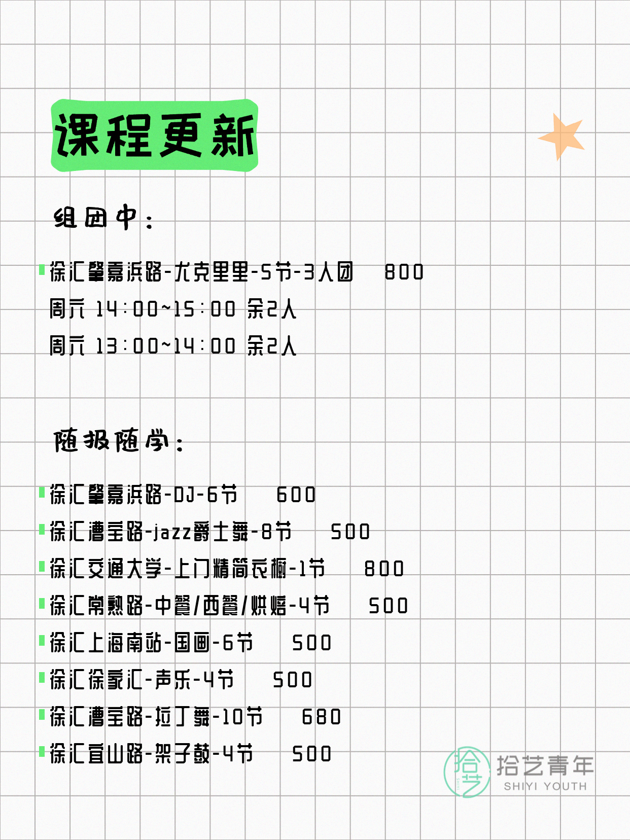 💡 提示:以上课程信息来自拾艺青年小程序,课程可能随报名动态变化,具体以小程序实时信息为准。