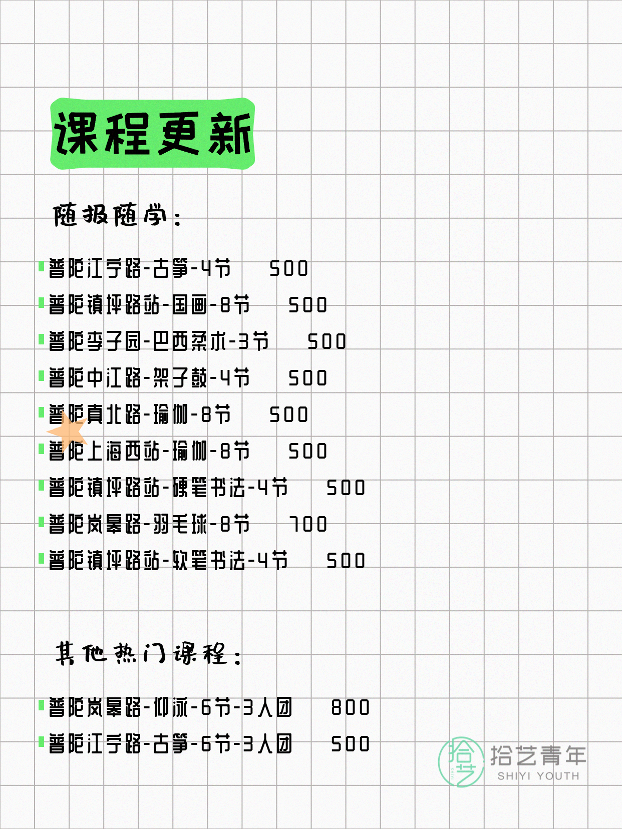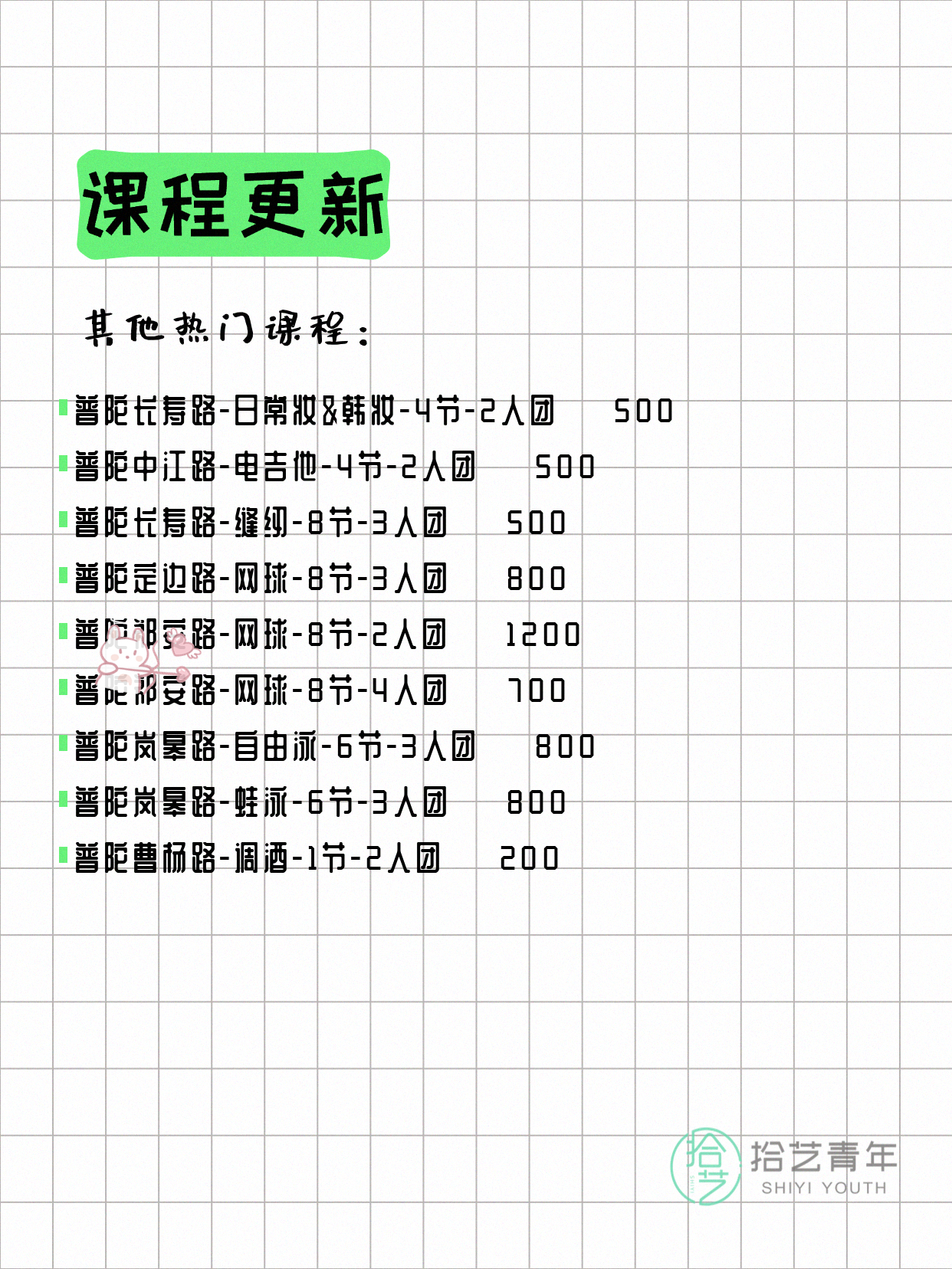 💡 提示:以上课程信息来自拾艺青年小程序,课程可能随报名动态变化,具体以小程序实时信息为准。