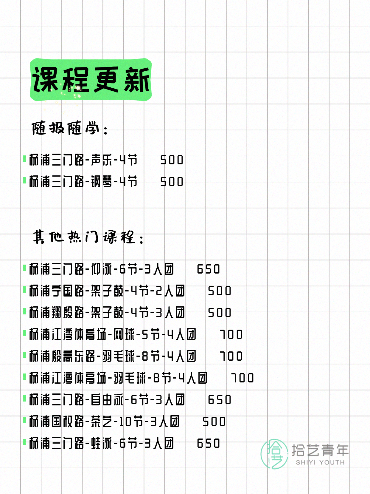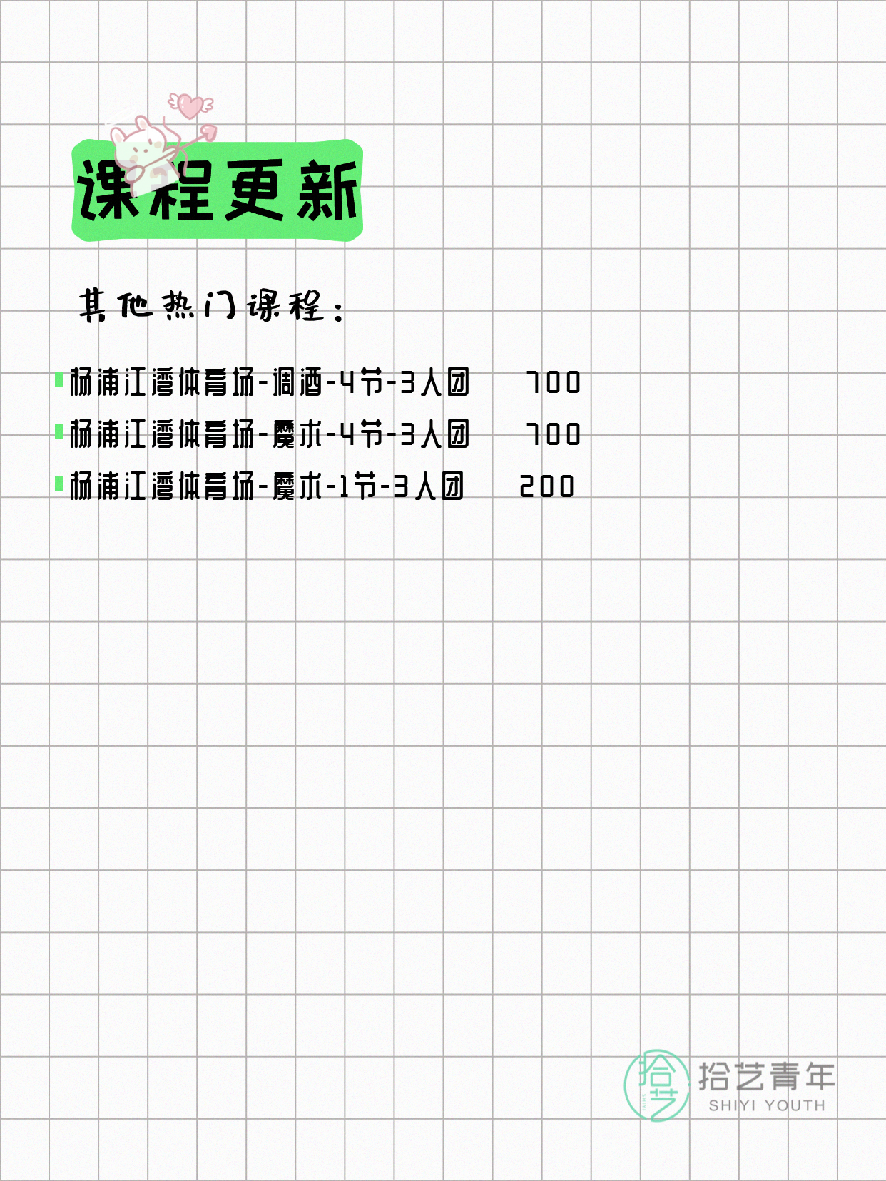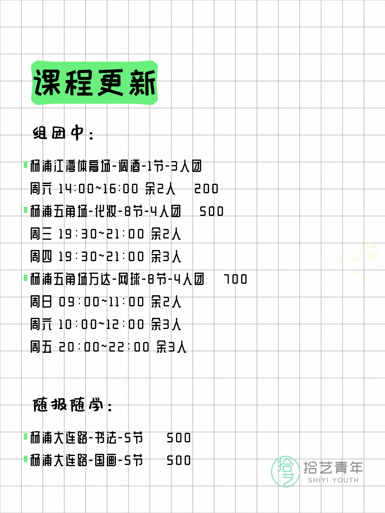 💡 提示:以上课程信息来自拾艺青年小程序,课程可能随报名动态变化,具体以小程序实时信息为准。