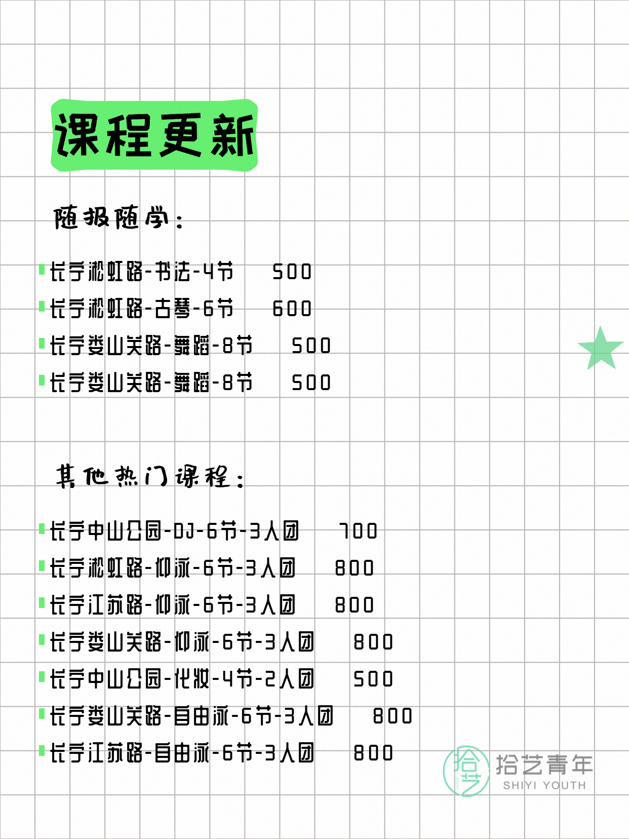 💡 提示:以上课程信息来自拾艺青年小程序,课程可能随报名动态变化,具体以小程序实时信息为准。