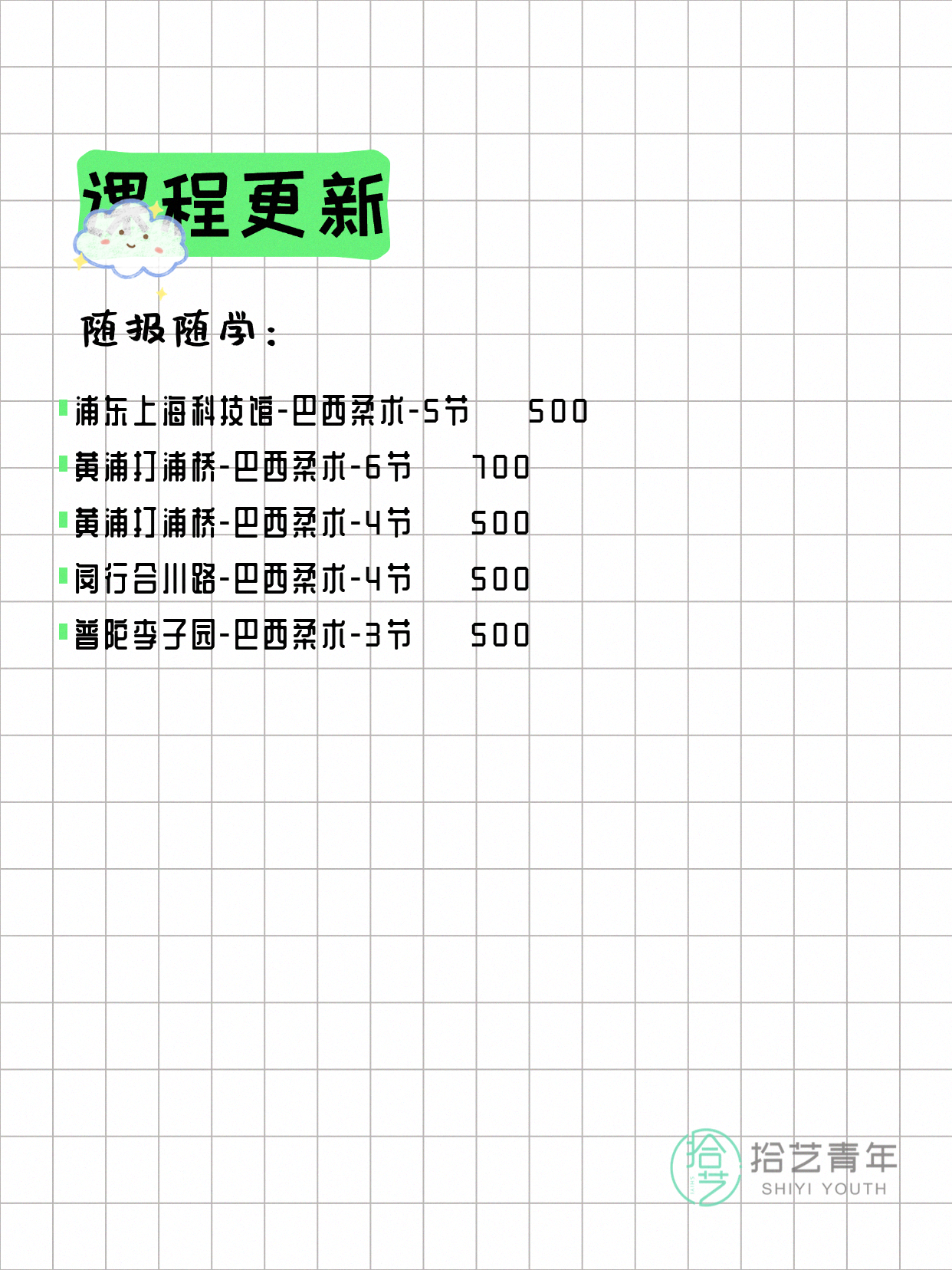 💡 提示:以上课程信息来自拾艺青年小程序,课程可能随报名动态变化,具体以小程序实时信息为准。