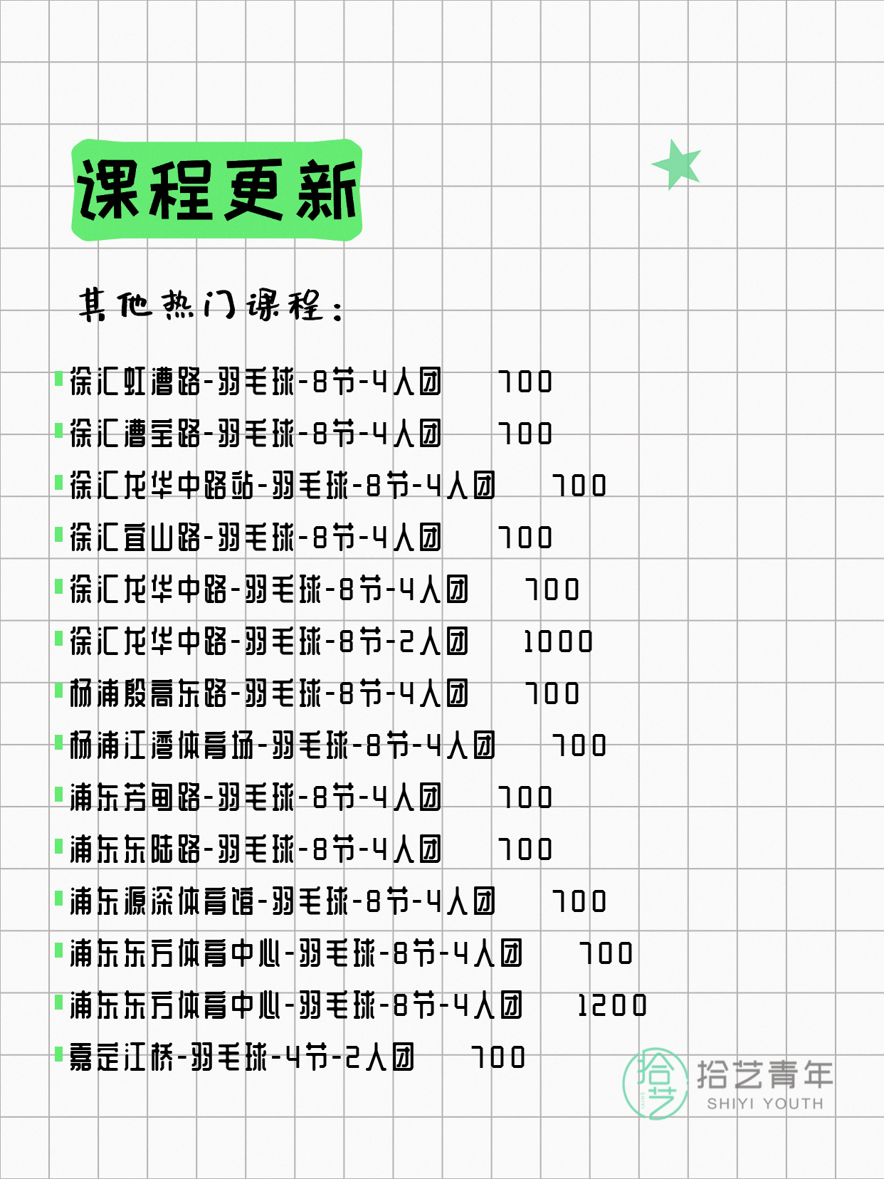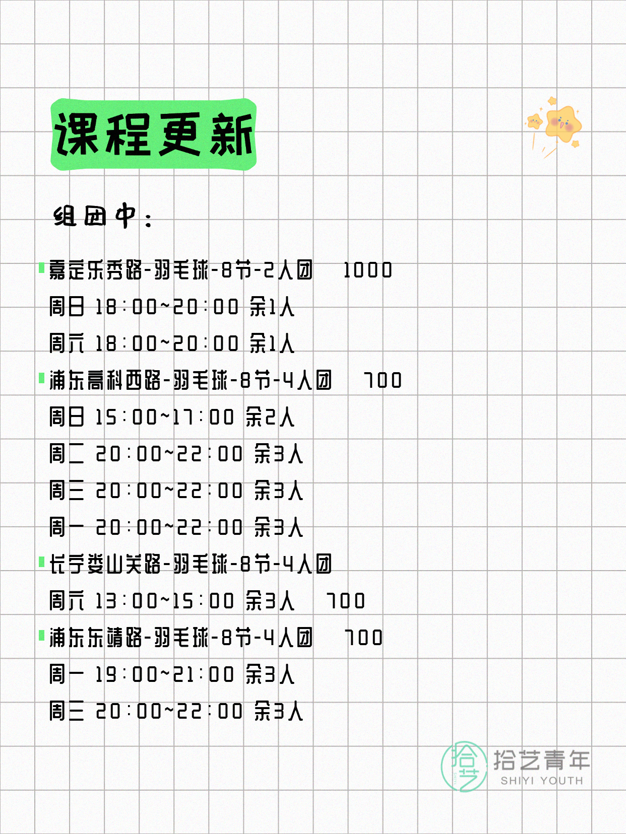 ⭐ 羽毛球-杨浦江湾体育场-8节-4人团 💰700