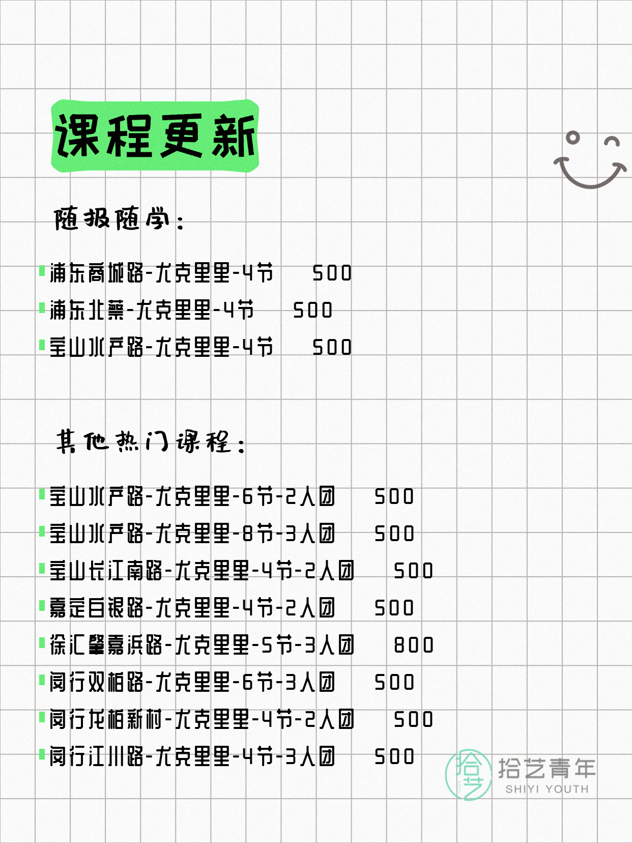 💡 提示:以上课程信息来自拾艺青年小程序,课程可能随报名动态变化,具体以小程序实时信息为准。